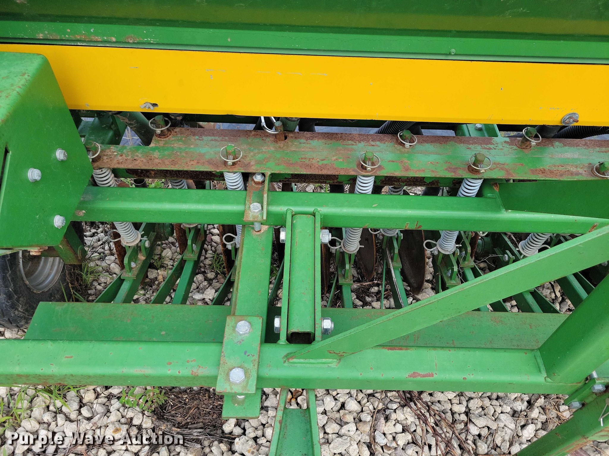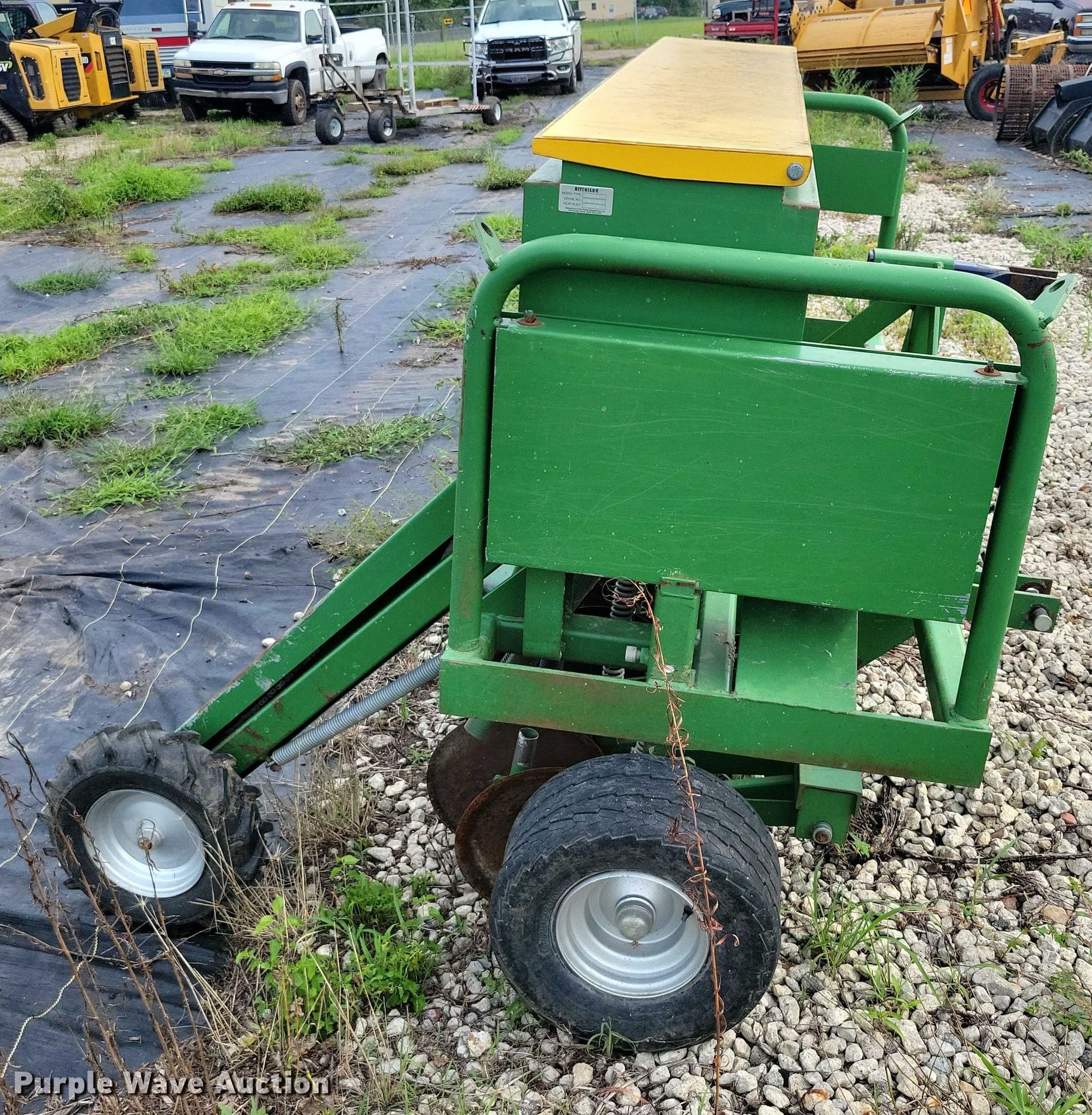 2008 Aitchison Grass Farmer grain drill. Row units: 14, Row spacing: 5", Serial: A10904. Features Frame Hitch: Three point, Seed delivery Bulk fill system, Row units Meter drive: Ground. Tires Transport tire size: 18.5X8.5. DMF Gardens. Des Moines, IA 50316
