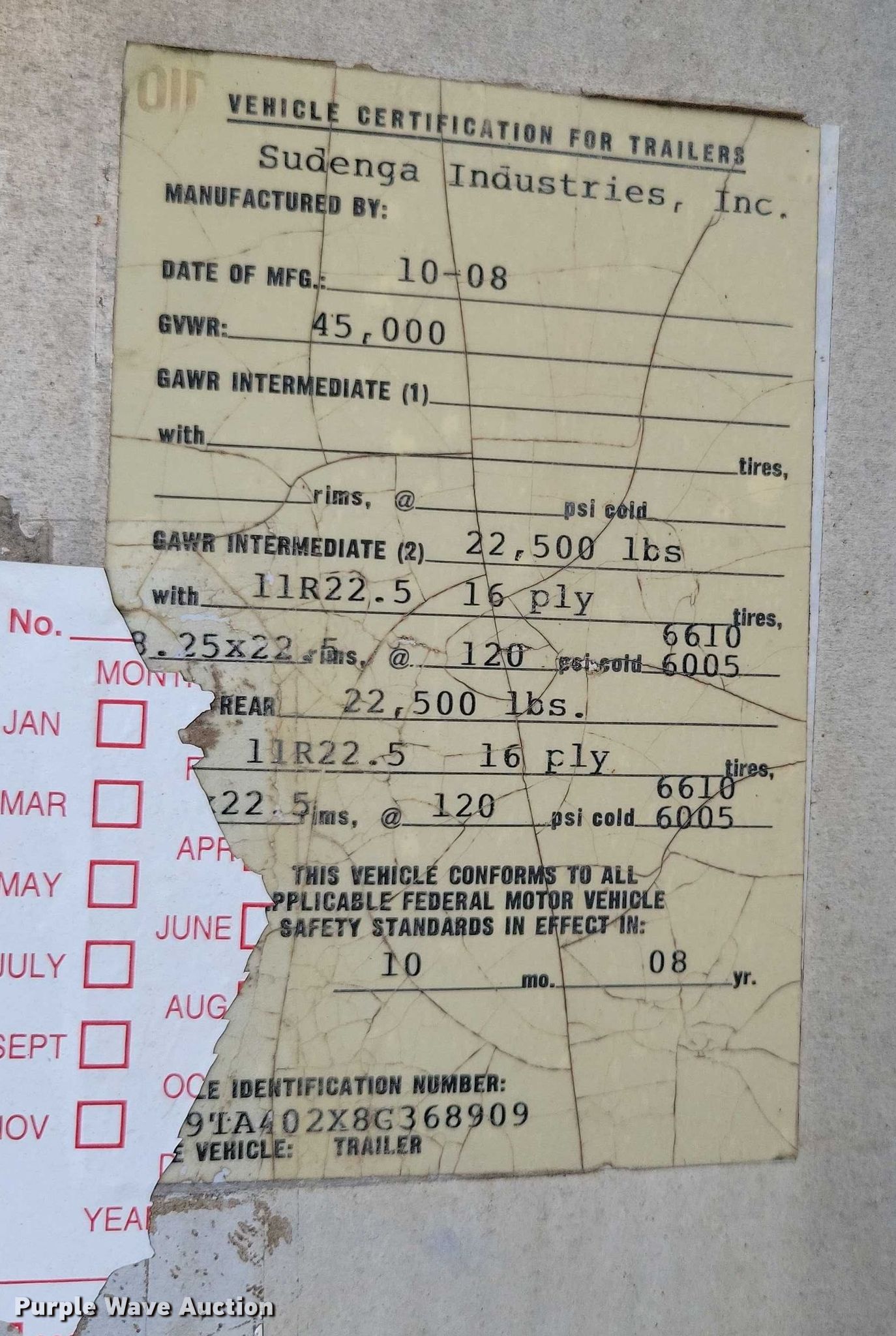 2008 Sudenga fertilizer delivery trailer. VIN: 1S9TA402X8G368909. Dimensions Overall Length: 44', Width: 96", Body Length: 40', Width: 96". Features Body type: Aluminum, Compartments: 8, Roll tarp, Discharge auger Length: 31'. Chassis Landing gear: Dual, Suspension: Air, Brakes: Air, Axles: Tandem, GVWR: 45,000 lbs, GAWR: 22,500 lbs. Tires Aluminum wheels, Size: 11R22.5. Notes Brake issues, one brake locked up. Iowa title. Title distribution may be delayed up to 14 days from verification of funds. Stateline Cooperative. Swea City, IA 50590