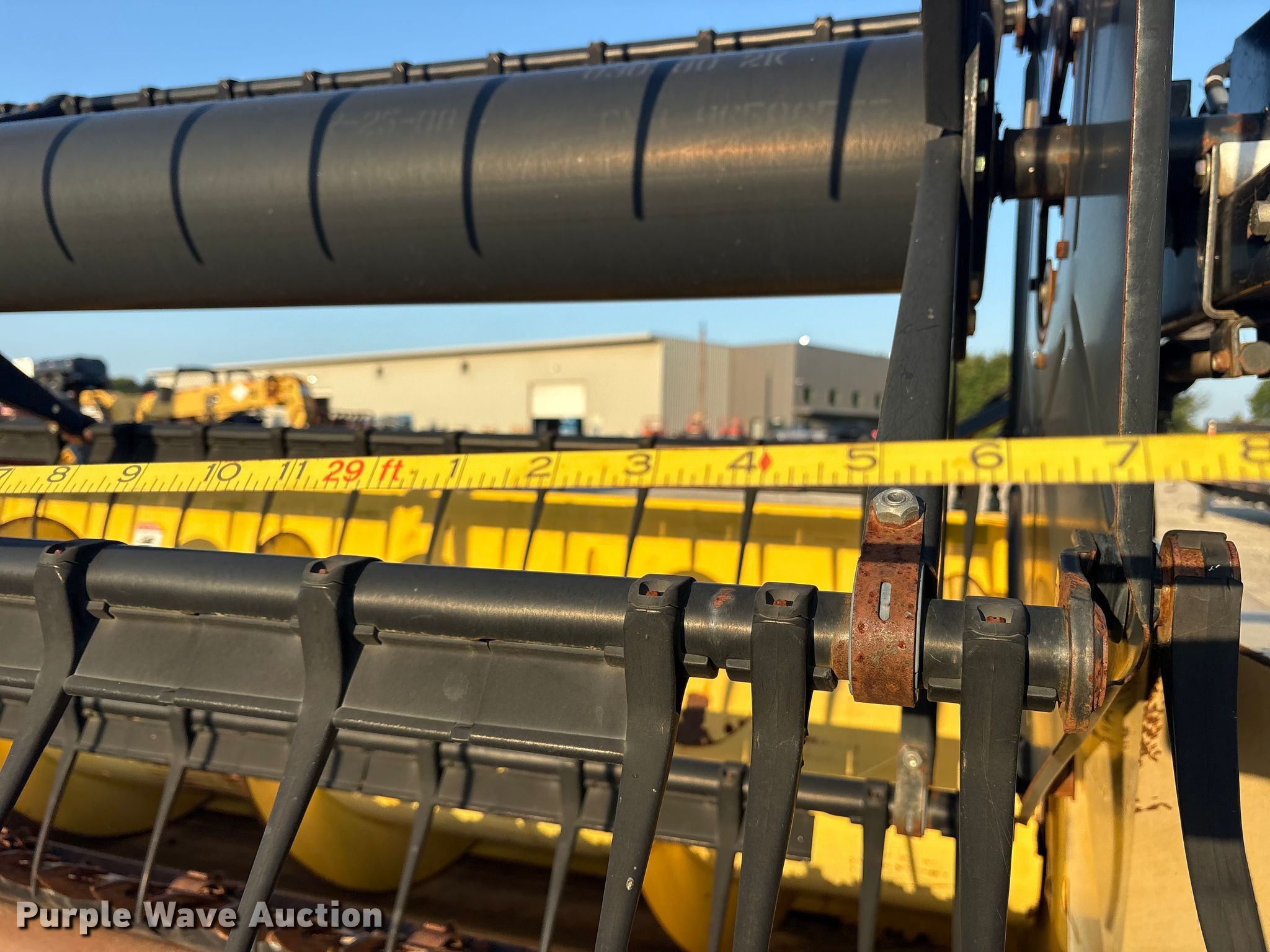 New Holland 74C rigid head. Serial: PNL023128. Features Width: 30', Reel: Finger Hydraulic reel height control, Drivelines: Dual, PTO: 540. Tires Tire size: 11L-15. Trailer Hitch: Pin, Length: 37', Suspension: Torsion, Tire size: 11L-15SL. Brookston, TX 75421