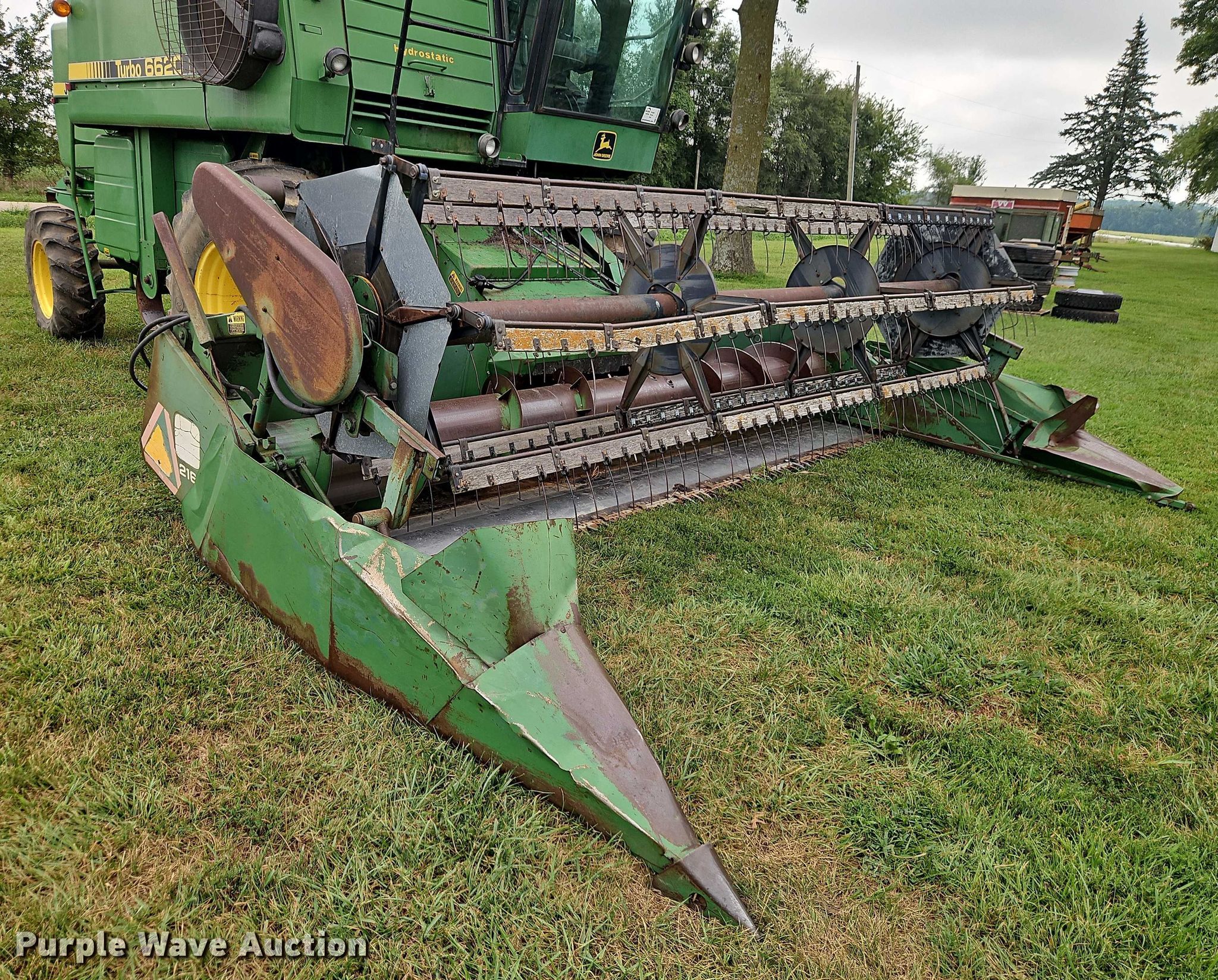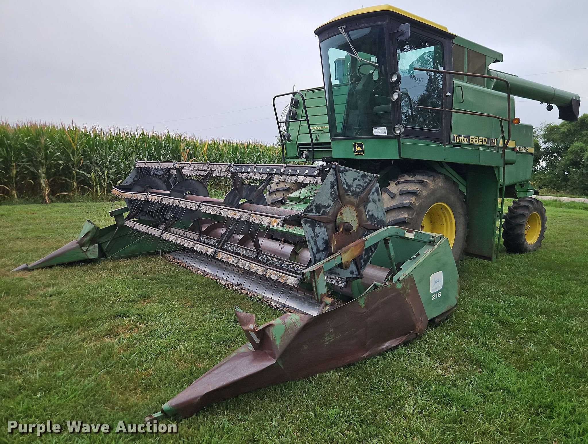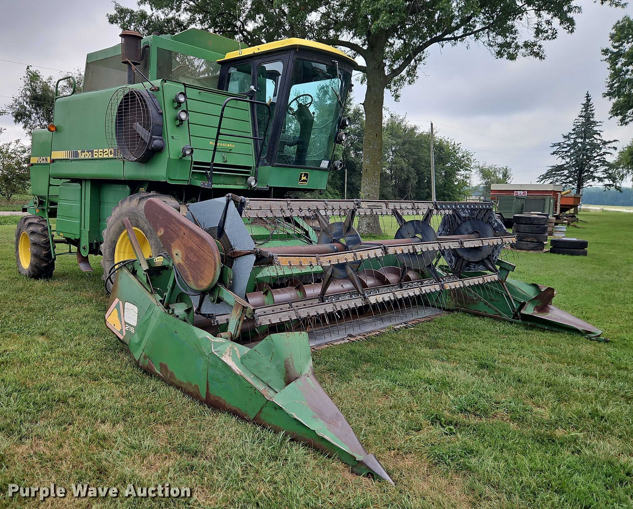 1981 John Deere 6620 combine. Engine hours: 2,865 on meter, Serial: 456494. Engine John Deere 6466, Serial: 6466TH-01 194686RG, Cylinders: 6, Fuel type: Diesel. Transmission Hydrostatic. Operators station AC, Heat. Features Feederhouse: Reverser, Concaves: Small wire, Straw chopper, Unloading auger length: 14', Header John Deere 216, Serial: 374358H, Platform head Rigid, Width: 16', Reel: Finger Hydraulic reel height control, Skid plates: Poly, Drivelines: Dual. Tires Front: 24.5-32, Rear: 14.9-24. Notes Hydraulic leak, Non-operational AC. Gudenkauf Farms. Blairstown, MO 64726
