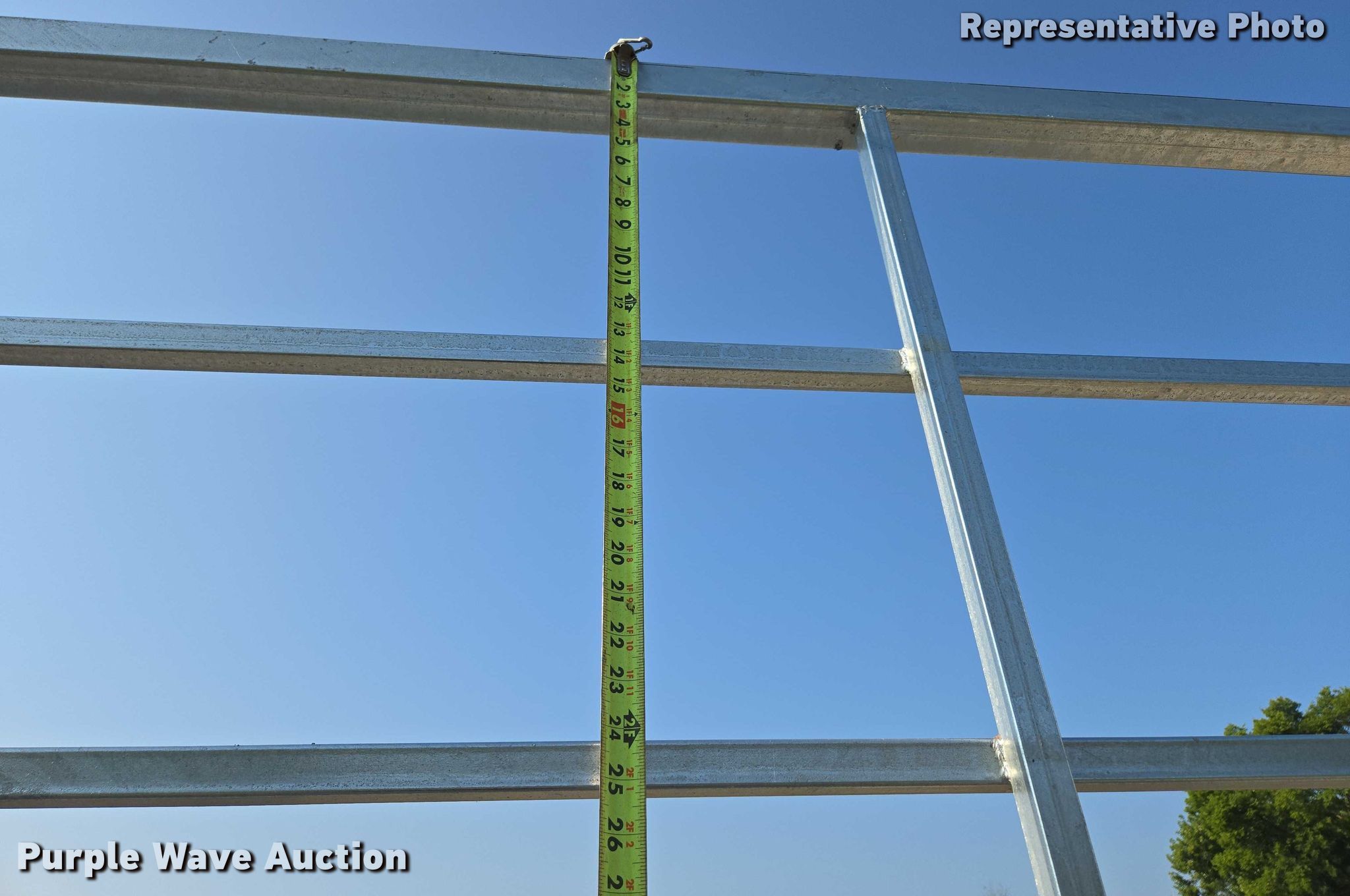 (10) galvanized livestock panels. Features. Dimensions:, 19' L x 6' H, Support stand width: 6', Free standing, Removable legs. Notes Unused. Representative photos. Fairplay Metals. Fair Play, MO 65649