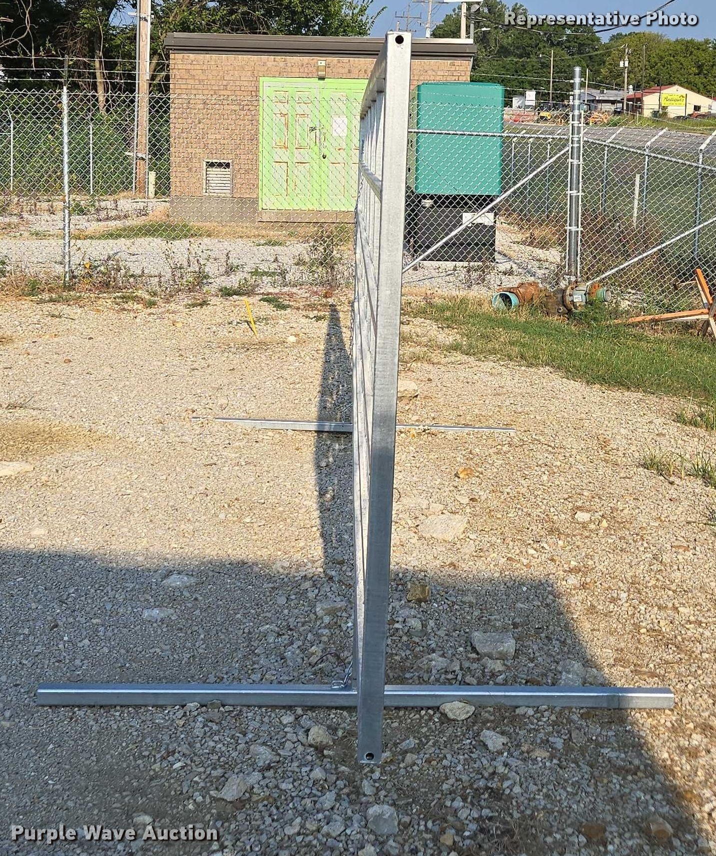 (10) galvanized livestock panels. Features. Dimensions:, 19' L x 6' H, Support stand width: 6', Free standing, Removable legs. Notes Unused. Representative photos. Fairplay Metals. Fair Play, MO 65649