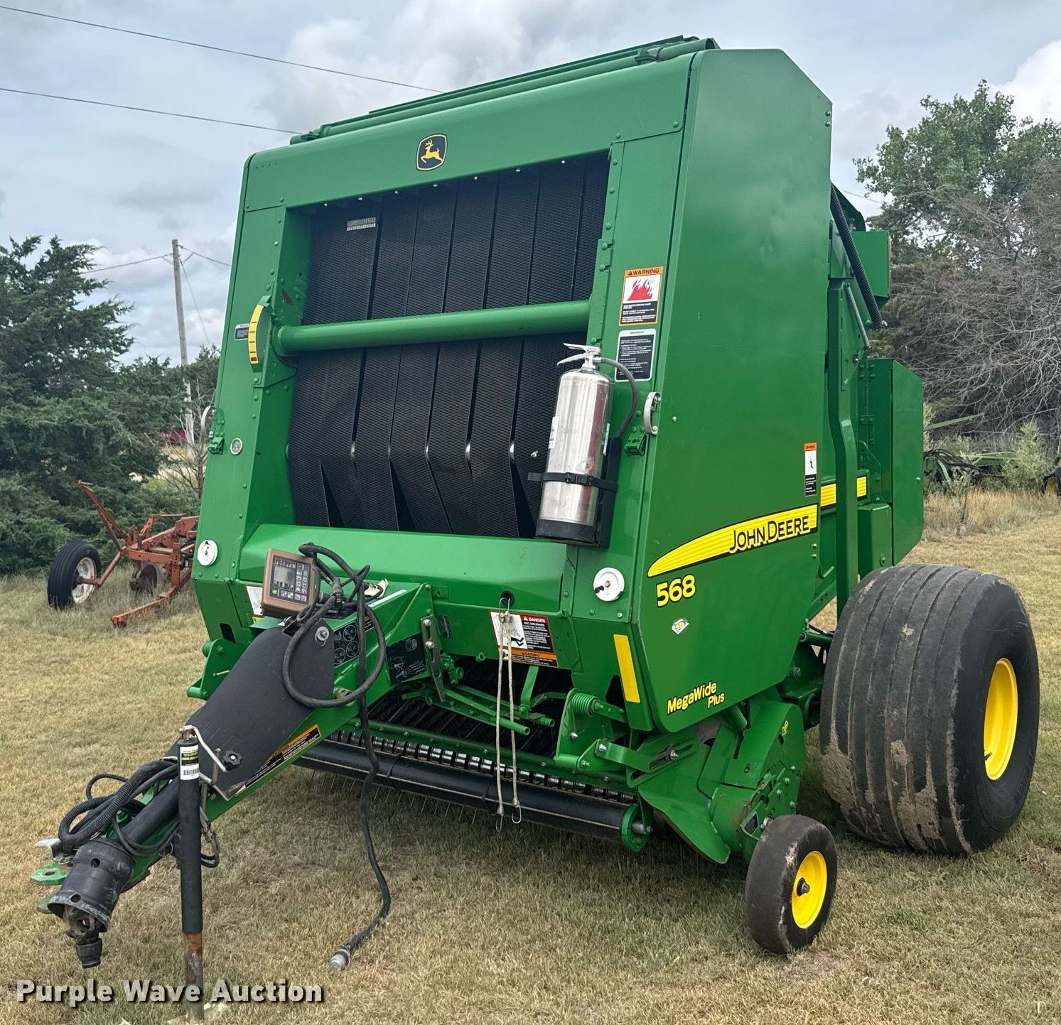 Purple Wave is selling a used Round Baler in Kansas. This item is a 2012 John Deere 568 round baler with the following: Bale count: 25,520, Serial: 1E00568XCCC388226