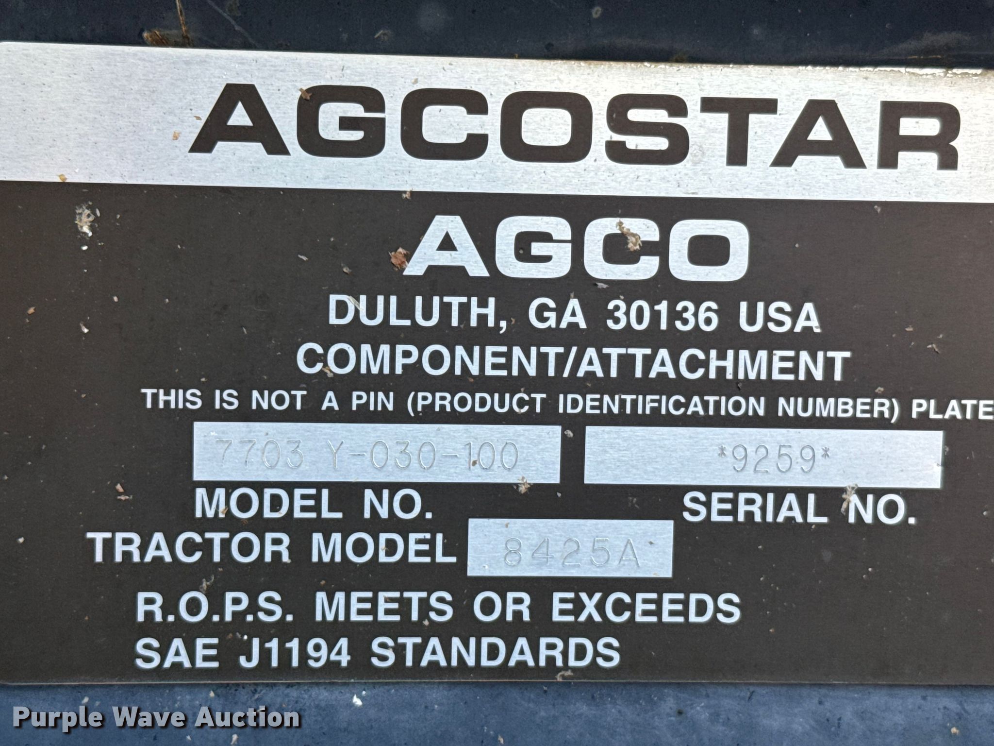 1997 AgcoStar 8425 4WD tractor. Hours: 3,093 on meter, Serial: 100259RO. Engine Cummins, Displacement: 14.0L, Cylinders: 6, Fuel type: Diesel. Transmission Synchro, 18F - 2R. Chassis Differential lock. Operators station AC, Heat. Features Seven pin outlet, Hydraulic remote sets Rear: 4. Tires Size: 20.8-42, Duals. Mitchek Farms GP. Seibert, CO 80834