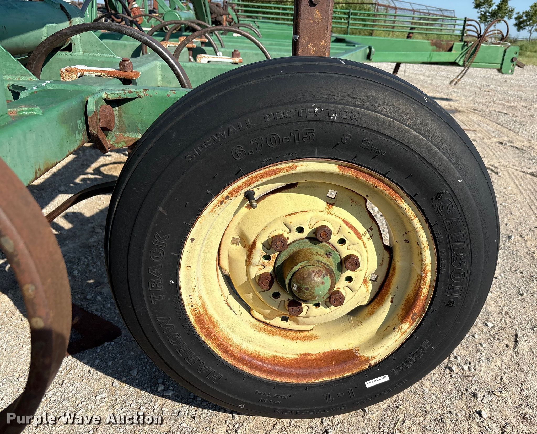 Field cultivator. Overall width: 44' 8". Features Shanks: 74, Sweep width: 10", Operation Hydraulic lift, Hydraulic fold, Leveler: Hydraulic, Walking tandem axle, Attachments Spike tooth harrow Harrow bars: 3, Rear hitch. Tires Tire size: 7.60-15SL, Gauge wheels Size: 6.70-15. Notes Tire off wheel, will be repaired prior to auction, Tractor not included. Ringling, OK 73456