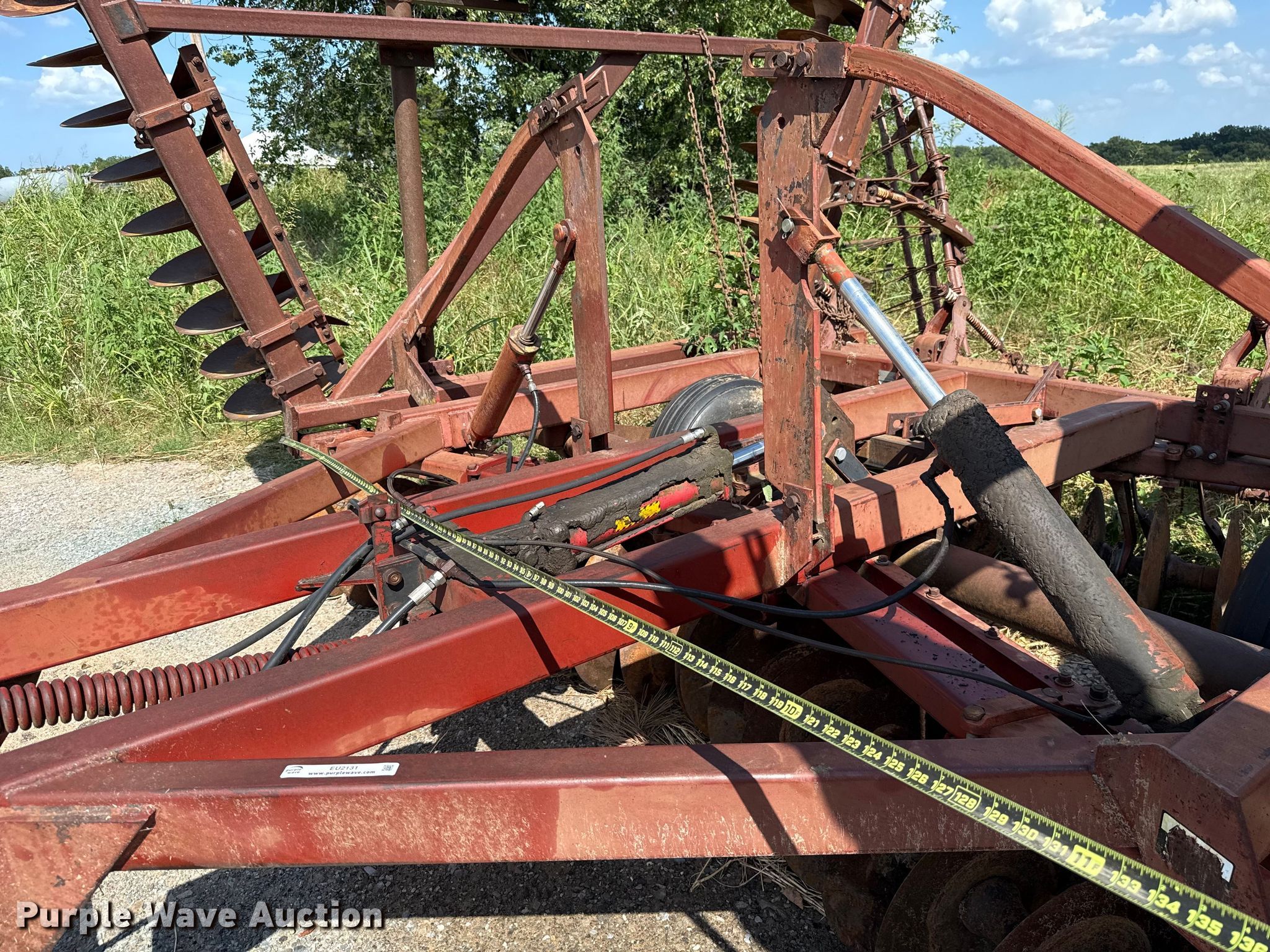 International 490 tandem disk. Overall width: 22', Serial: 0470000U022996. Features Front blades Diameter: 21", Spacing: 7", Rear blades Diameter: 18", Spacing: 7", Disk scrapers, Operation Hydraulic lift, Hydraulic fold, Leveler: Manual, Attachments Tine harrow Harrow bars: 3.. Tires Tire size: 11L-14SL. Okemah, OK 74859