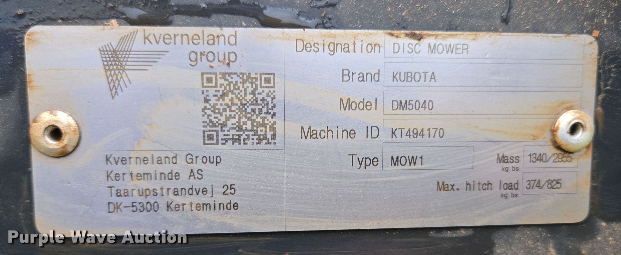 Purple Wave is selling a used Disc or Sickle Mower in Oklahoma. This item is a 2020 Kubota DM5040 disc mower with the following: Serial: KT494170, Insurance salvage unit claim #: 5-810708