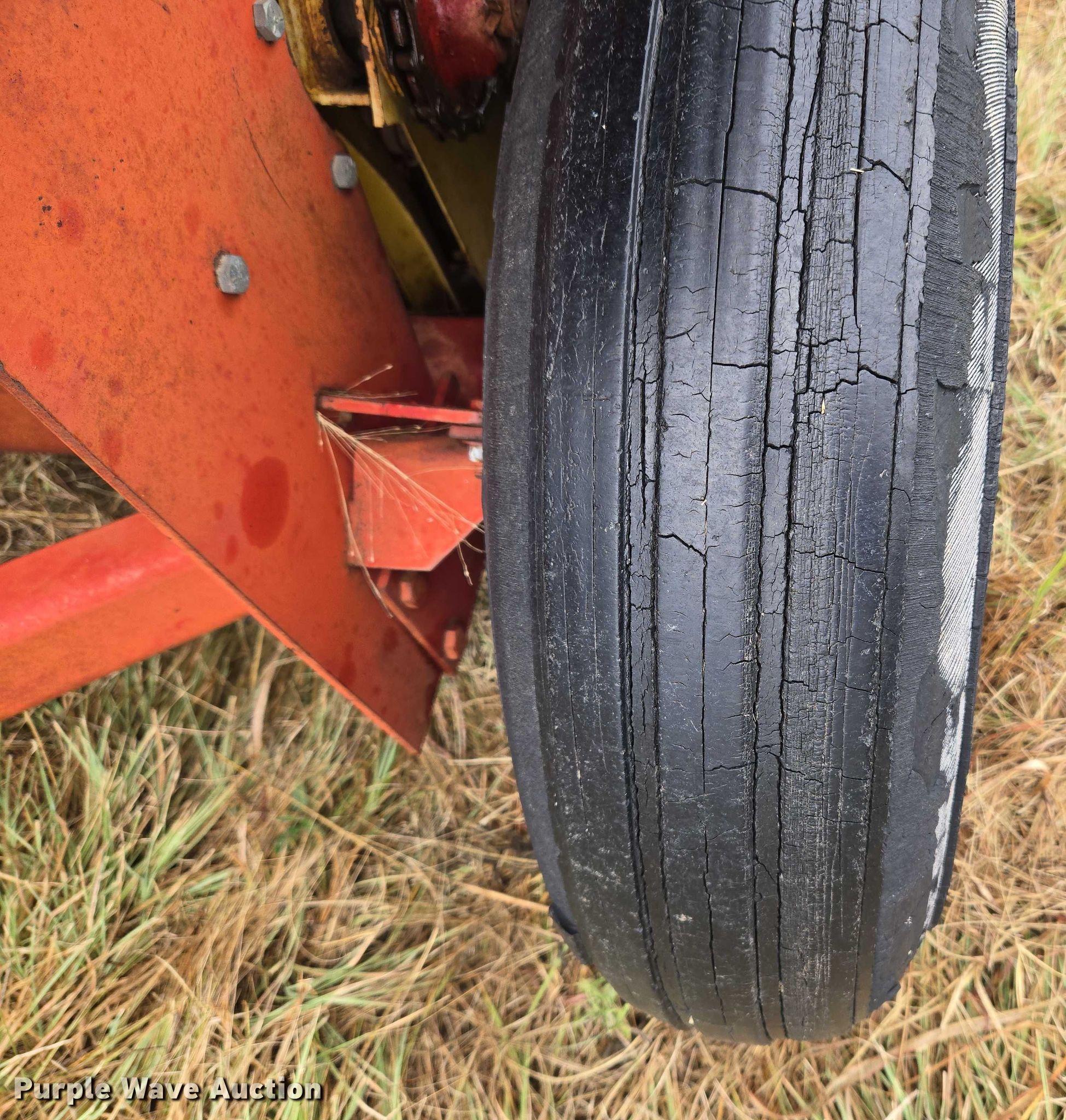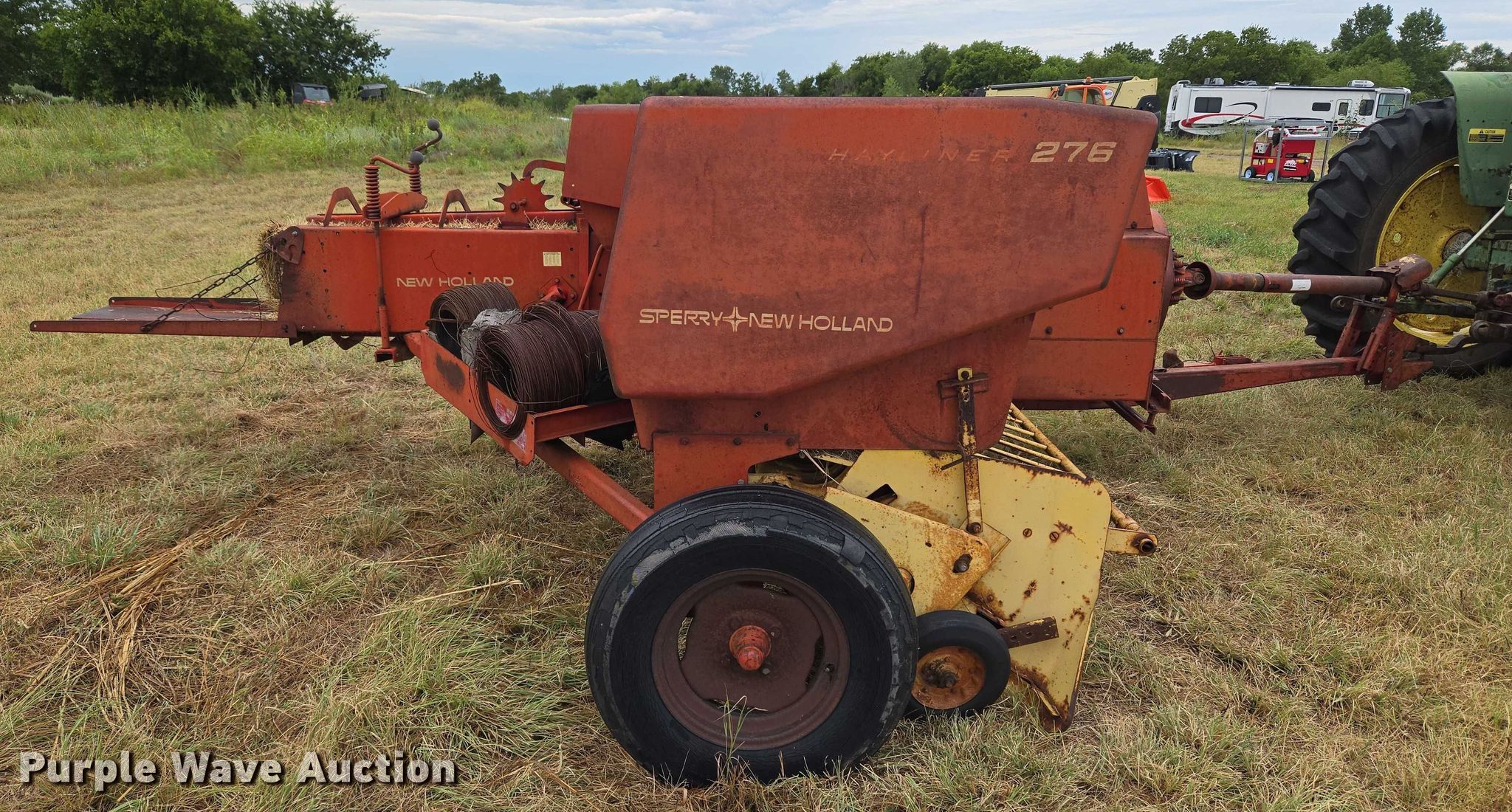 New Holland 276 small square baler. Serial: 365196. Features PTO: 540, Gauge wheels, Pickup width: 4' 6", Small square bale size: 14" x 18", Double knot knotters, Wire tie, Bale chute. Tires Size: 11L-14SL. Notes Tractor not included, Tire damage. Lawton, OK 73501