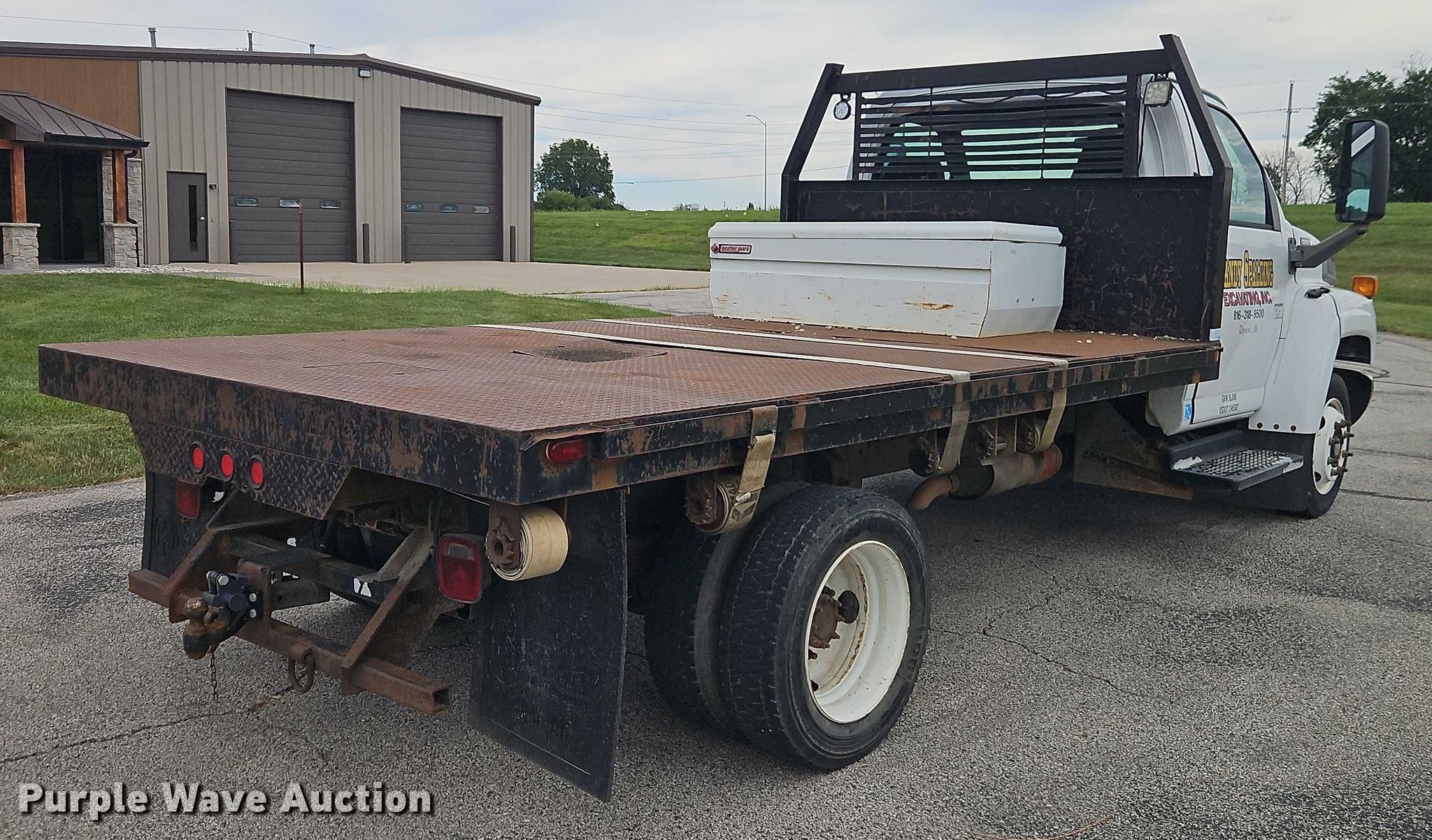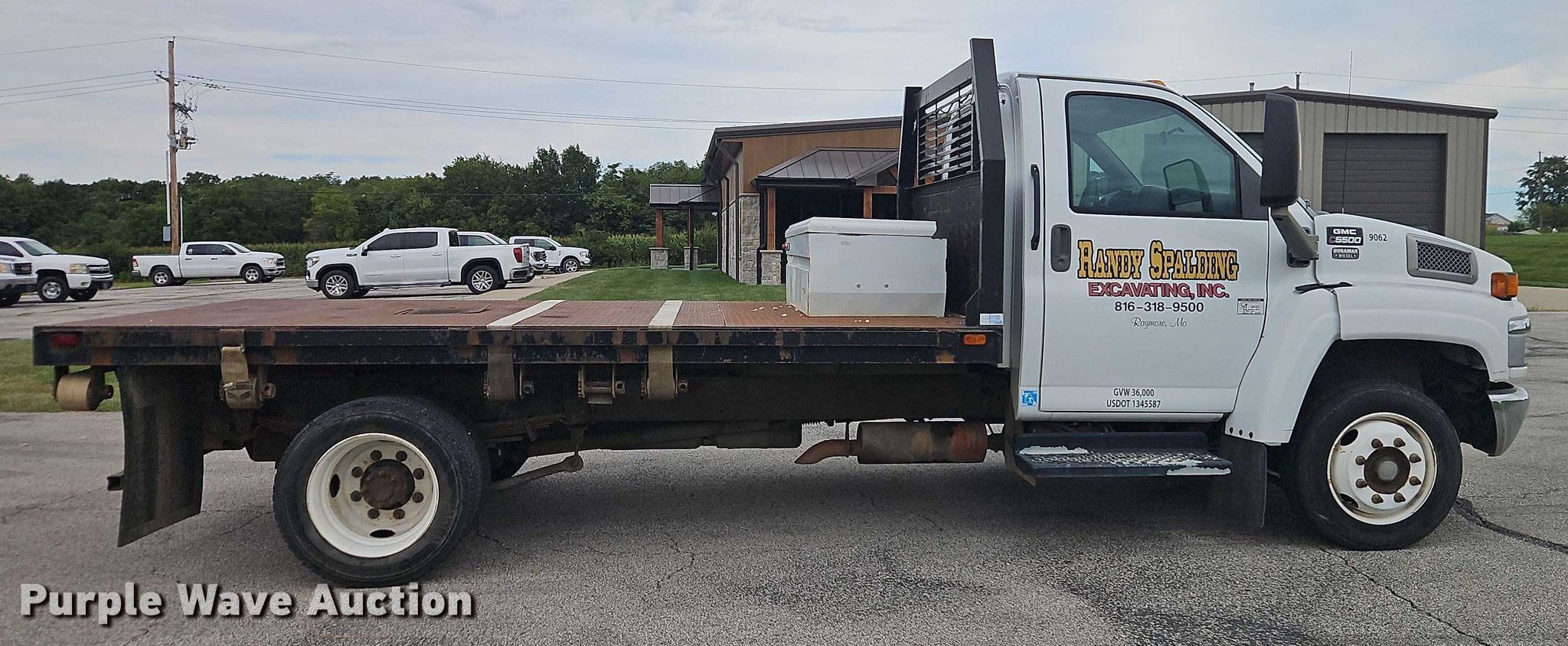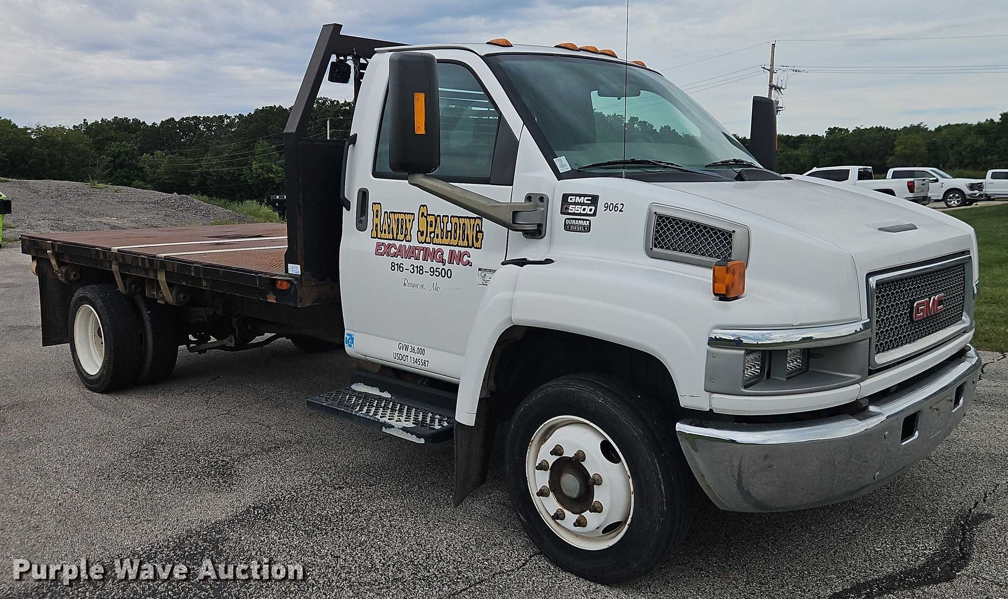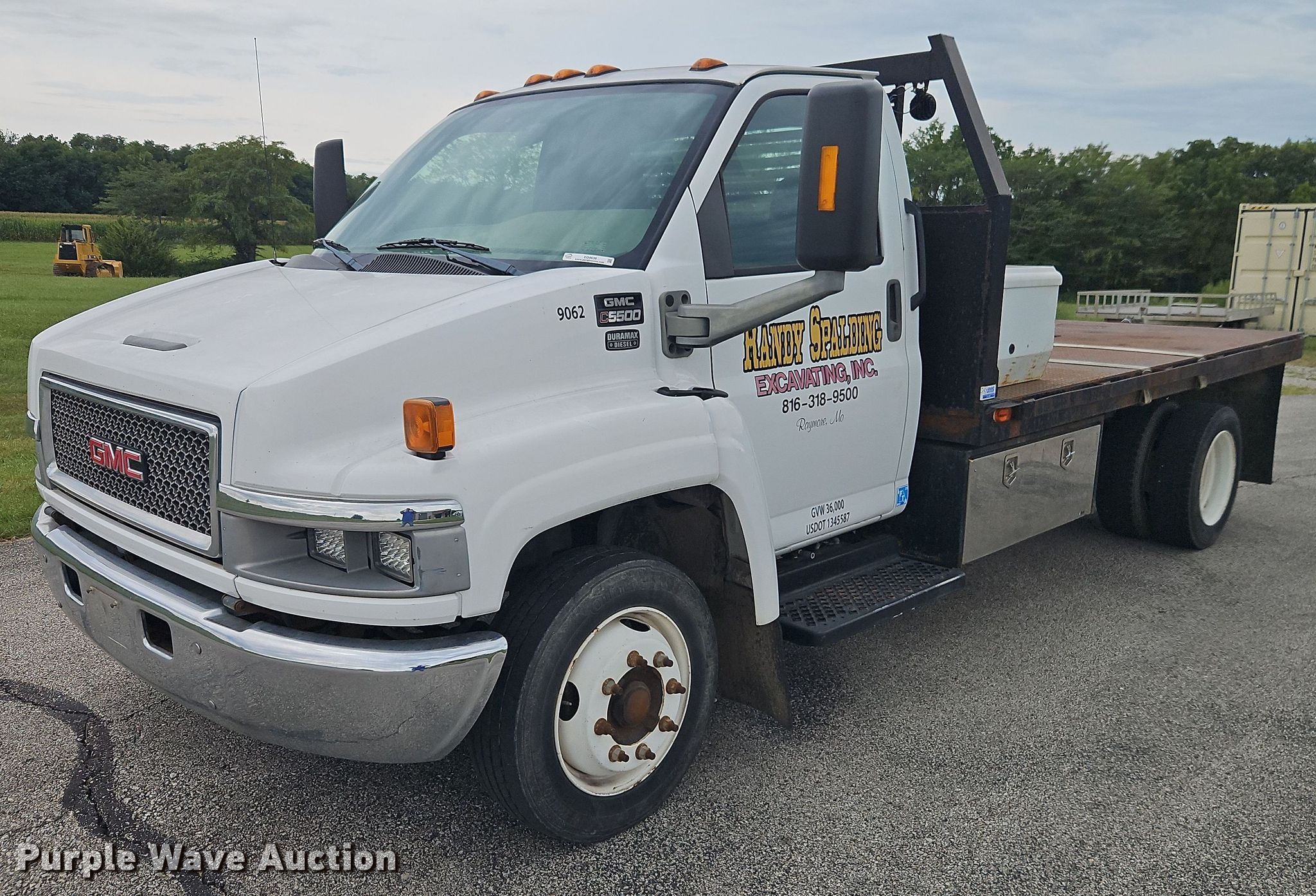 2005 GMC C5 flatbed truck. Miles: 156,126 on odometer, VIN: 1GDE5C1215F527716. Engine Duramax, Displacement: 6.6L, Cylinders: 8, Fuel type: Diesel. Transmission Automatic. Chassis Axles: Single, Suspension: Spring, Brakes: Hydraulic, GVWR: 19,500 lbs. Interior AC, Heat, Cruise control, Brake controller. Features Bed Dump flatbed, Length: 13', Width: 96", Ram: Single. Tires Size: 225/70R19.5. Notes Decals will be removed prior to auction, Dash warning indicator: Check engine, Dash warning indicator: Oil change required. Missouri title. Title distribution may be delayed up to 30 days from verification of funds. Randy Spalding Excavating. Pleasant Hill, MO 64080
