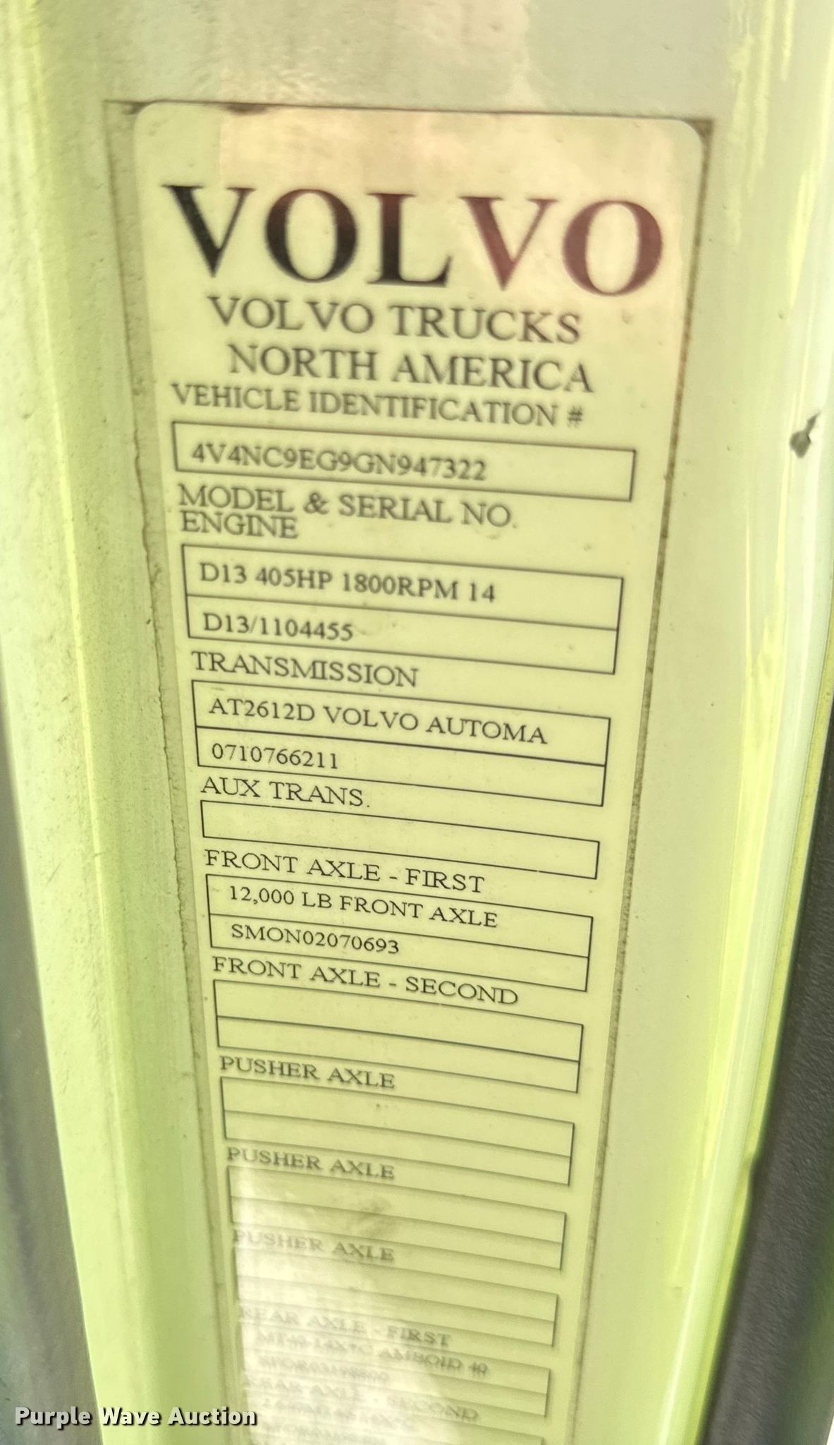 2016 Volvo VNL semi truck. Miles: 745,646 on odometer, VIN: 4V4NC9EG9GN947322, Unit #: 59618675. Engine Volvo D13, Displacement: 12.8L, Cylinders: 6, Fuel type: Diesel, Engine brake. Transmission Automated manual. Chassis Axles: Tandem, Differential lock: Inter-axle, Suspension: Air Dump valves, Brakes: Air, GVWR: 50,000 lbs FAWR: 12,000 lbs, IAWR: 19,000 lbs, RAWR: 19,000 lbs. Interior AC, Heat, Heated mirrors, Power windows, Power locks, Cruise control, Air ride cab. Features Deck plate: Aluminum, Fifth wheel type: Air operated, Sliding, Fuel tank: Dual. Tires Size: 295/75R22.5. Notes Dash warning indicator: ABS, Traction control, Low system air pressure, Battery, Windshield chipped or cracked, Non-operational starter, Dash partially disassembled, Fifth wheel plate missing, Non-operational unit Unit must be towed or hauled. Repossessed item, stored at a secured facility. Please review REQUIRED REMOVAL INSTRUCTIONS. Titles will be distributed after confirmation of payment and removal. Illinois title. Title distribution may be delayed up to 30 days from verification of funds. Lender Owned. Dyer, IN 46311
