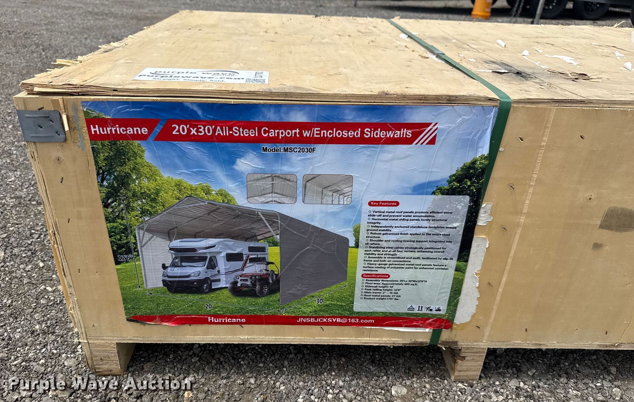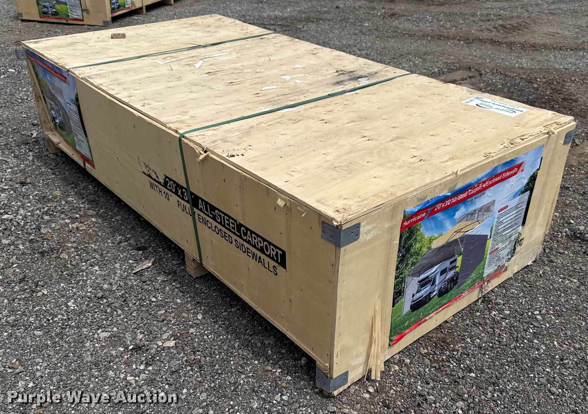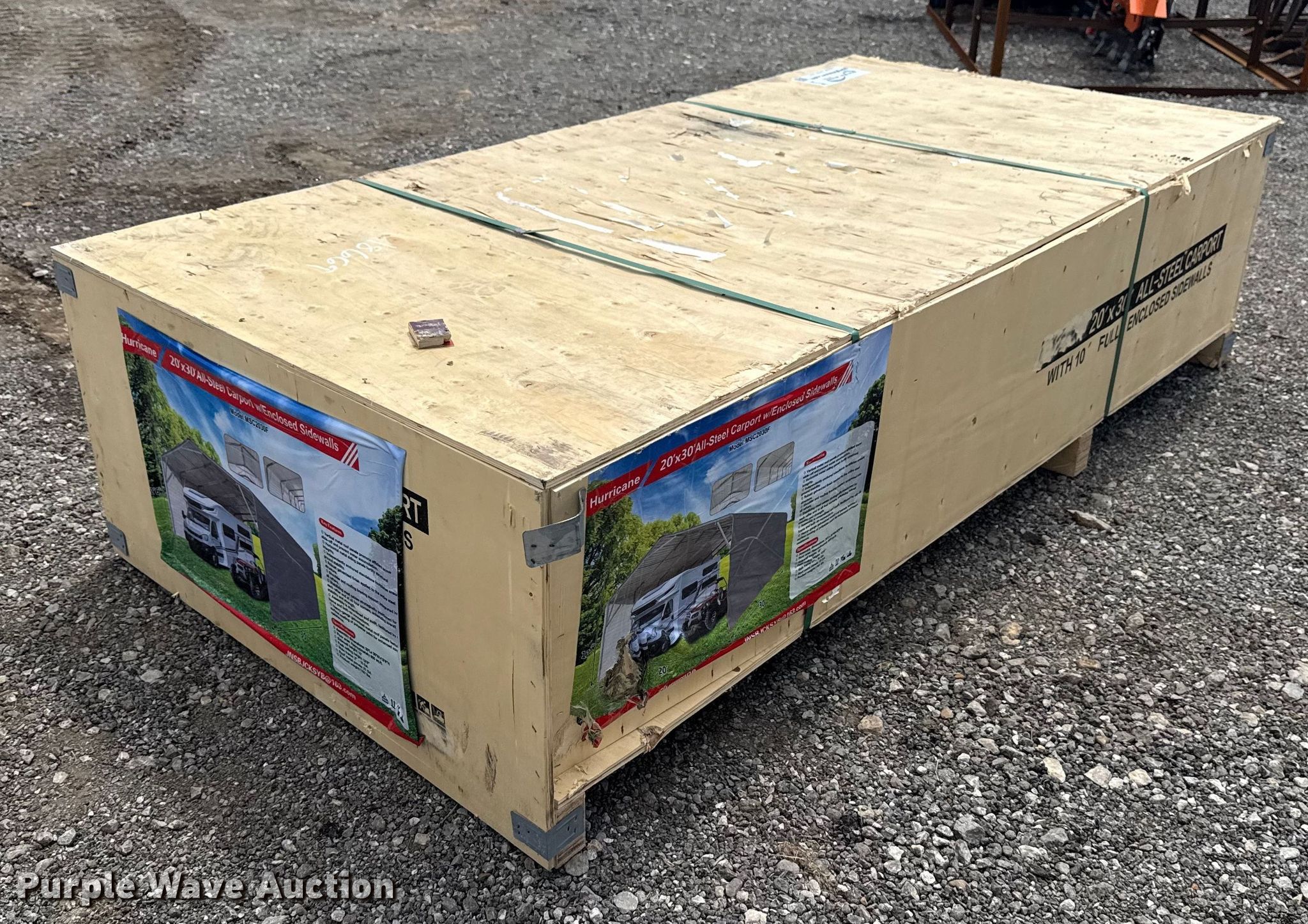 Purple Wave is selling a used Building Materials in Oklahoma. This item is a Hurricane MSC2030F storage shelter with the following: Dimensions: 30' L x 20" W x 12' 6" H, Sidewalls: 10'