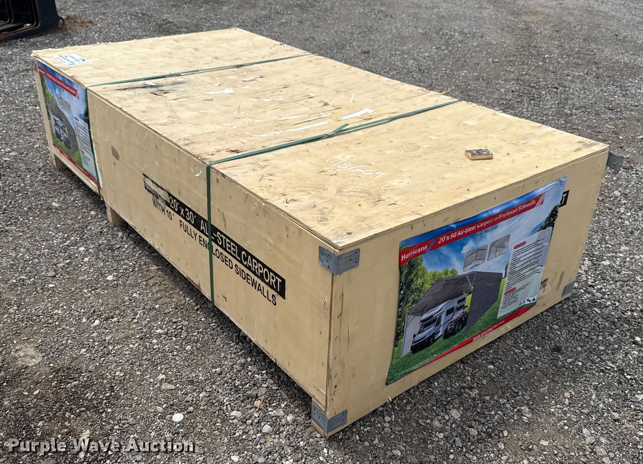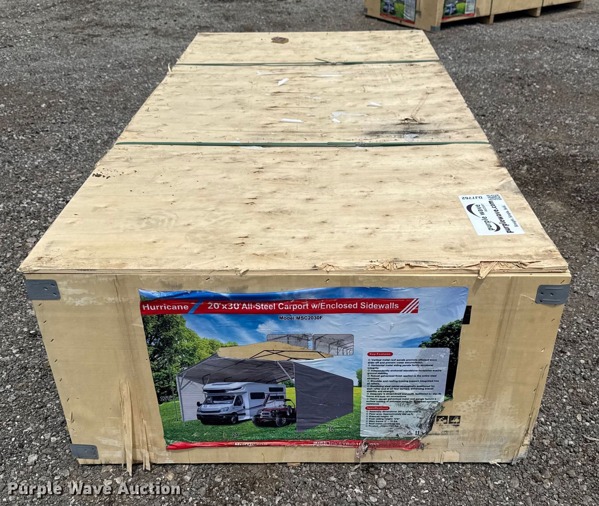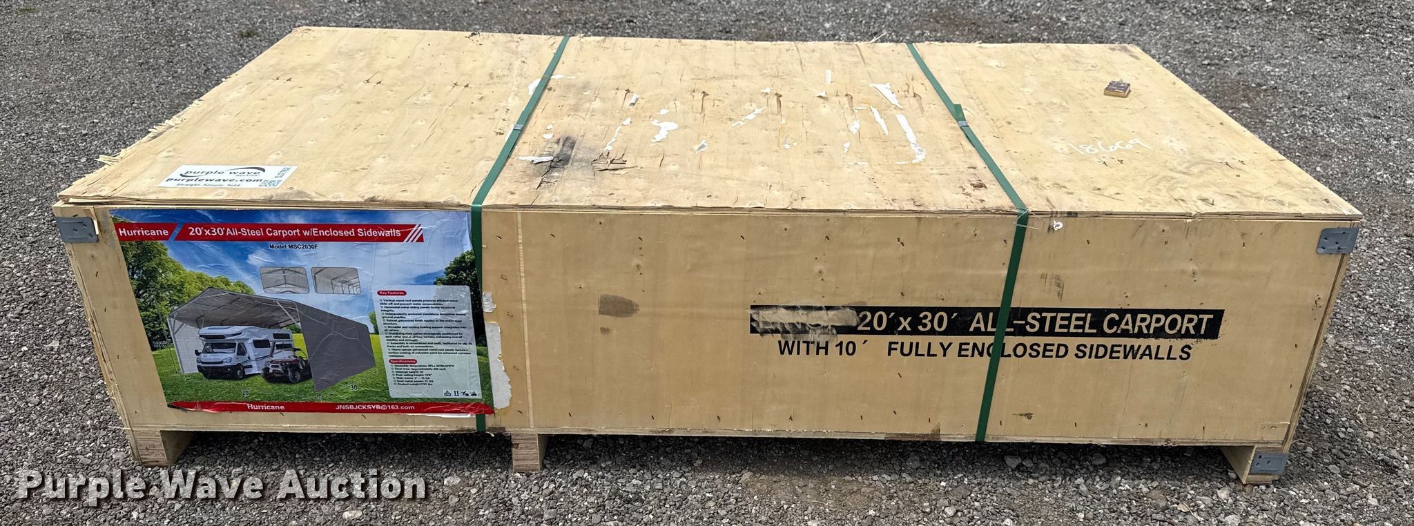 Purple Wave is selling a used Building Materials in Oklahoma. This item is a Hurricane MSC2030F storage shelter with the following: Dimensions: 30' L x 20" W x 12' 6" H, Sidewalls: 10'