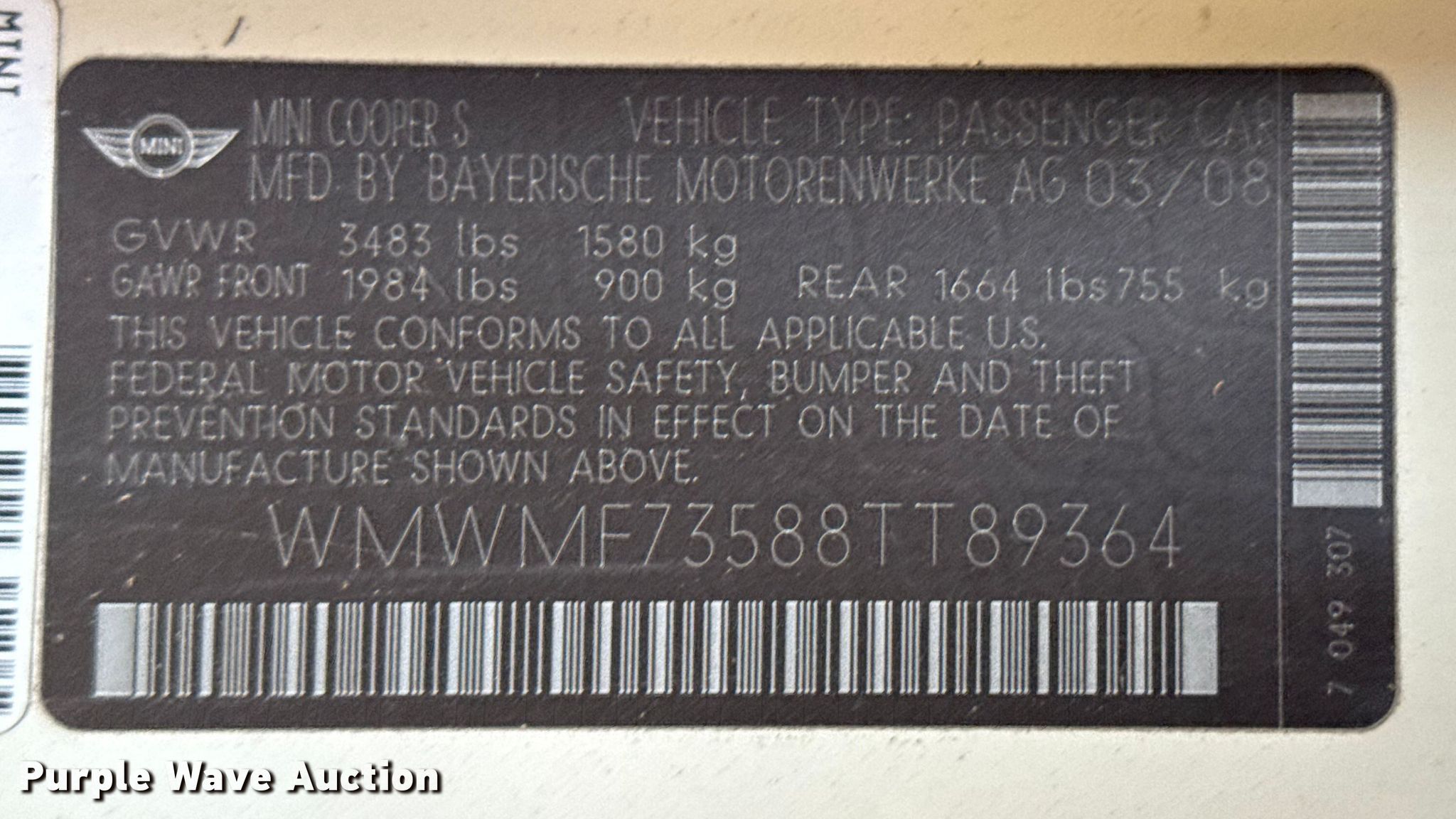 Purple Wave is selling a used Passenger Vehicle in Oklahoma. This item is a 2008 Mini Cooper with the following: Miles: Unknown, VIN: WMWMF73588TT89364