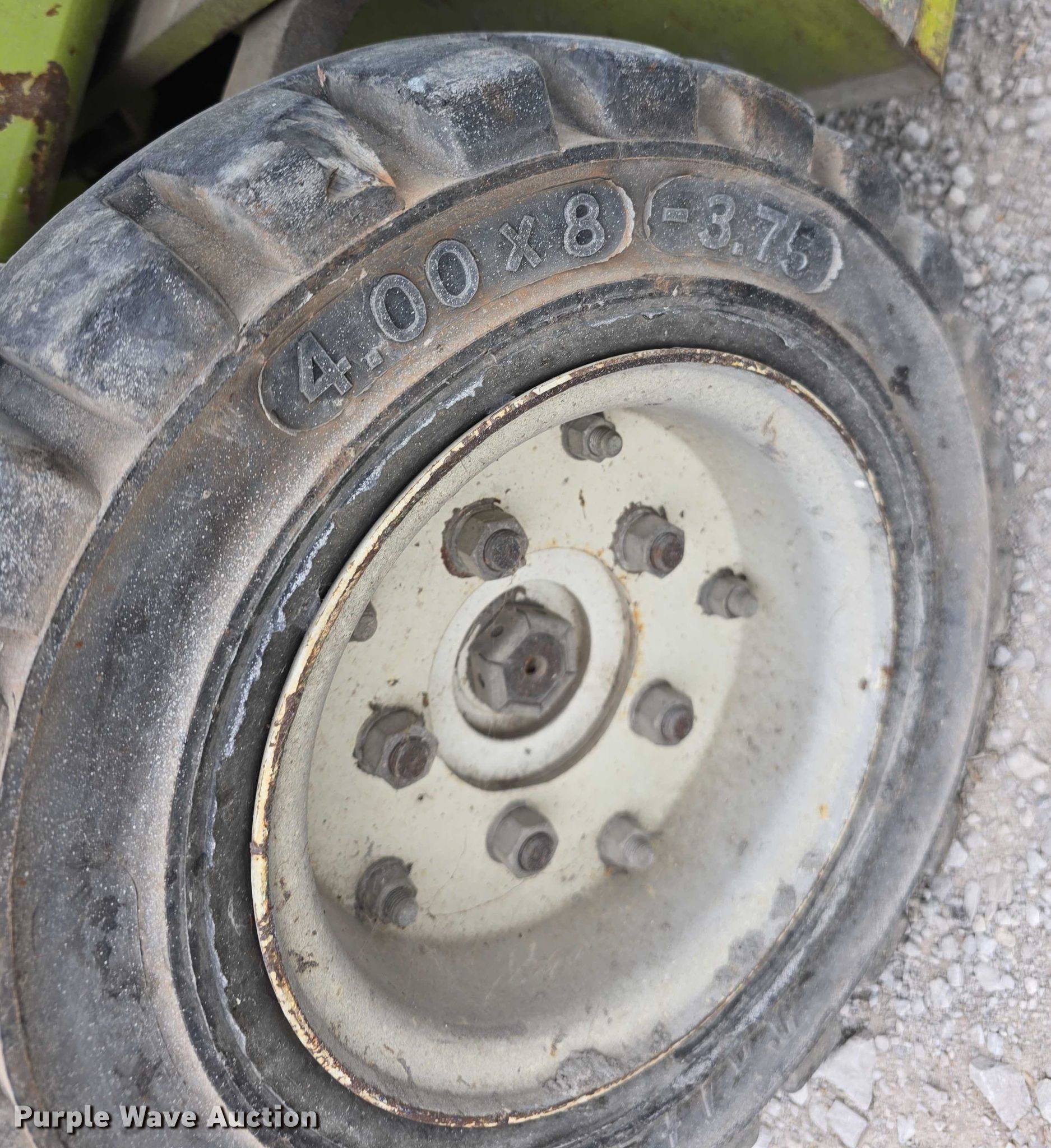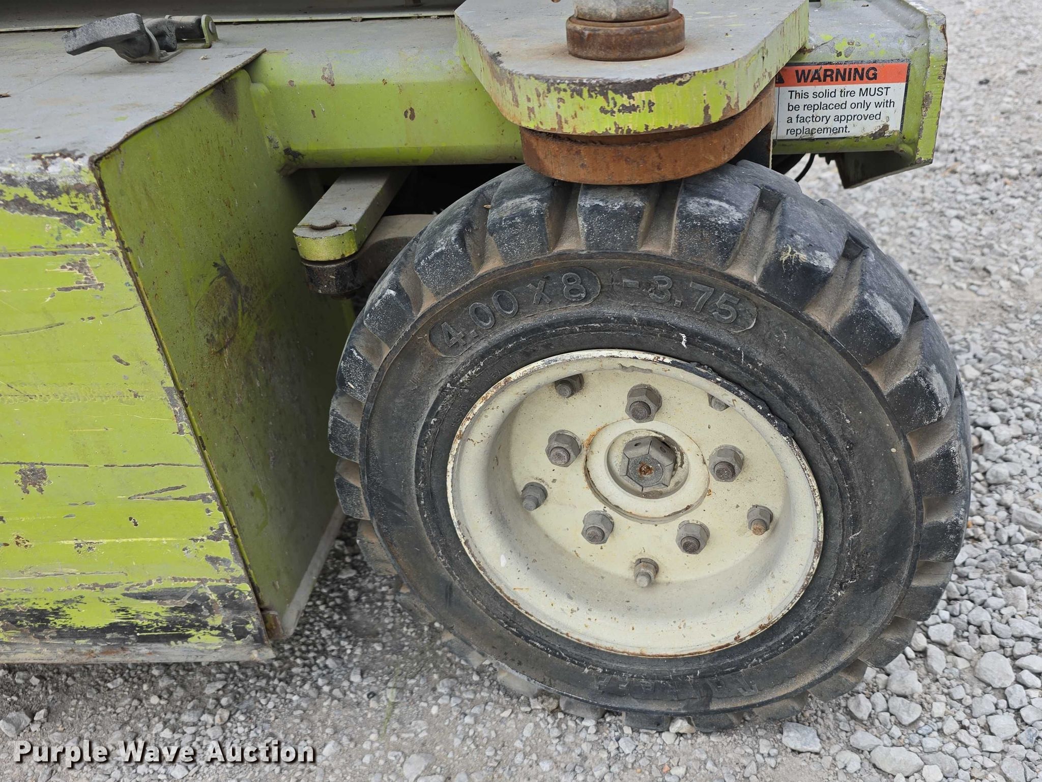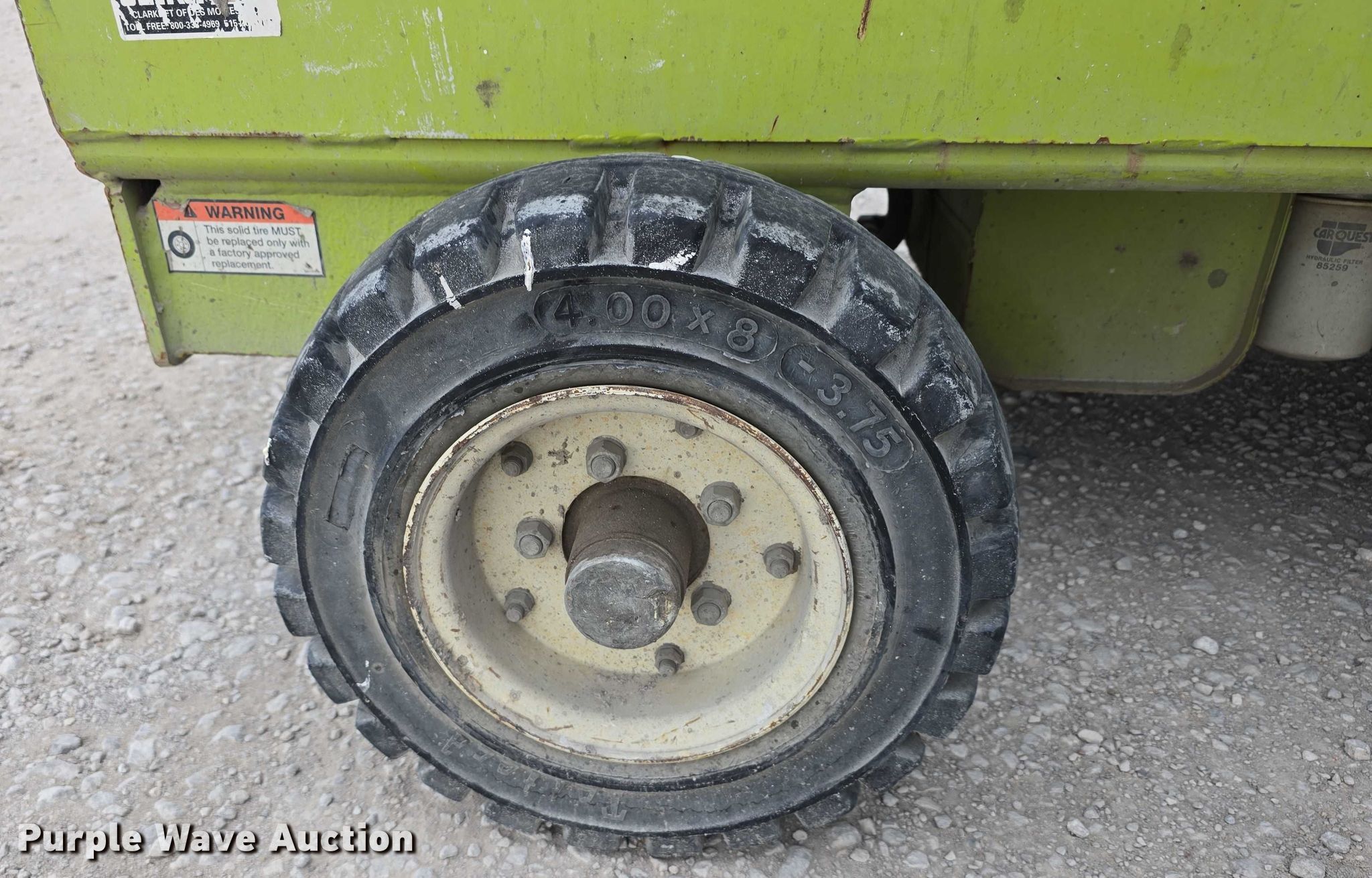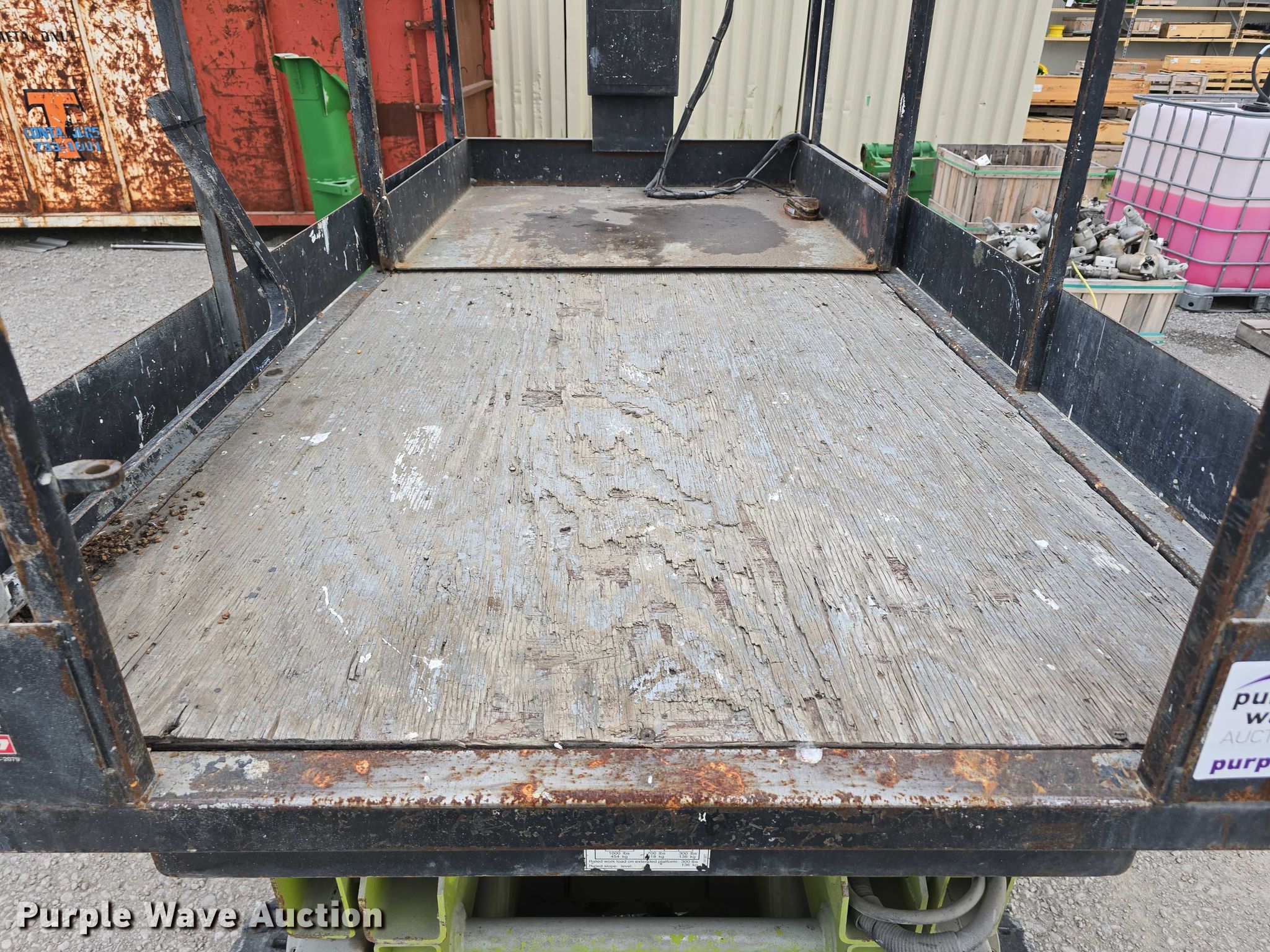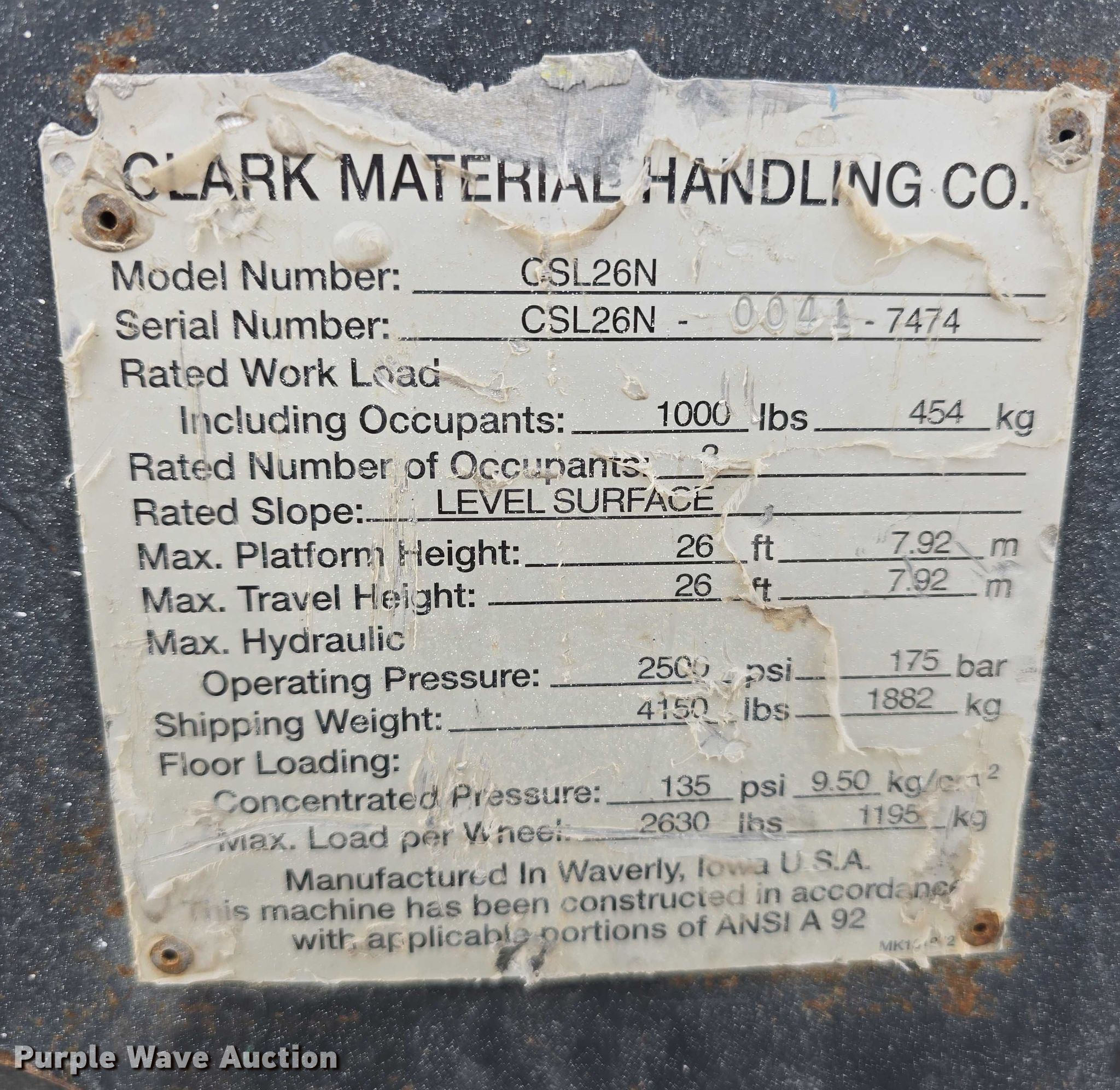 Clark CSL26N scissor lift. Hours: 330 on meter, Serial: CSL26N-0041-7474. Electric Motor Volts: 24. Features Maximum lift capacity: 1,000 lbs, Maximum lift height: 26', Platform: 134" L x 46" W, AC power outlet, Controls: Remote Control, Ground, Platform extensions: Manual. Tires Tire size: 4.00x8-3.75, Solid. Notes Owners manual, Non-operational unit. AgriVision Equipment Group. Pacific Junction, IA 51561