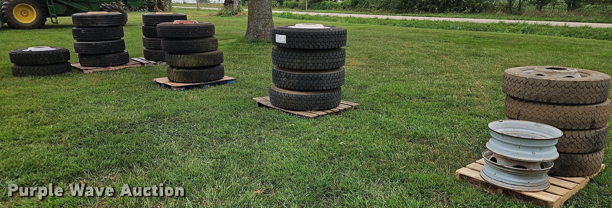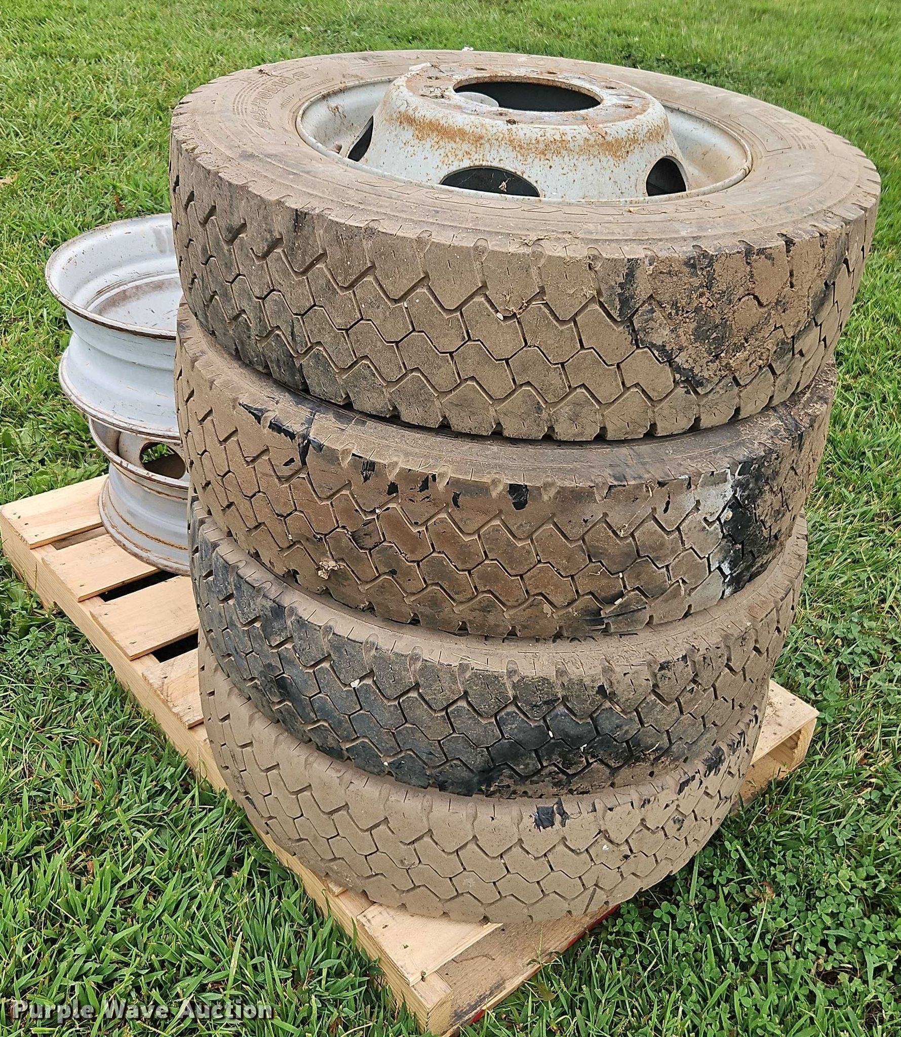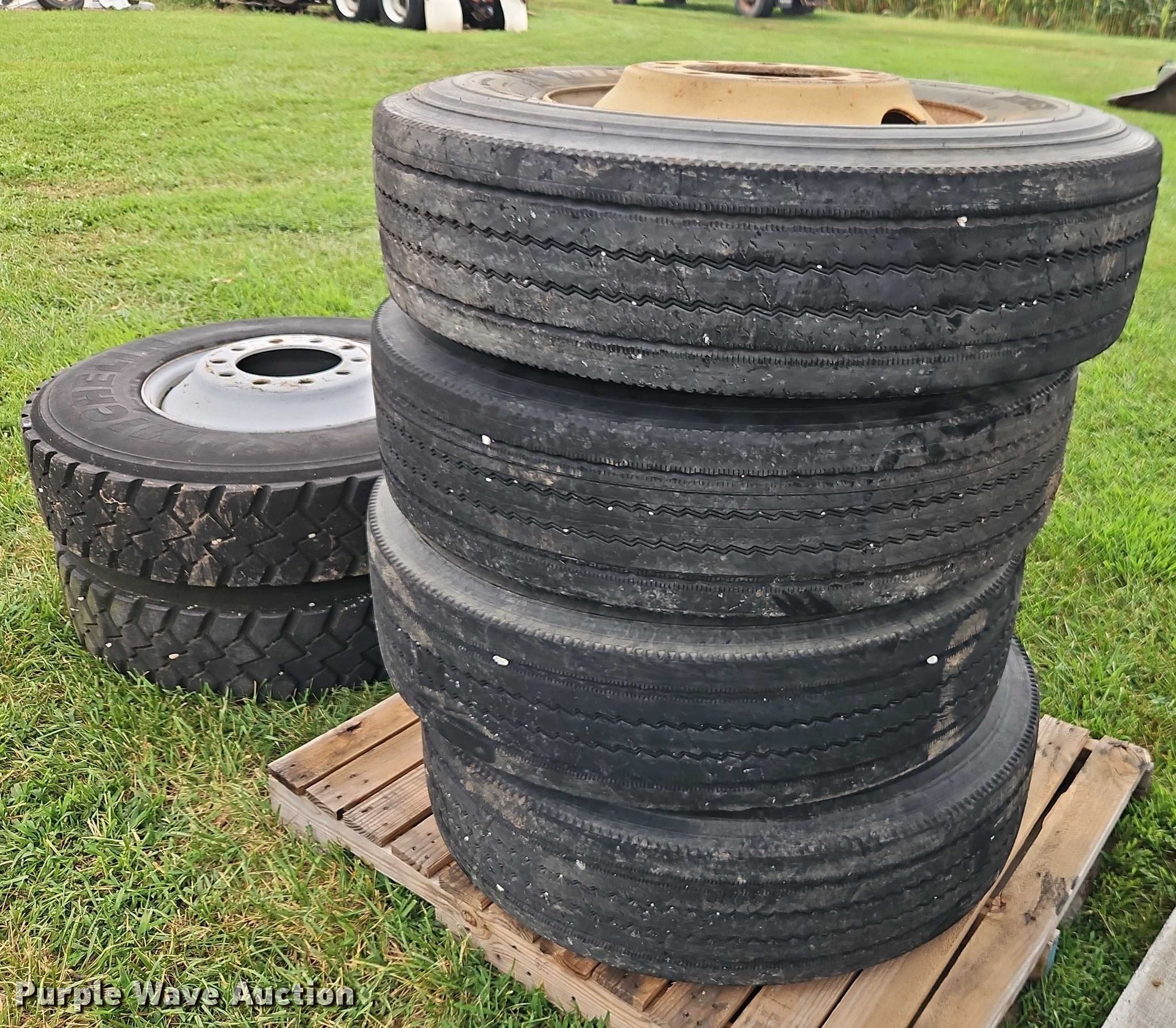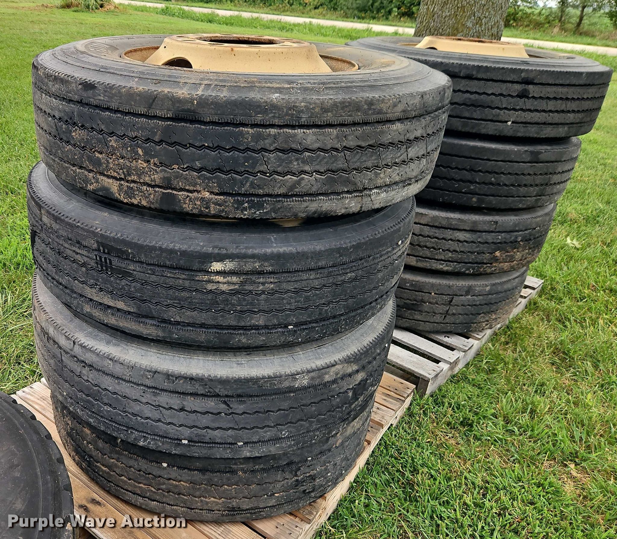 Purple Wave is selling a used Fleet Tires in Missouri. This item is a (22) tires and wheels with the following: (4) Hankook 22.5/70R19.5, (4) Bridgestone 11R22.5, (4) Bridgestone 9.00R20, (10) Michelin 11R22.5