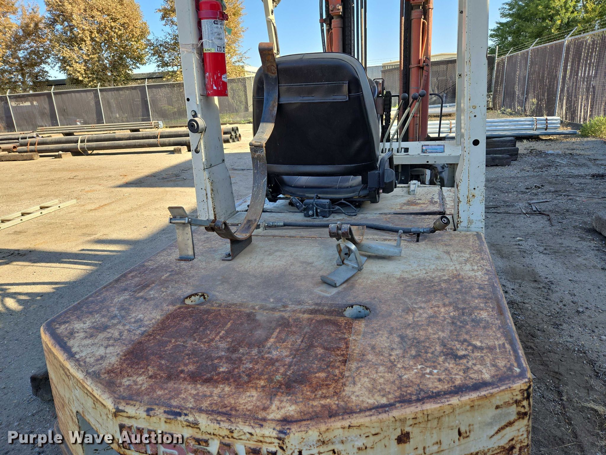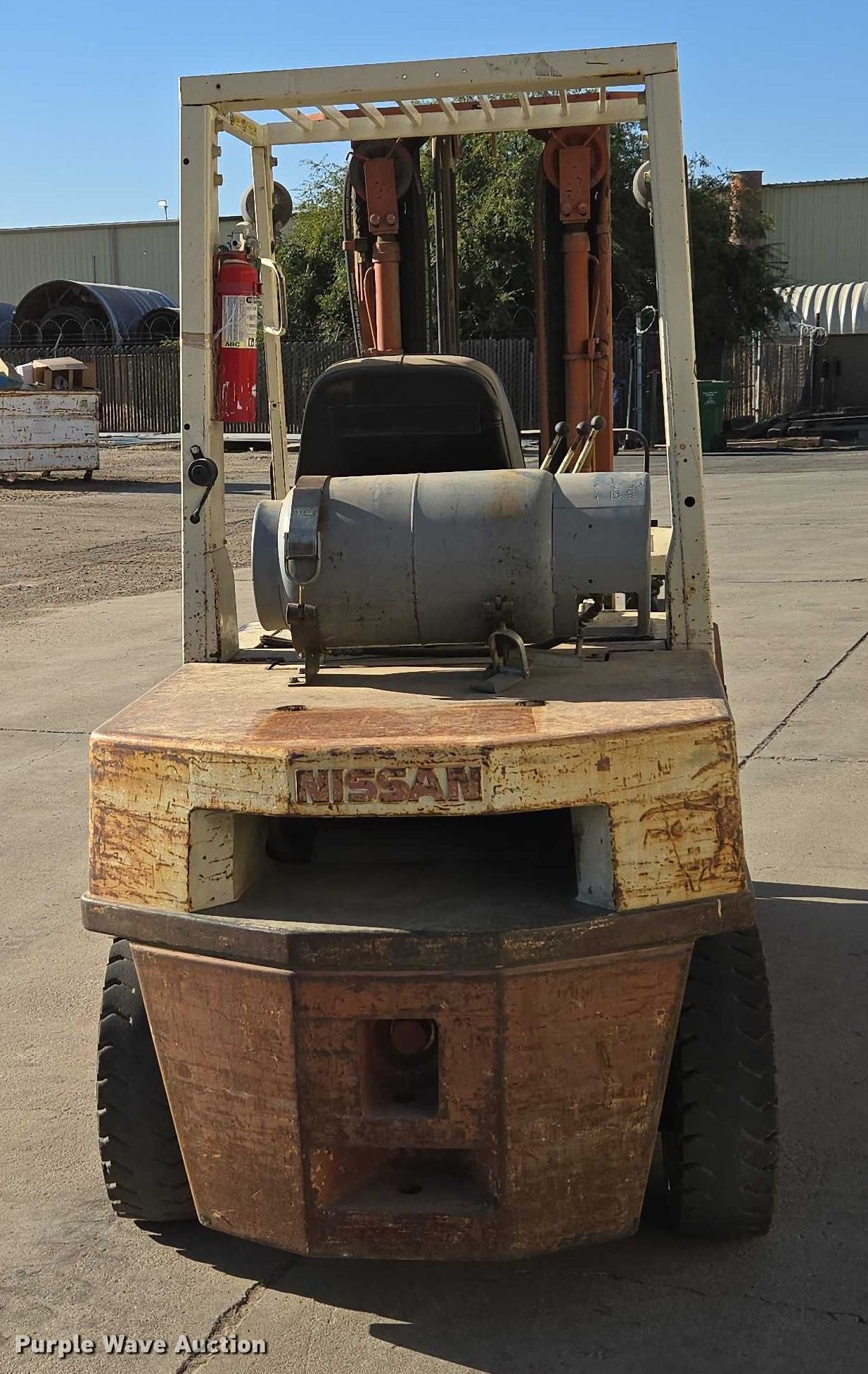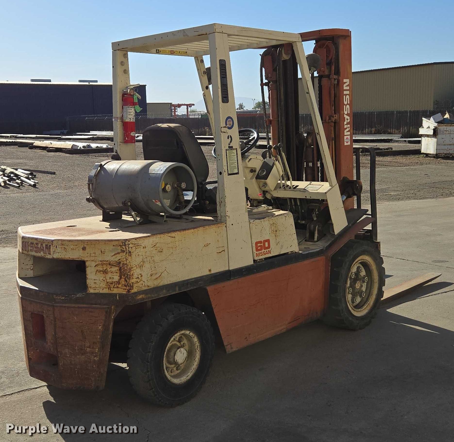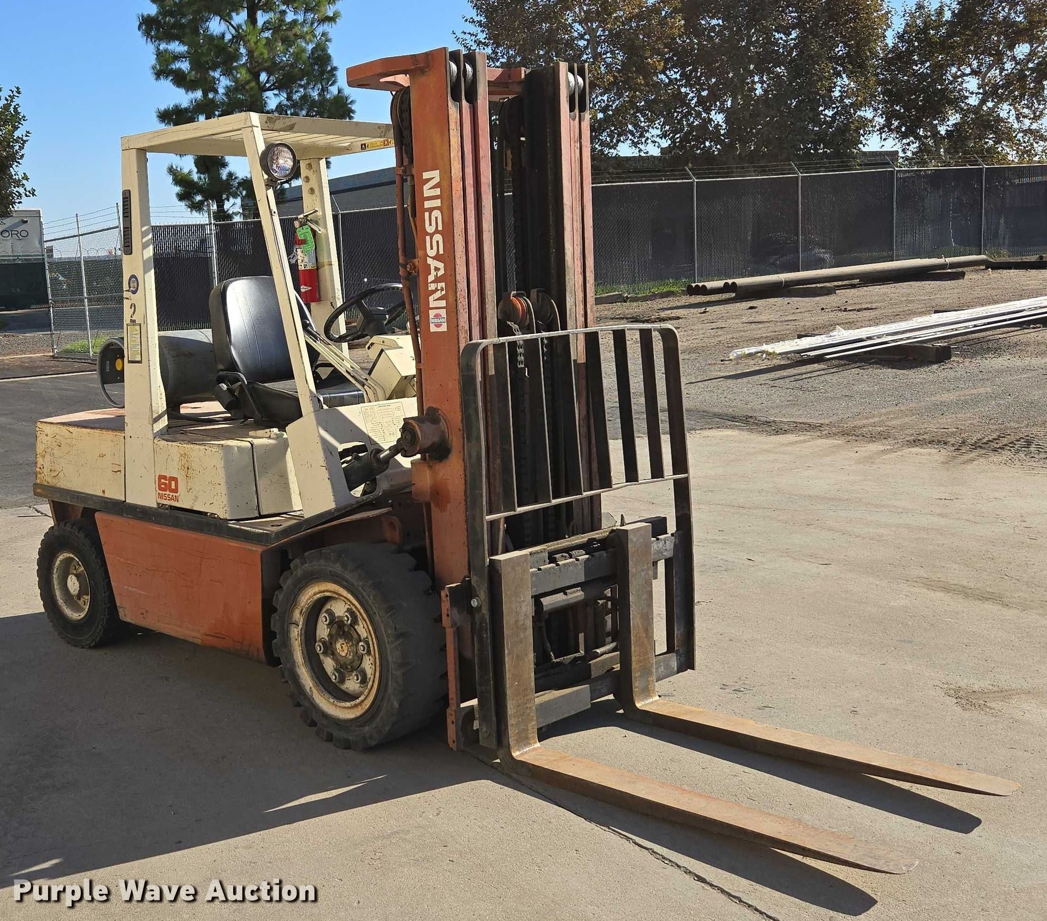 Purple Wave is selling a used Cushion Tire or Pneumatic Forklift in California. This item is a 1993 Nissan PF60 forklift with the following: Hours: 5,234 on meter, Miles or hours may vary, unit still in use, Serial: RGH02-920406, Unit #: SFS2332