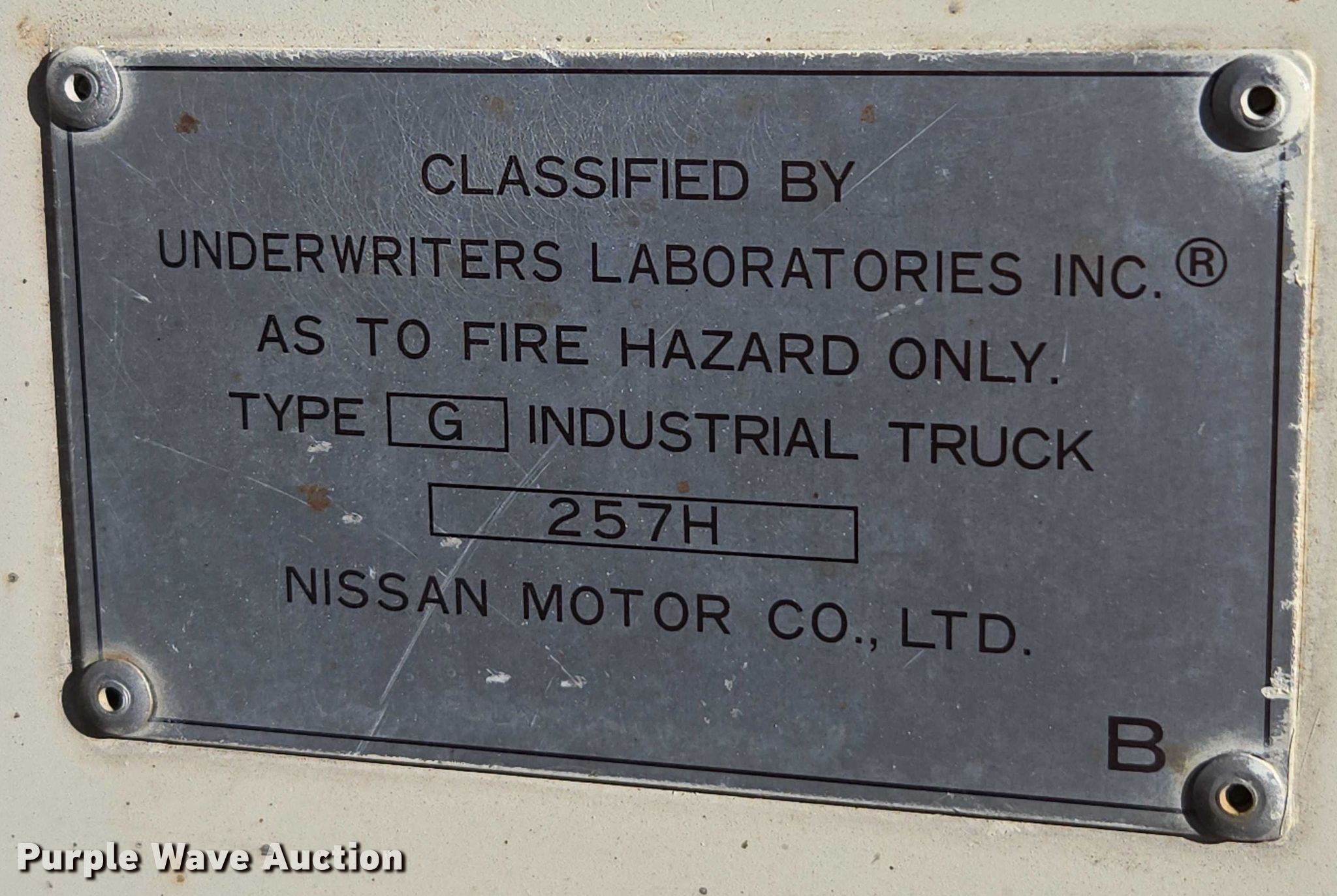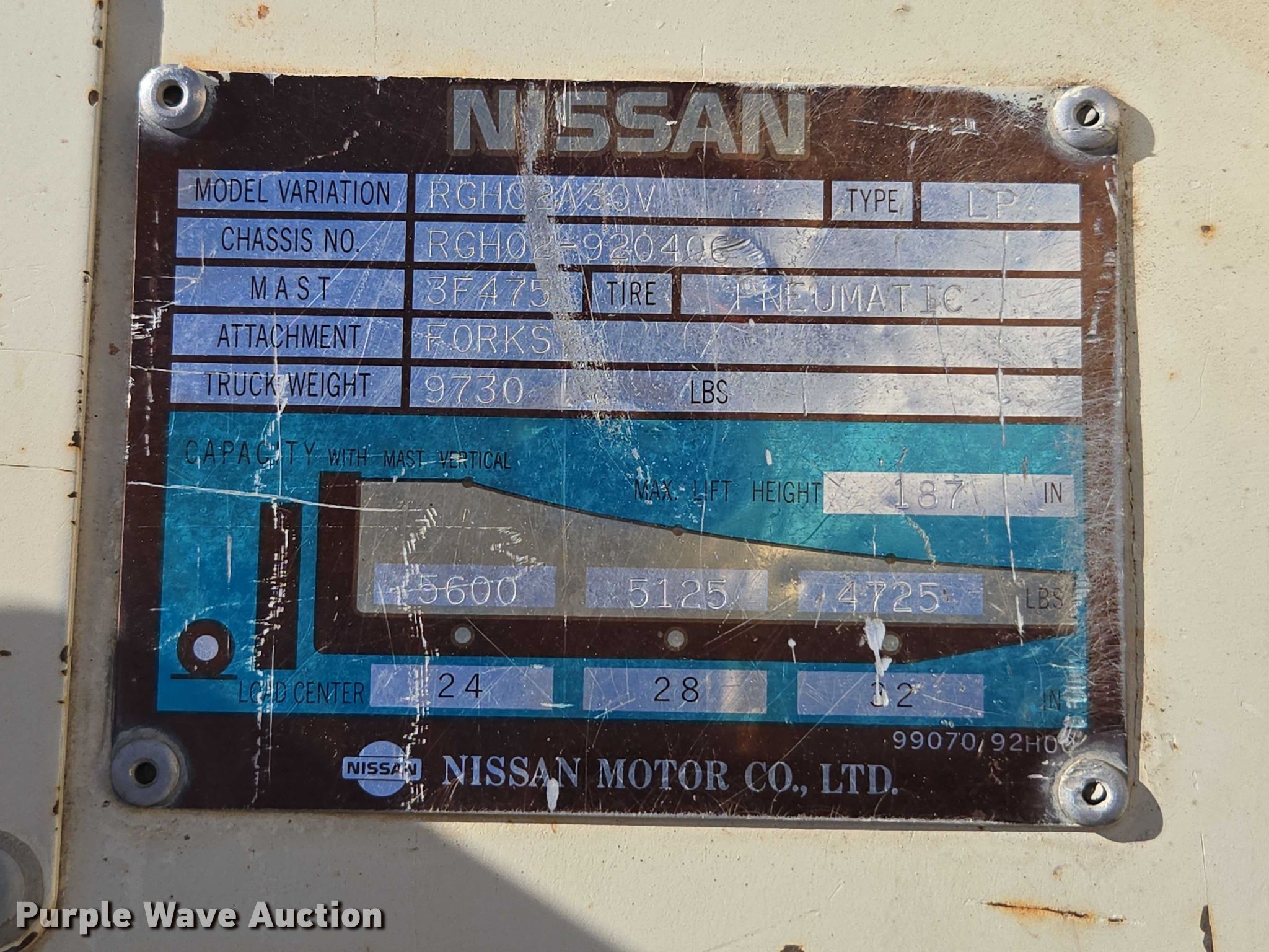 1993 Nissan PF60 forklift. Hours: 5,234 on meter, Miles or hours may vary, unit still in use, Serial: RGH02-920406, Unit #: SFS2332. Engine Fuel type: LPG LP bottle: Not included. Transmission Automatic. Operators station OROPS. Features Maximum lift capacity: 5,600 lbs, Maximum lift height: 187", Collapsed mast height: 84", Mast stages: 3, Side shift, Mast tilt, Fork length: 47". Tires Front: 8.15-15, Rear: 6.50-10, Solid. Ferguson. Bakersfield, CA 93308