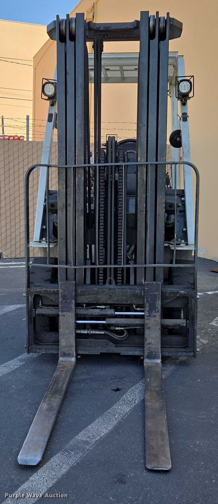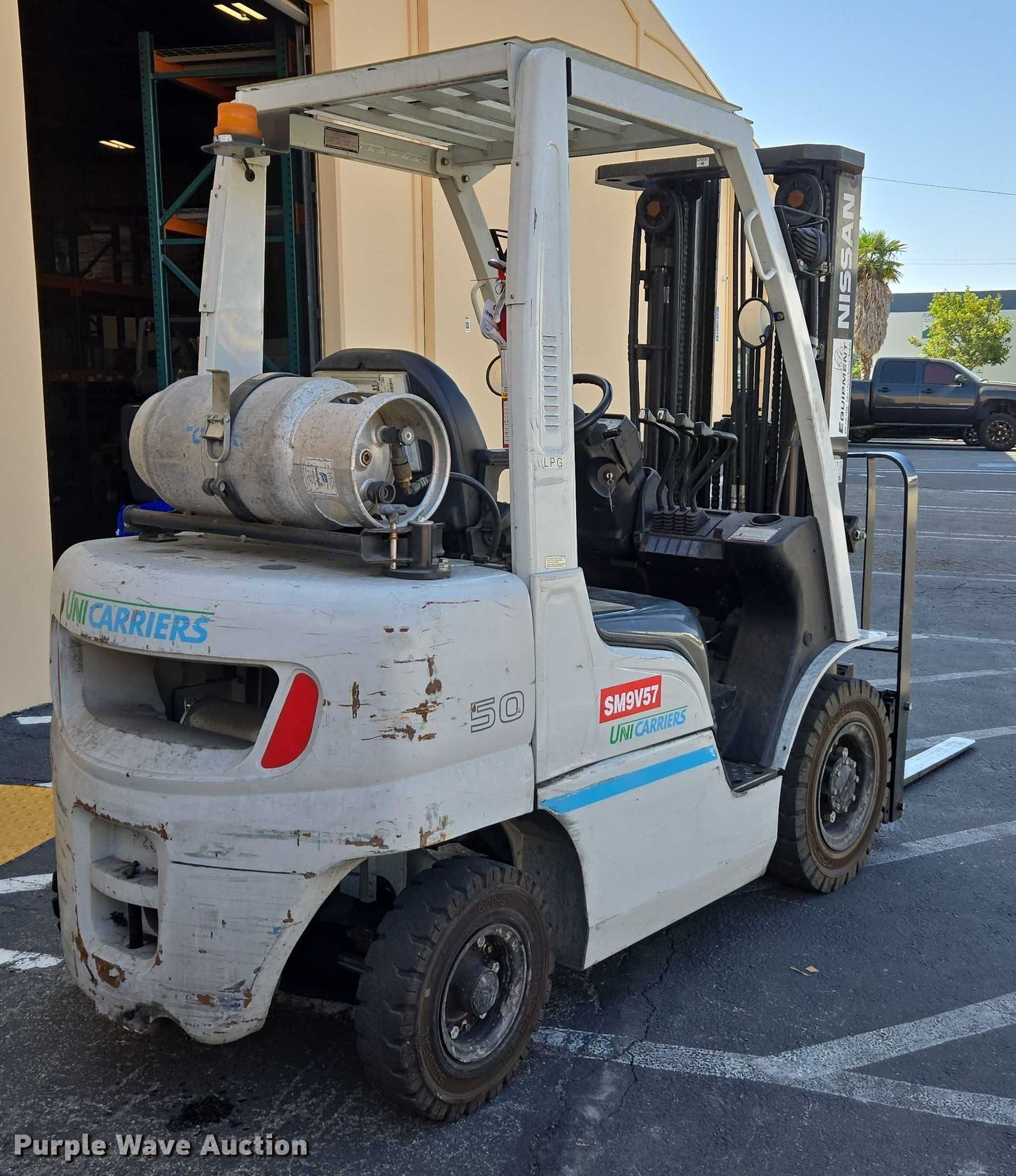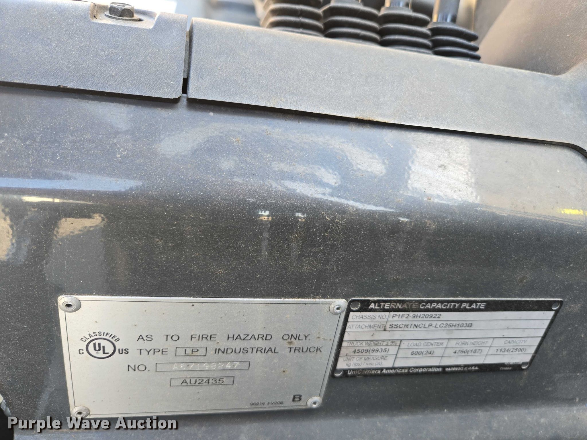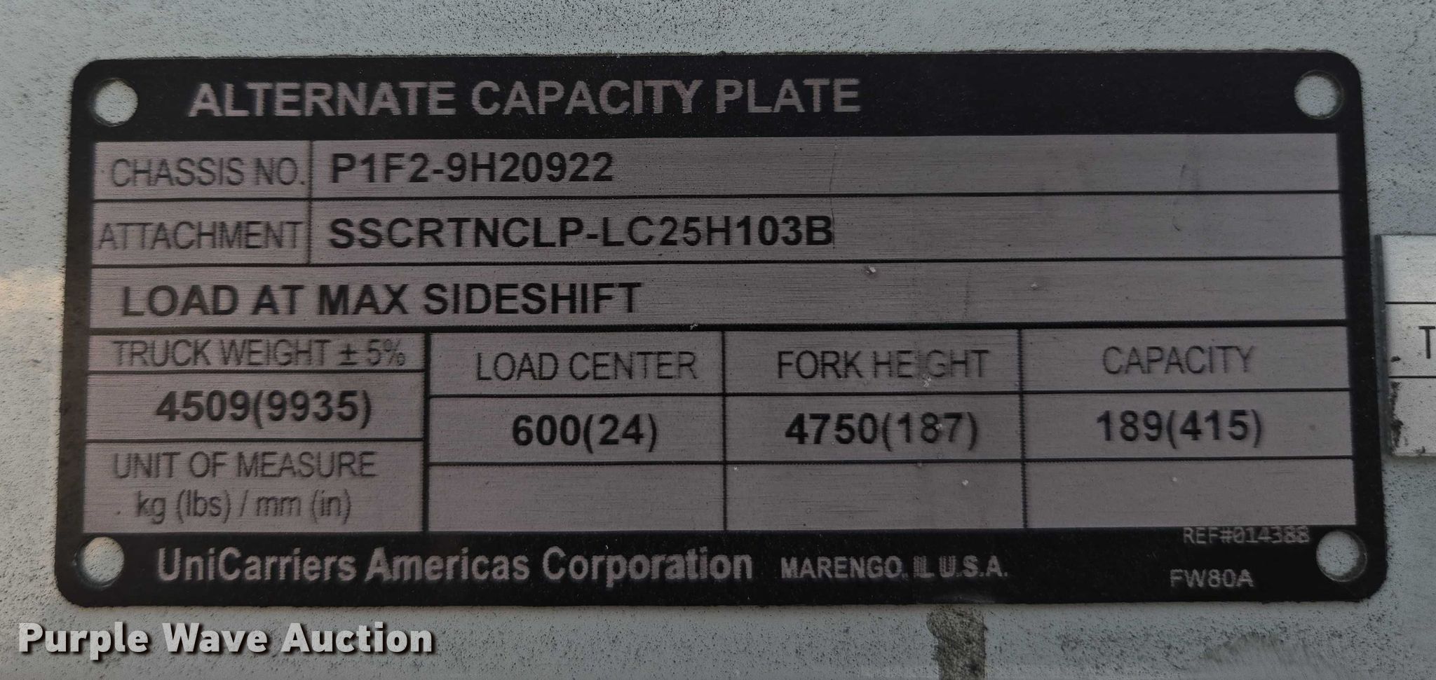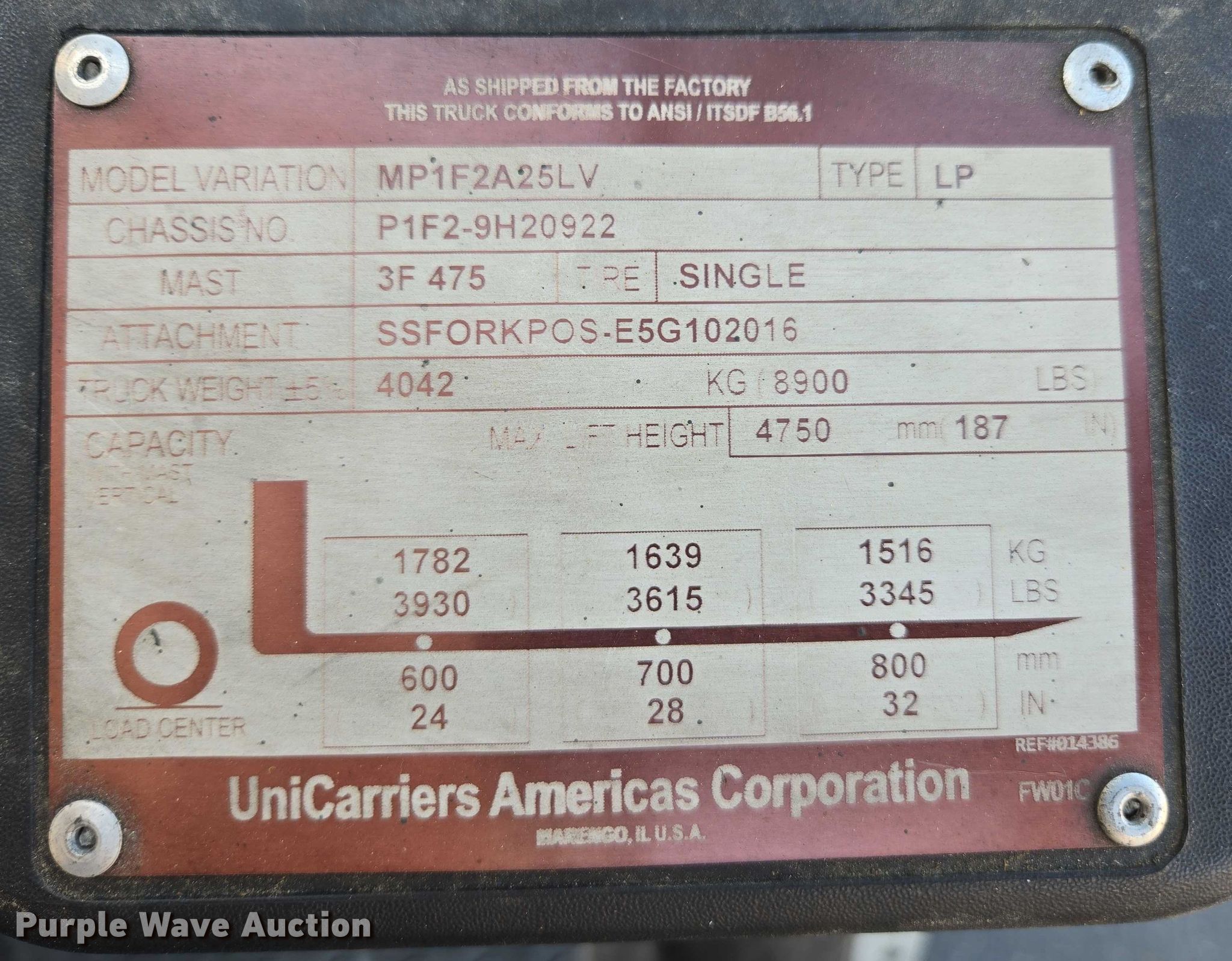 2017 UniCarriers PF50 forklift. Hours: 1,366 on meter, Miles or hours may vary, unit still in use, Serial: P1F2-9H20922, Unit #: SFS2344. Engine GCT, Displacement: 2.1L, Cylinders: 4, Fuel type: LPG LP bottle: Not included. Transmission Automatic. Operators station OROPS, Canopy. Features Maximum lift capacity: 3,930 lbs, Maximum lift height: 187", Collapsed mast height: 80", Mast stages: 3, Side shift, Mast tilt, Fork positioner, Fork length: 48". Tires Front: 7.00-12, Rear: 6.00-9, Solid. Notes Warning indicator: Master warning. Ferguson. Westminster, CA 92683