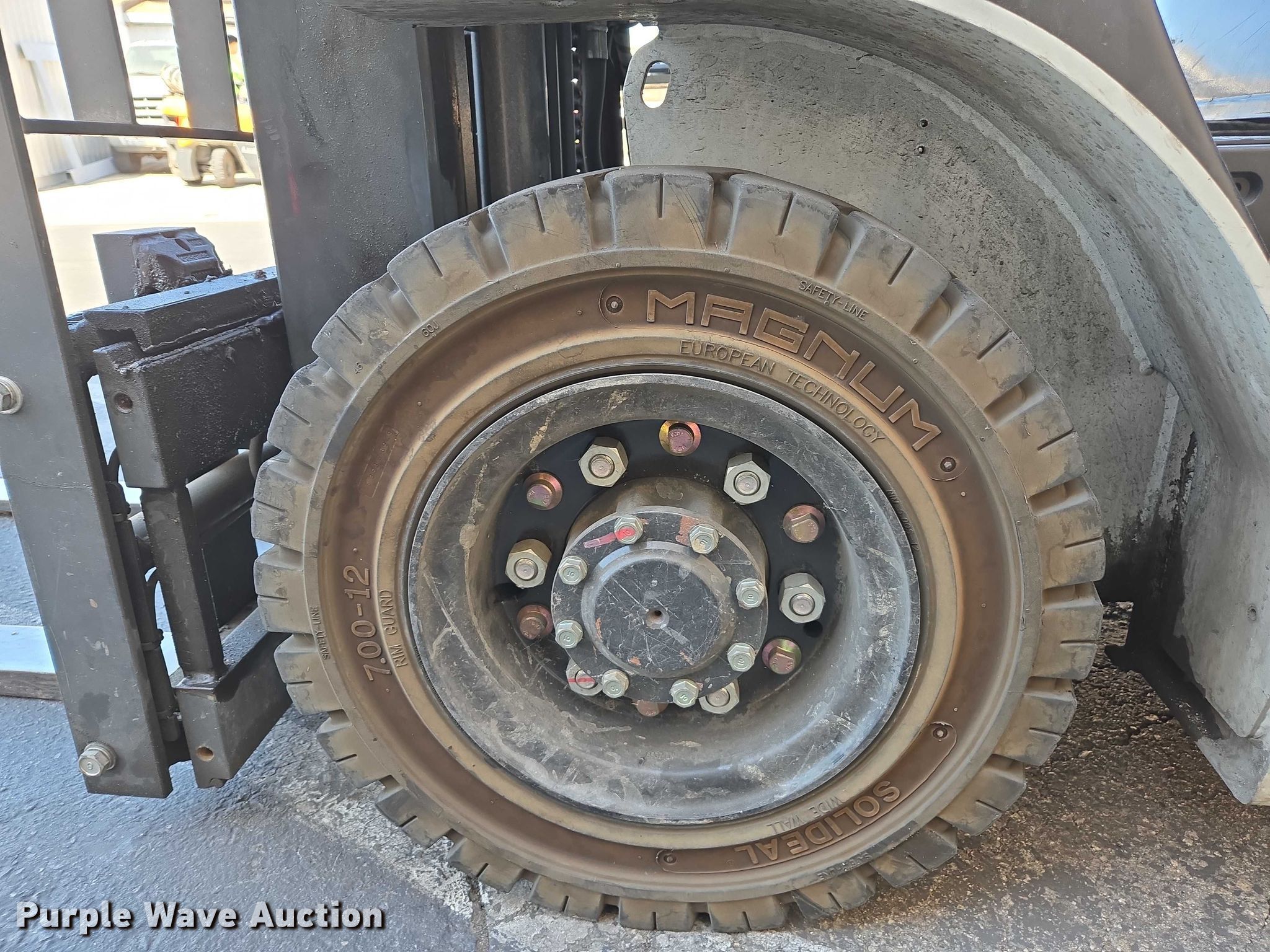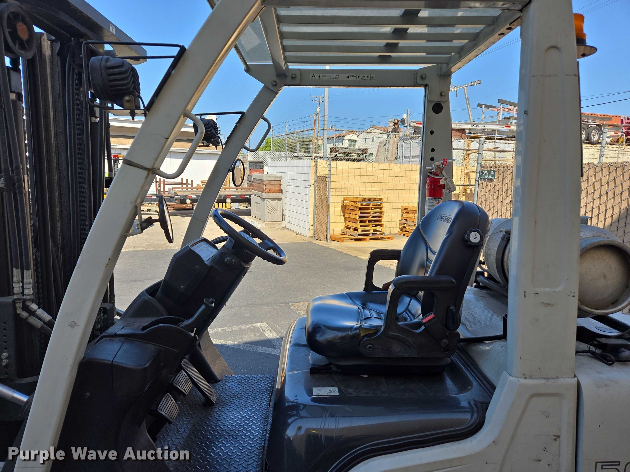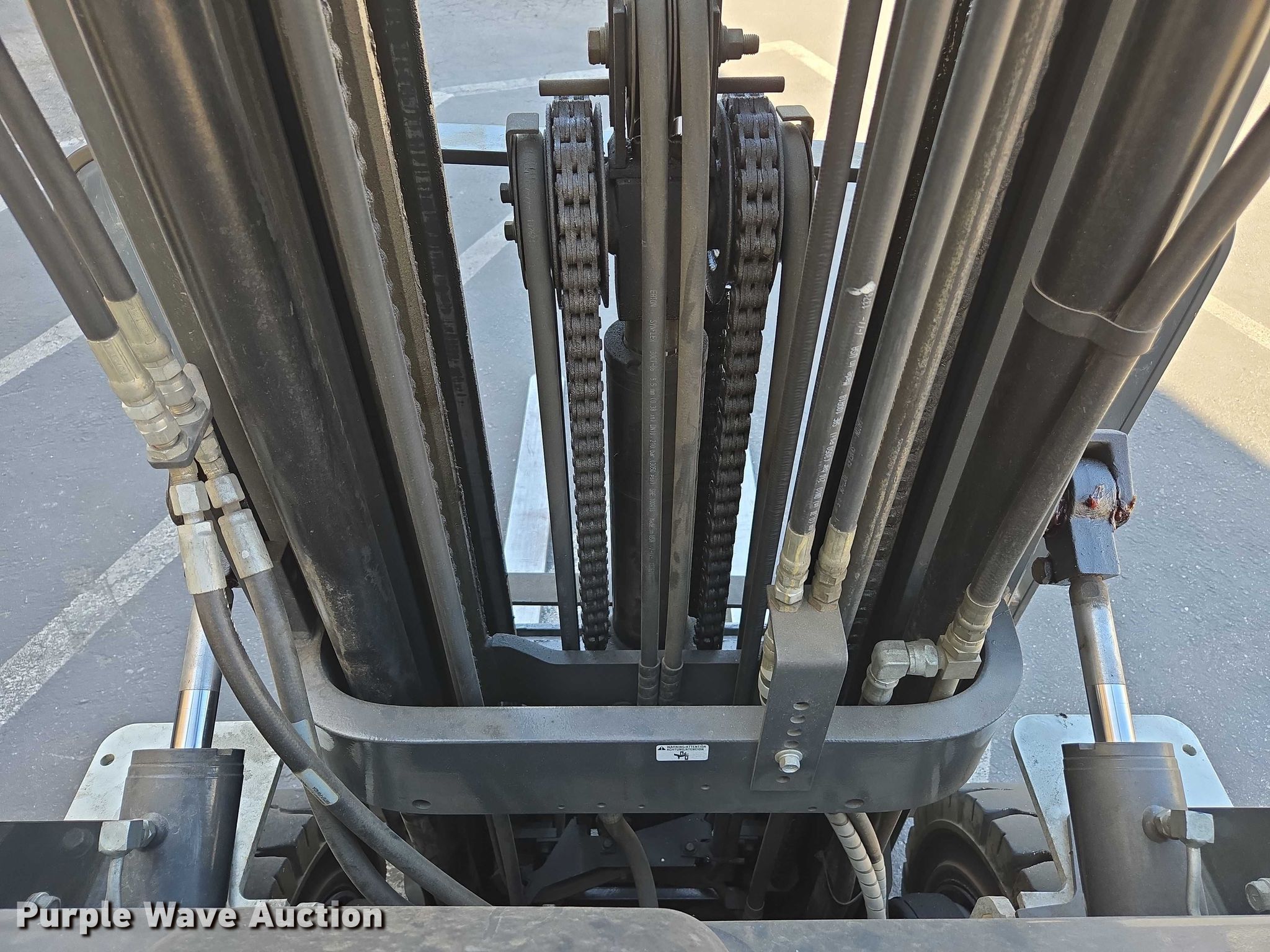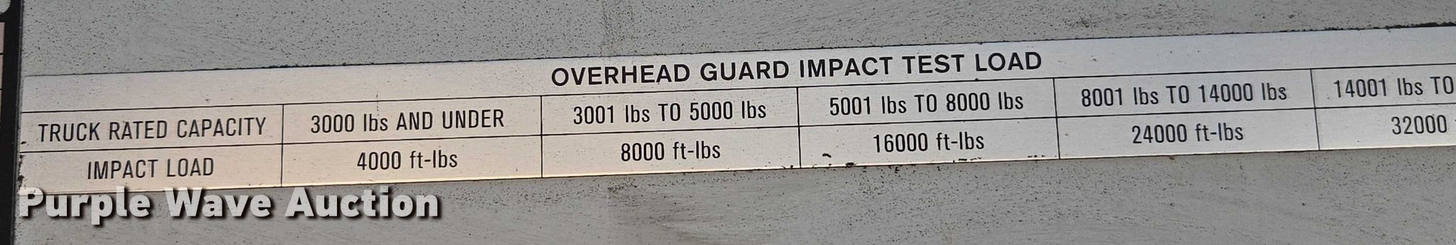 2017 UniCarriers PF50 forklift. Hours: 1,366 on meter, Miles or hours may vary, unit still in use, Serial: P1F2-9H20922, Unit #: SFS2344. Engine GCT, Displacement: 2.1L, Cylinders: 4, Fuel type: LPG LP bottle: Not included. Transmission Automatic. Operators station OROPS, Canopy. Features Maximum lift capacity: 3,930 lbs, Maximum lift height: 187", Collapsed mast height: 80", Mast stages: 3, Side shift, Mast tilt, Fork positioner, Fork length: 48". Tires Front: 7.00-12, Rear: 6.00-9, Solid. Notes Warning indicator: Master warning. Ferguson. Westminster, CA 92683