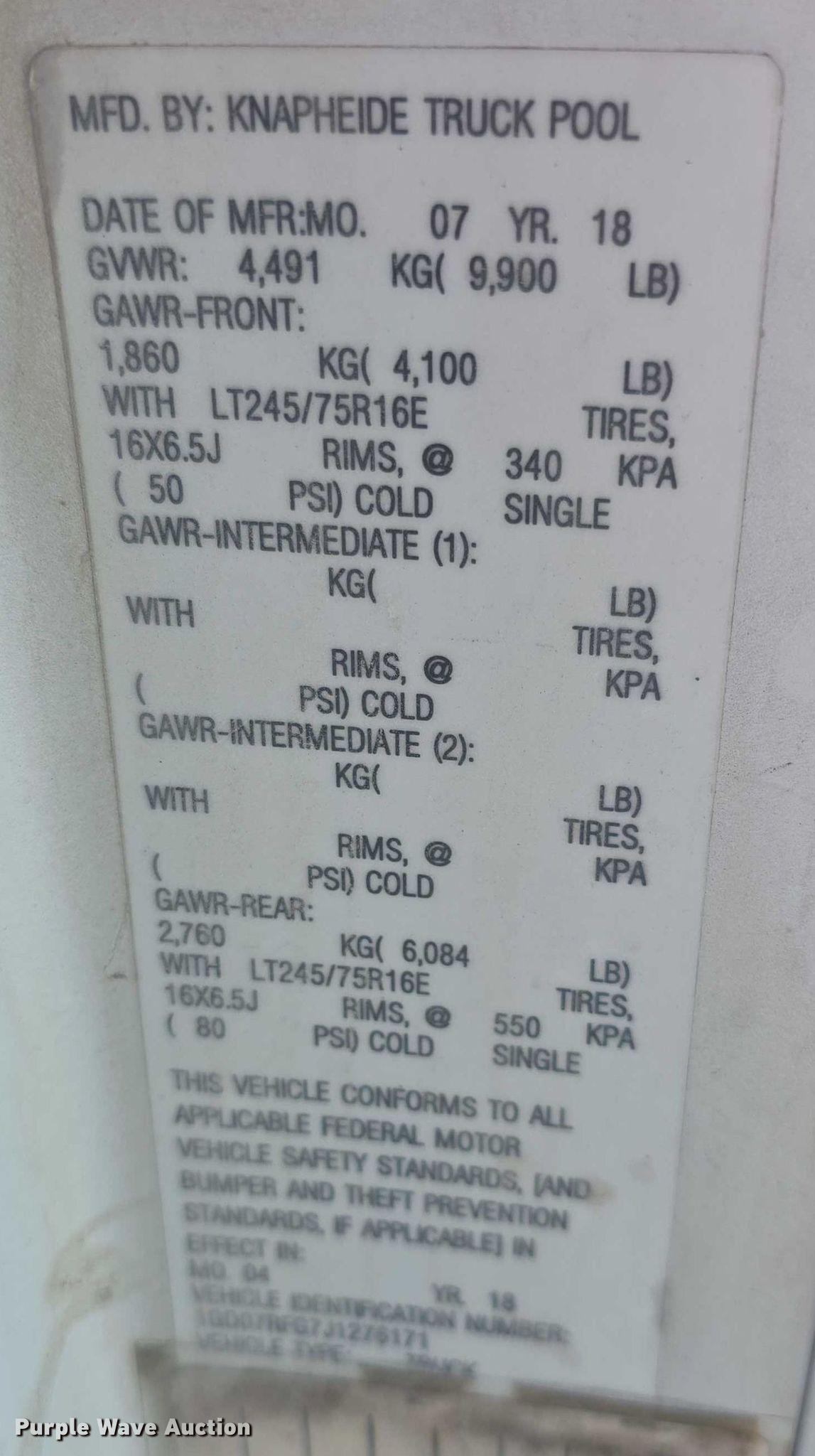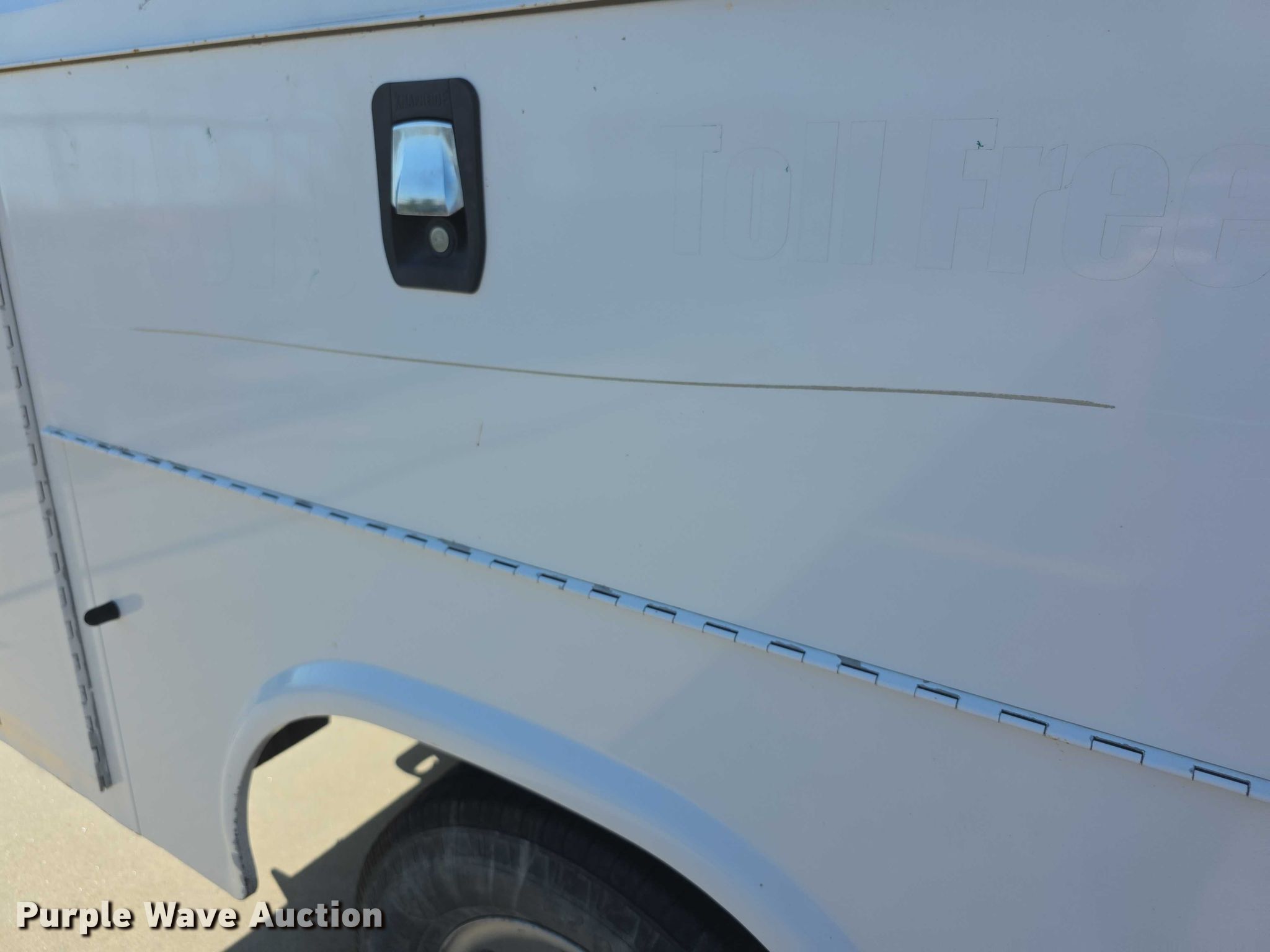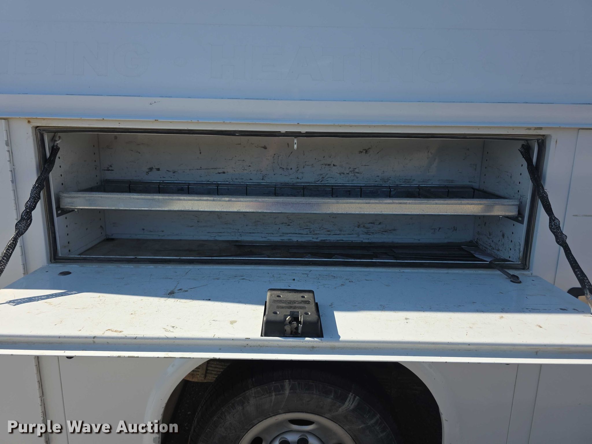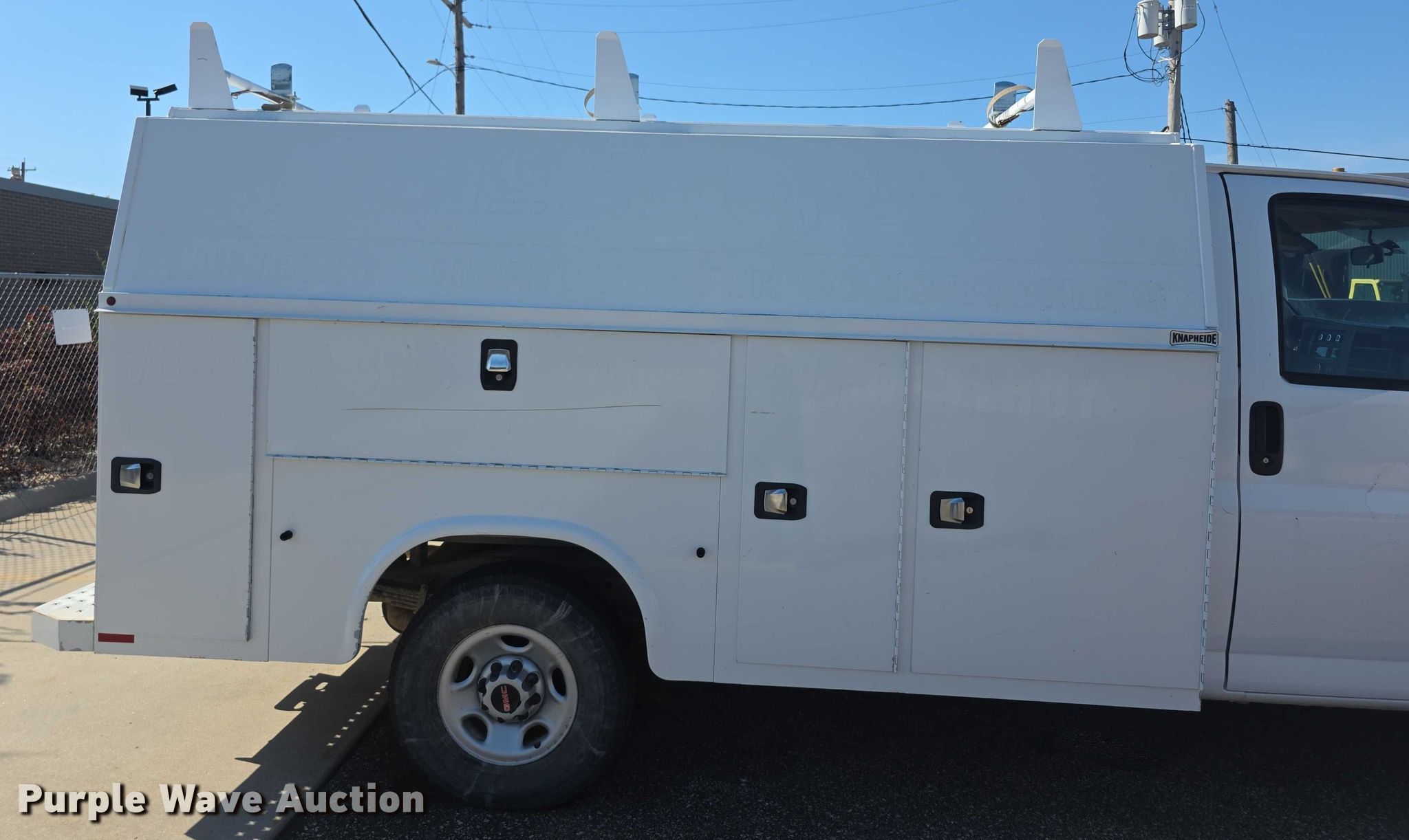 2018 GMC Savana utility van. Miles: 156,564 on odometer, VIN: 1GD07RFG7J1276171, Unit #: 108. Engine Displacement: 6.0L V8 OHV, Cylinders: 8, Fuel type: Gas. Transmission Automatic. Interior AC, Heat, Power windows, Power locks, Cruise control. Features Bed Utility bed, Knapheide KUV129SUTPW, Serial: 201711080544551, Length: 10' 9", Width: 6' 11", Height: 6' 10". Tires Size: 245/75R16. Notes Dash warning indicator: Check engine, Exhaust solenoid issues, needs replaced. Kansas title. Title distribution may be delayed up to 14 days from verification of funds. McElroy's Inc.. Topeka, KS 66611