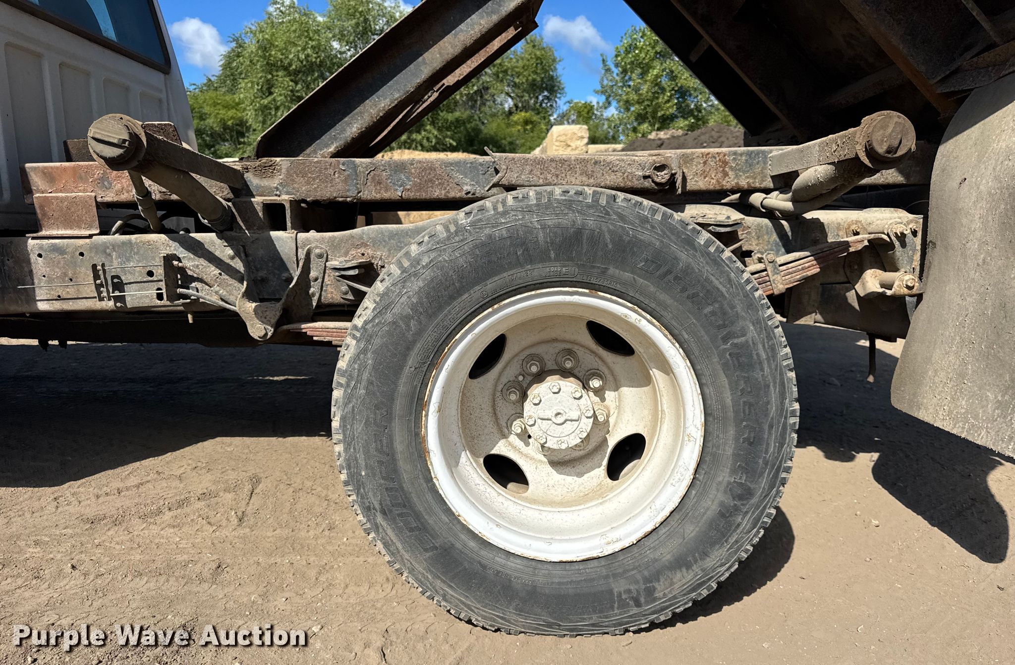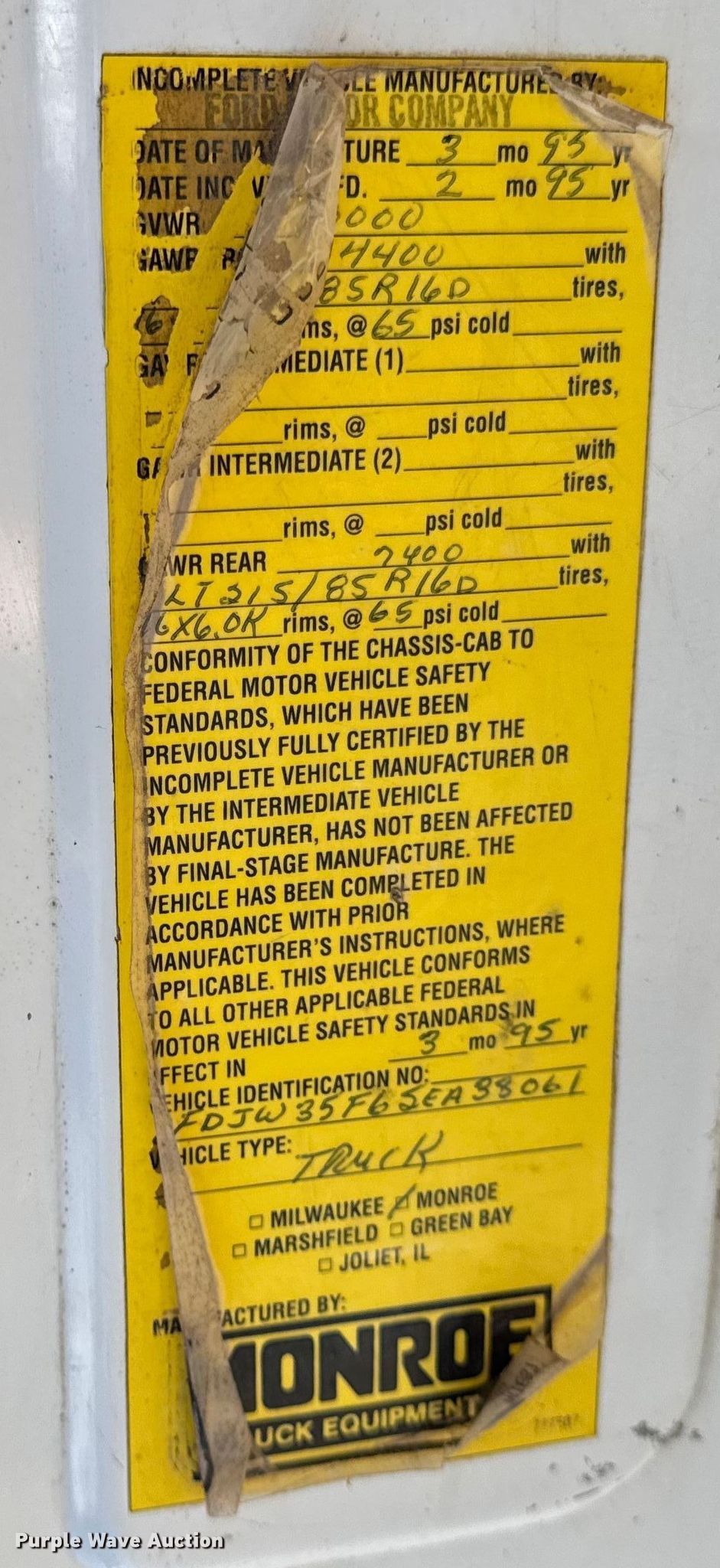 1995 Ford F350 Crew Cab dump bed pickup truck. Miles: 316,175 on odometer, VIN: 1FDJW35F6SEA38061, Unit #: T55. Engine Displacement: 7.3L V8 OHV, Cylinders: 8, Fuel type: Diesel. Transmission Automatic. Interior Heat, Brake controller. Features Bed Dump bed, Monroe, Length: 8', Width: 87", Height: 18", Sideboard 22". Tires Size: 215/85R16. Notes Windshield chipped or cracked. Illinois title. Title distribution may be delayed up to 14 days from verification of funds. Lake Bluff, IL 60044