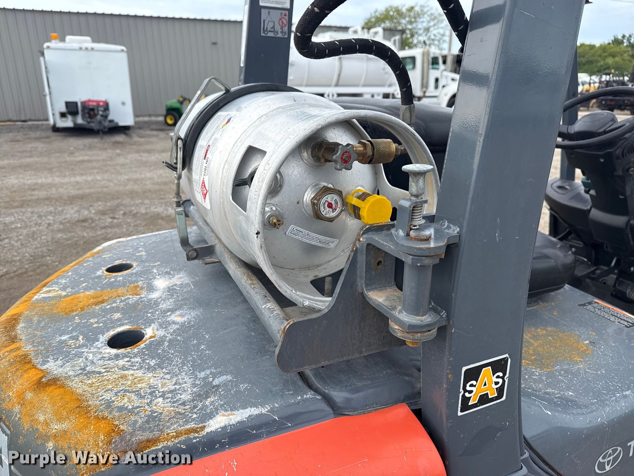 Toyota 8FGU25 forklift. Hours: 11,879 on meter, Serial: 39764. Engine Toyota, Displacement: 2.237L, Cylinders: 4, Fuel type: LPG LP bottle: Included. Transmission Powershift, 1F - 1R. Operators station Canopy. Features Maximum lift capacity: 4,500 lbs, Maximum lift height: 189", Collapsed mast height: 83", Mast stages: 2, Side shift, Mast tilt, Fork length: 48". Tires Front: 7.00-12, Rear: 6.00-9, Solid. Collinsville, OK 74021