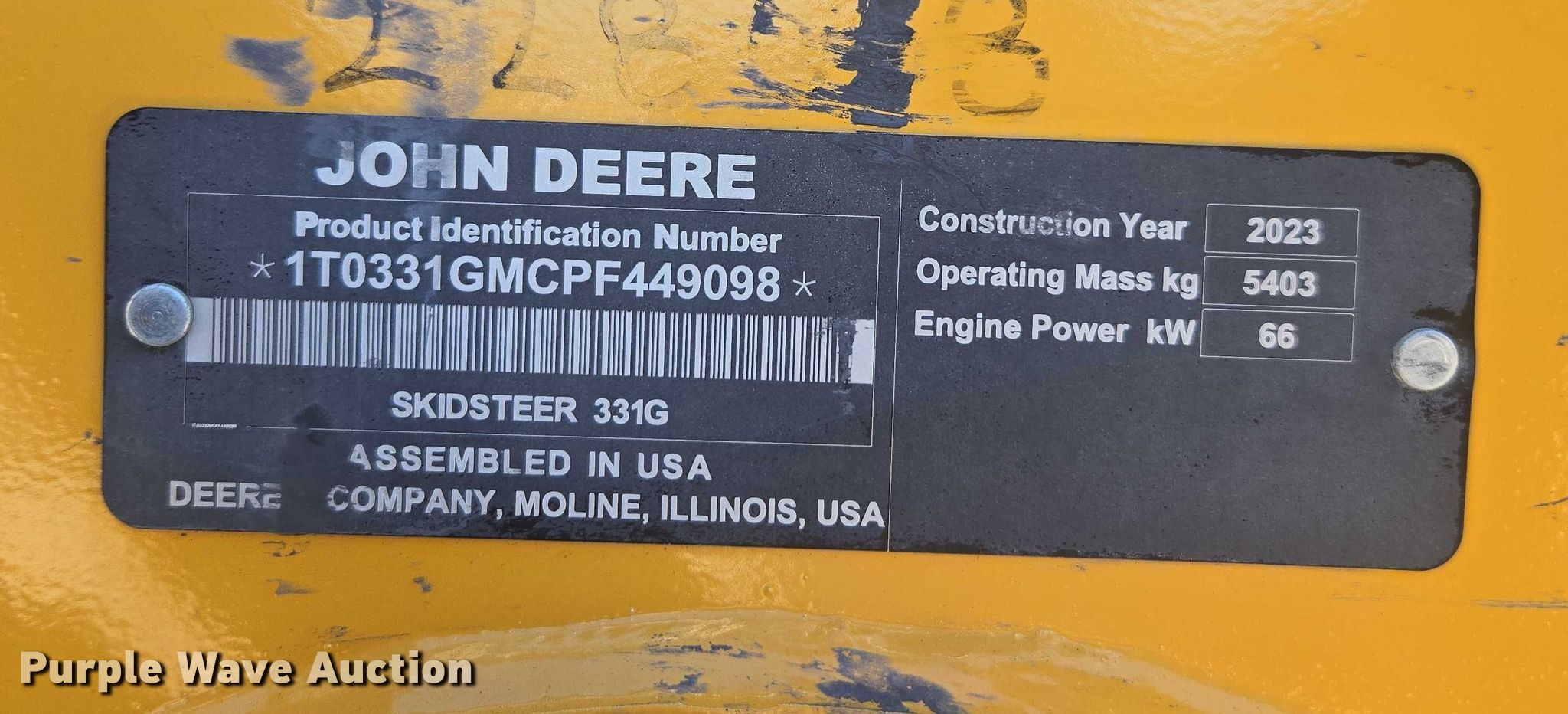2023 John Deere 331G tracked skid steer loader. Hours: 1,228 on meter, Serial: 1T0331GMCPF449098. Engine John Deere, Cylinders: 4, Fuel type: Diesel, kW: 66. Transmission Hydrostatic, Two speed travel. Operators station Enclosed cab, AC, Heat, Bucket control: Hand, Pattern changer. Features Auxiliary hydraulics, Auxiliary electrical outlet, Quick coupler: Hydraulic. Tracks Width: 17". Lease Return. Kansas City, MO 64161