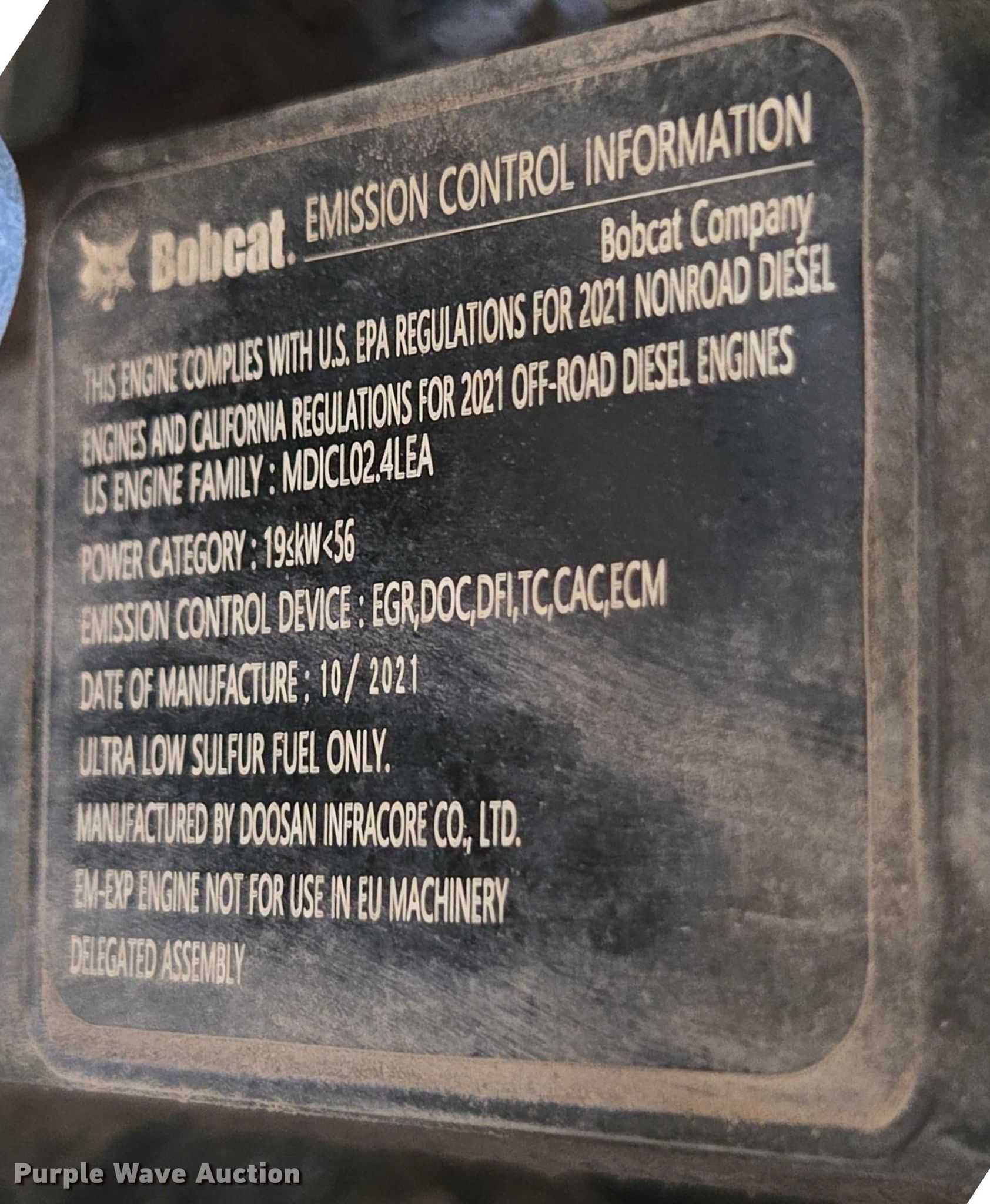 2022 Bobcat S76 skid steer loader. Hours: 1,456 on meter, Serial: BACD15715. Engine Bobcat, Displacement: 2.4L, Cylinders: 4, Fuel type: Diesel. Transmission Hydrostatic, Two speed travel. Operators station Enclosed cab, AC, Heat, Bucket control: Foot, Electronic Monitoring System panel. Features Auxiliary hydraulics, Quick coupler: Manual. Tires Size: 12-16.5. Murphy Tactor & Equipment Co. Grand Island, NE 68803