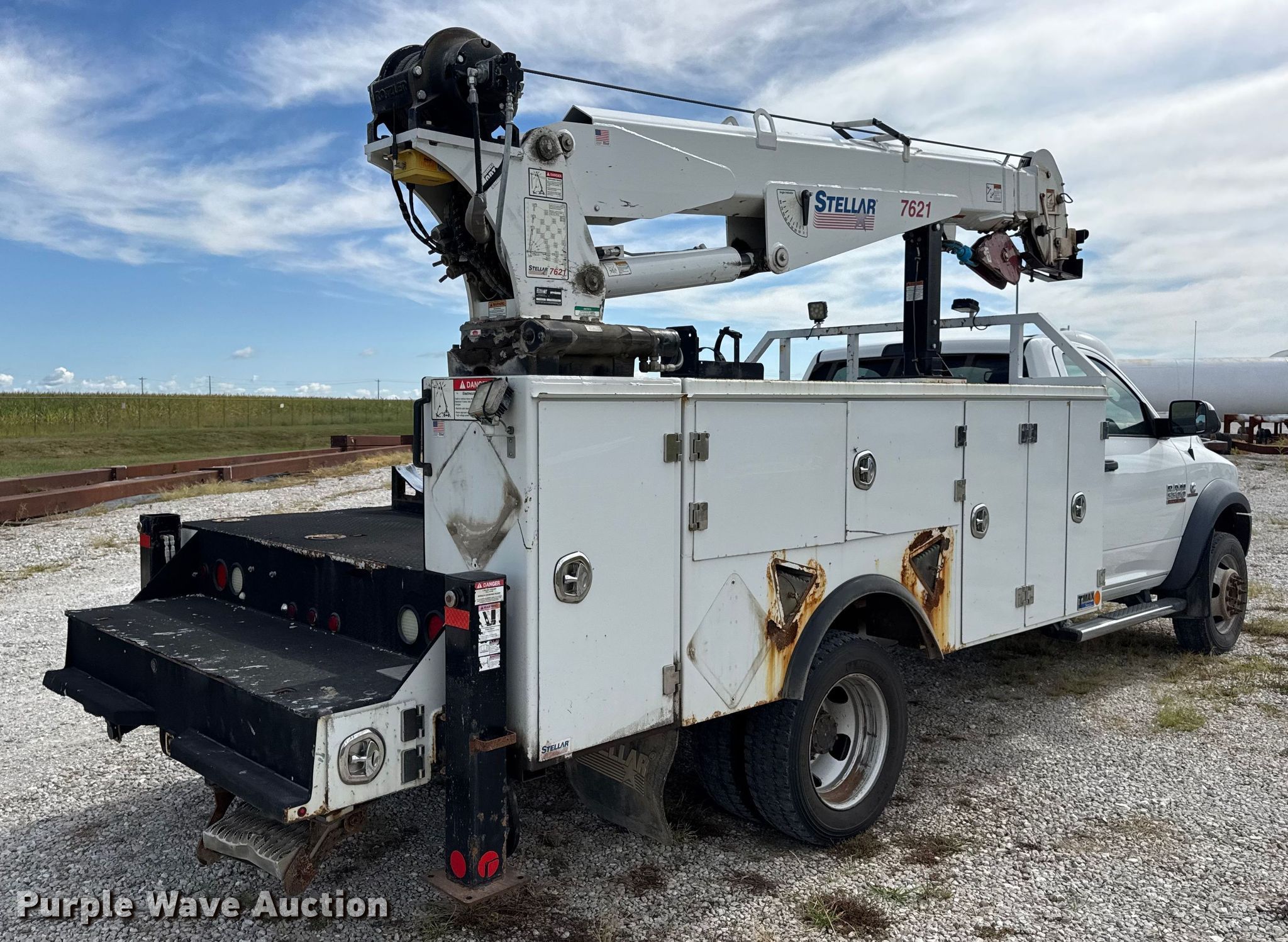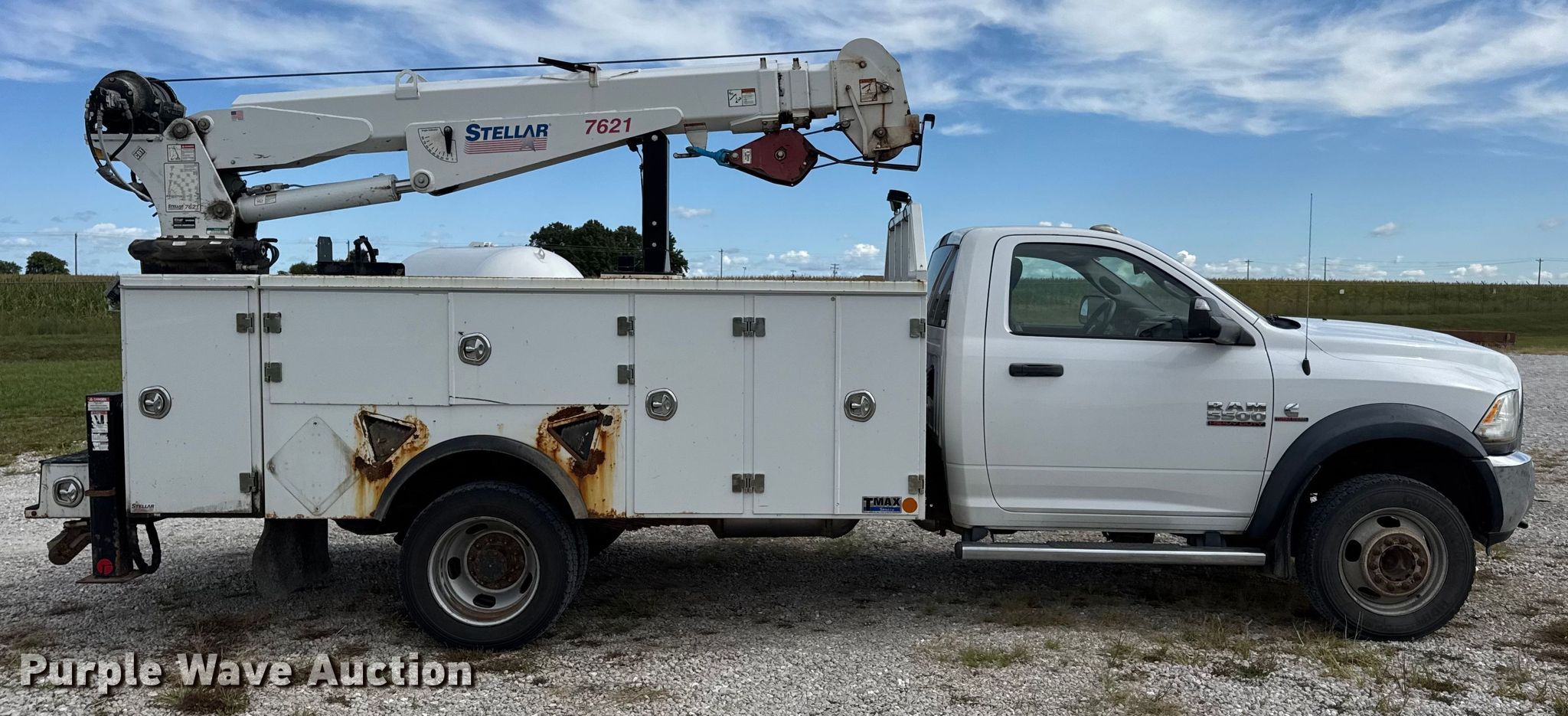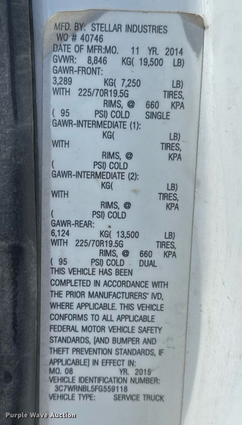 2015 Dodge Ram 5500 utility / service truck. Miles: 205,745 on odometer, VIN: 3C7WRNBL5FG559118. Engine Cummins, Displacement: 6.7L, Cylinders: 6, Fuel type: Diesel. Transmission Automatic. Chassis Four wheel drive, Axles: Single, Suspension: Spring, Brakes: Hydraulic, PTO, GVWR: 19,500 lbs. Interior AC, Heat, Heated mirrors, Power windows, Power locks, Cruise control, Auxiliary controls, Brake controller. Features Bed Stellar TMAXI-LP, Serial: 40746, Length: 12' 1", Width: 96", Crane Stellar 7621, Maximum boom length: 24' Maximum lift capacity: 7,500 lbs.. Tires Size: 225/70R19.5. Notes Dash warning indicator: Check engine, Unknown operating condition of Crane. Missouri title. Title distribution may be delayed up to 30 days from verification of funds. MFA Oil. Moberly, MO 65270