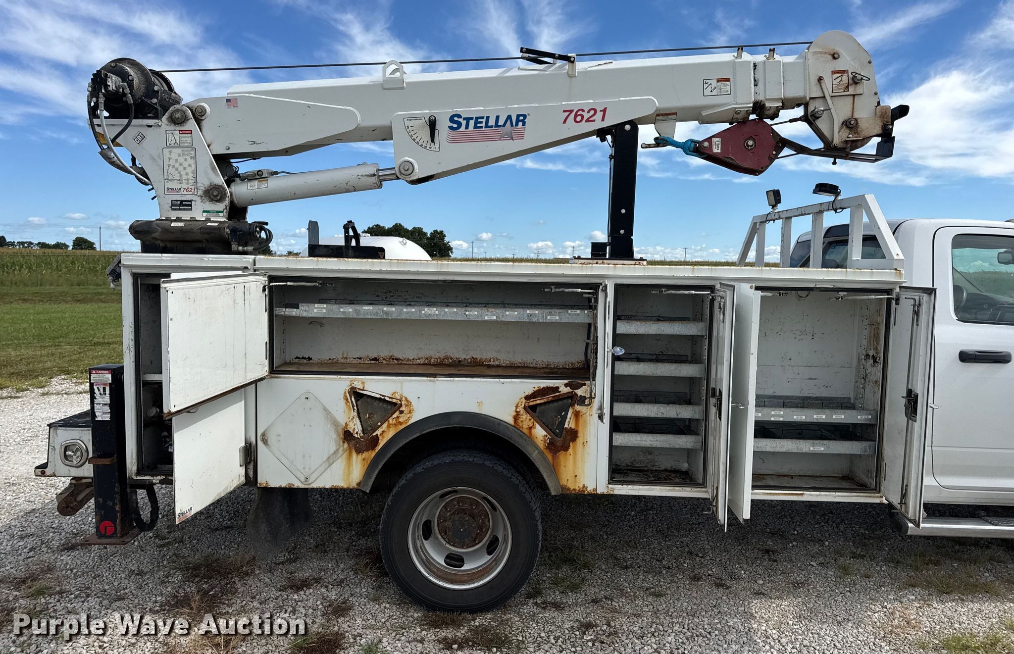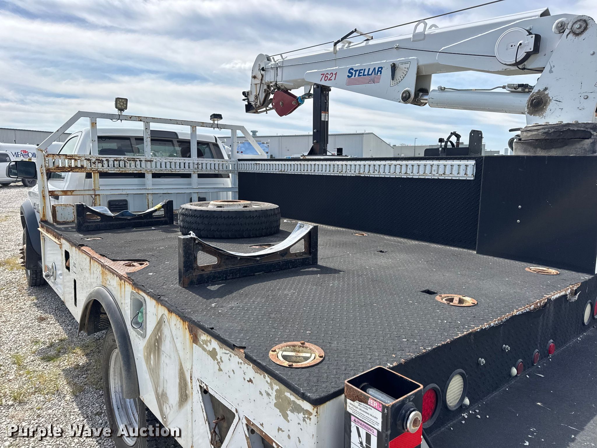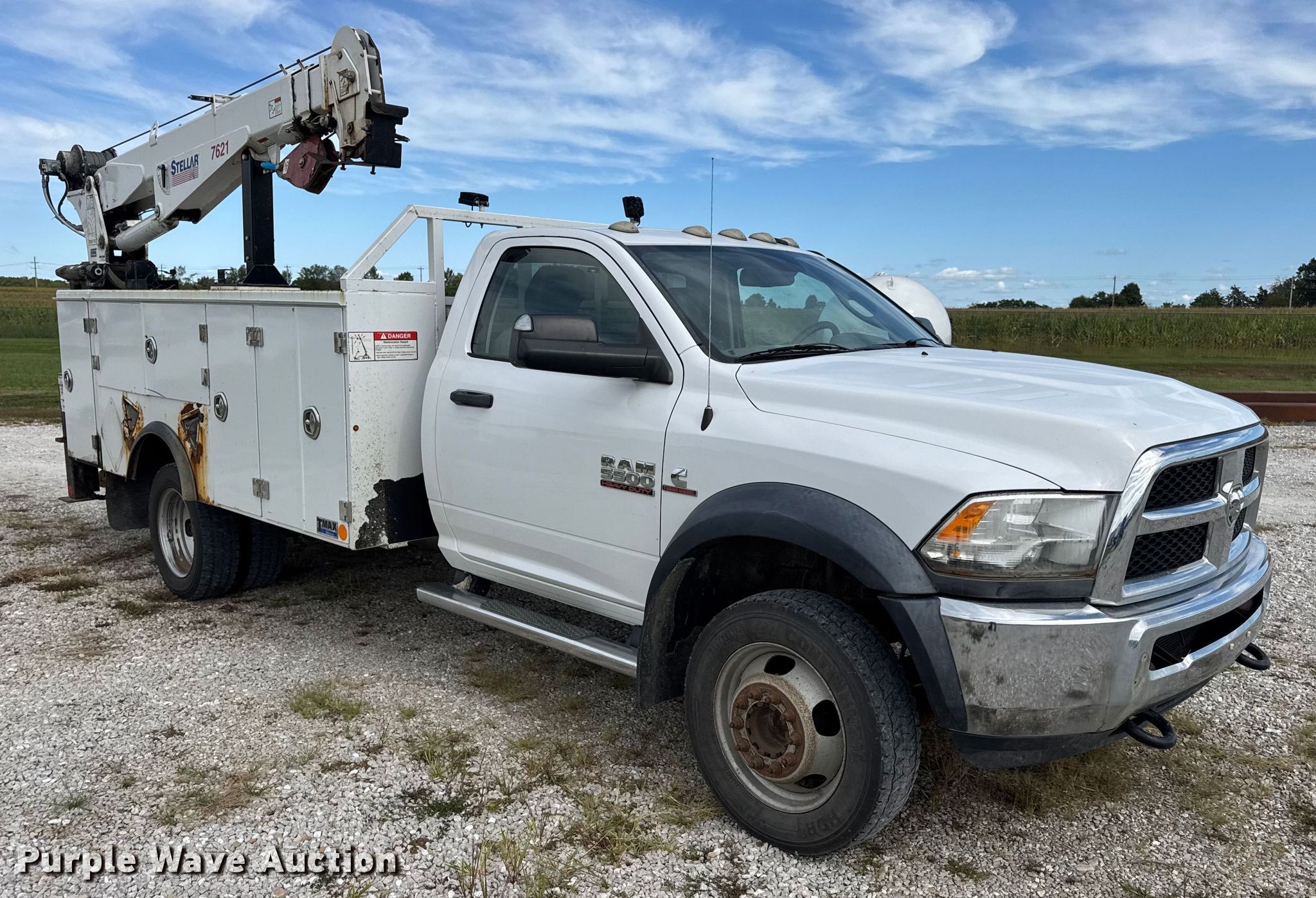 2015 Dodge Ram 5500 utility / service truck. Miles: 205,745 on odometer, VIN: 3C7WRNBL5FG559118. Engine Cummins, Displacement: 6.7L, Cylinders: 6, Fuel type: Diesel. Transmission Automatic. Chassis Four wheel drive, Axles: Single, Suspension: Spring, Brakes: Hydraulic, PTO, GVWR: 19,500 lbs. Interior AC, Heat, Heated mirrors, Power windows, Power locks, Cruise control, Auxiliary controls, Brake controller. Features Bed Stellar TMAXI-LP, Serial: 40746, Length: 12' 1", Width: 96", Crane Stellar 7621, Maximum boom length: 24' Maximum lift capacity: 7,500 lbs.. Tires Size: 225/70R19.5. Notes Dash warning indicator: Check engine, Unknown operating condition of Crane. Missouri title. Title distribution may be delayed up to 30 days from verification of funds. MFA Oil. Moberly, MO 65270