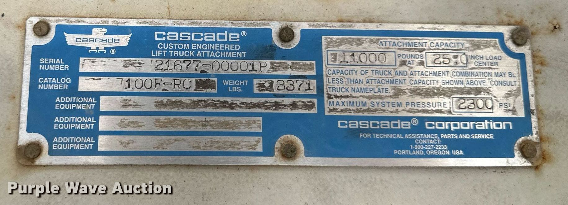 Purple Wave is selling a used Forklift Attach. in Minnesota. This item is a Cascade forklift clamp with the following: Serial: 21677-00001P, Jaw width: 40�, Capacity: 11,000 lbs