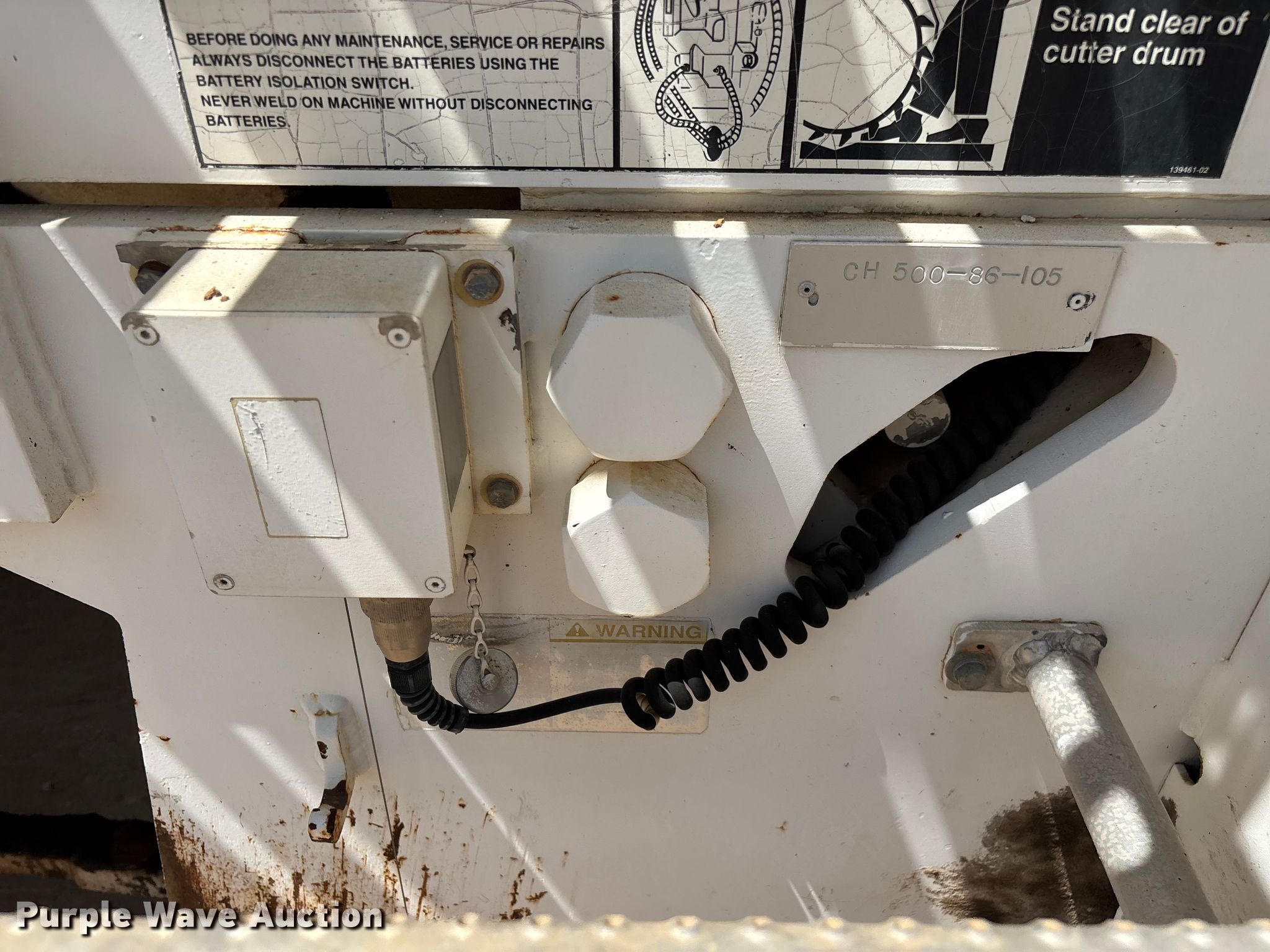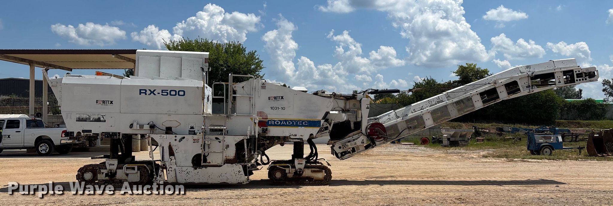 2003 Roadtec RX500-4 milling machine. Hours: Unknown, Serial: RX5004114, Unit #: 1031-10. Engine Cummins QSX15-C600, Serial: 79045136, Cylinders: 6, Fuel type: Diesel, HP: 600. Transmission Hydrostatic. Features Cutting head Width: 86", Diameter: 42", Teeth, Water/emulsion application system, Grade & slope controls, Ground controls, Discharge conveyor 25' L x 32" W. Tracks Width: 12", Rubber, Steel. Notes Non-operational hour meter, Non-operational instrument cluster, Possible slope control issues, Possible grade control issues, Contents not included, Non-operational conveyor, electrical issues, Non-operational left engine hood latch, will not close, Blade shield door issues, stuck, Jump start required during on-site data collection. Grant Garrett Excavating. Rogers, AR 72758