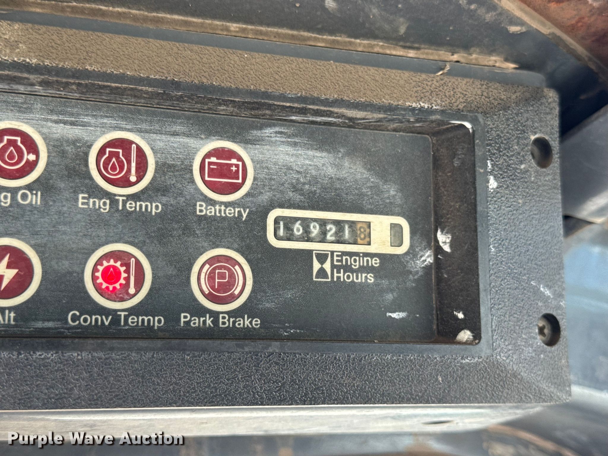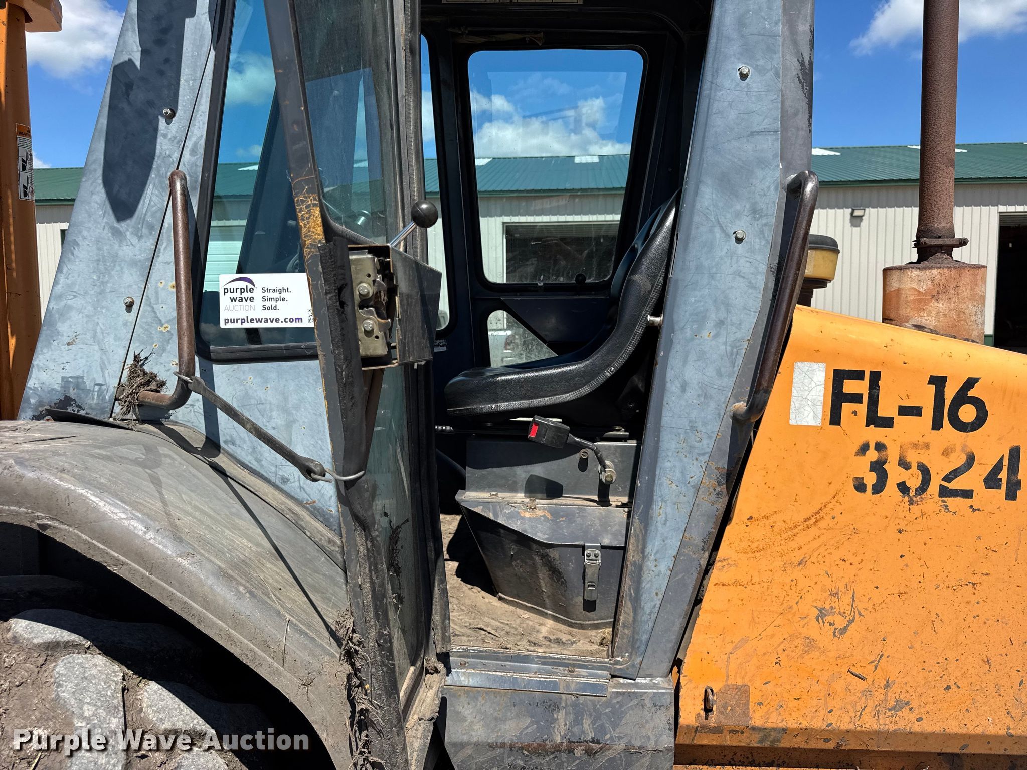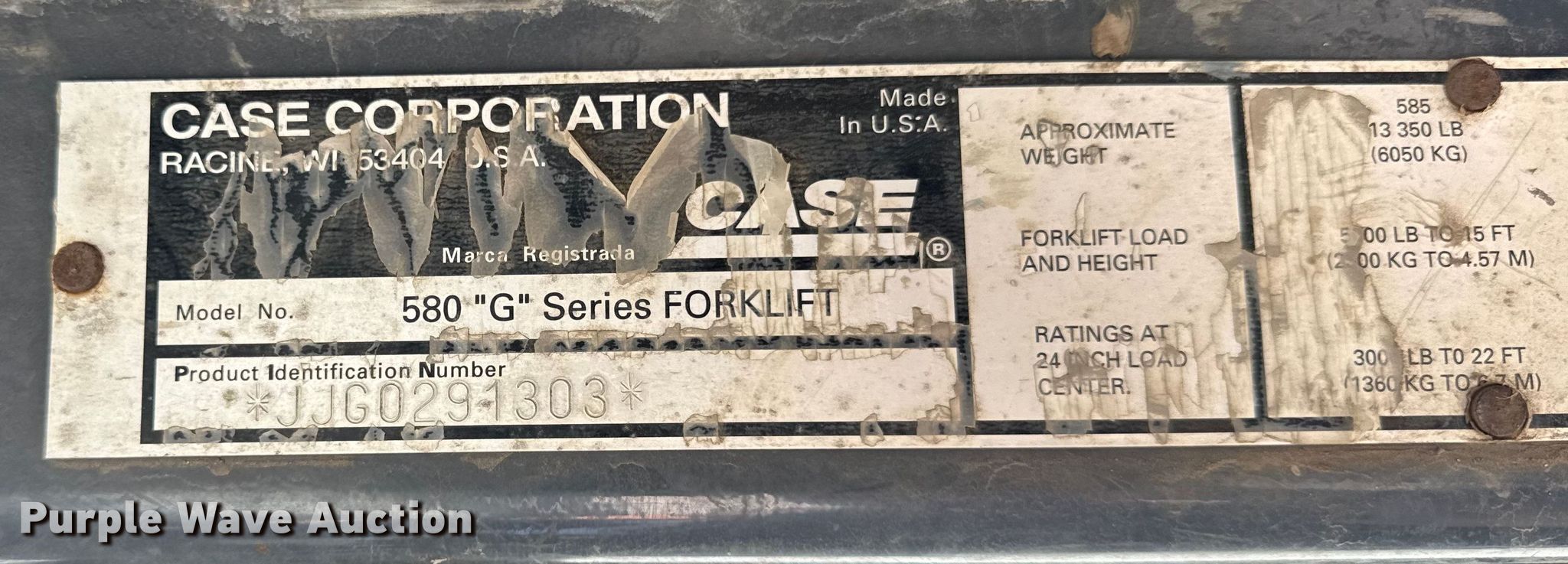 2006 Case 586G forklift. Hours: 16,921 on meter, Serial: JJG0293500. Engine Case, Displacement: 3.9L, Cylinders: 4, Fuel type: Diesel. Transmission Manual, Shuttle shift, 4F - 4R. Chassis Four wheel drive. Operators station Enclosed cab. Features Maximum lift capacity: 6,000 lbs, Maximum lift height: 264", Collapsed mast height: 127", Mast stages: 3, Side shift, Mast tilt, Fork length: 46". Tires Front: 19.5L-24, Rear: 12-16.5. Central Sod Farm Inc. Newark, IL 60541