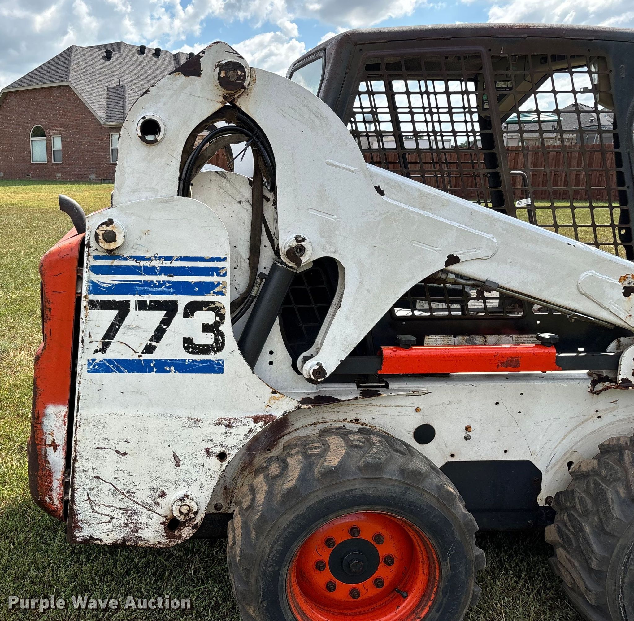 2000 Bobcat 773 skid steer loader. Hours: 3,418 on meter, Serial: 519011955. Engine Kubota V2003-TE, Displacement: 2.0L, Cylinders: 4, Fuel type: Diesel, kW: 44.5. Transmission Hydrostatic. Operators station Bucket control: Foot. Features Auxiliary hydraulics, Quick coupler: Manual, Bucket Width: 74", Cutting edge: Bolt-on. Tires Size: 10-16.5. Top Tier Equipment Sales LLC. Springfield, MO 65802