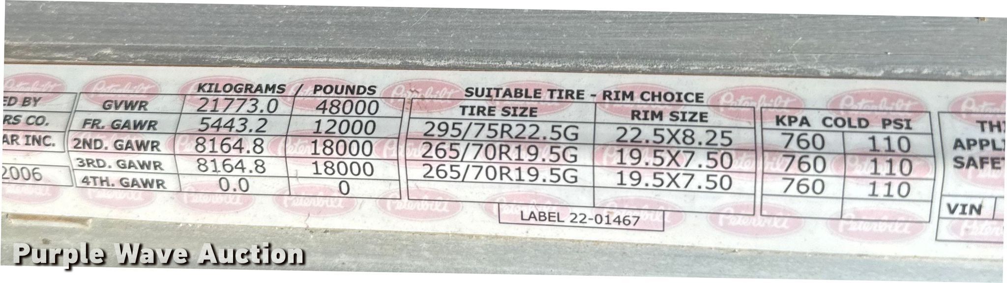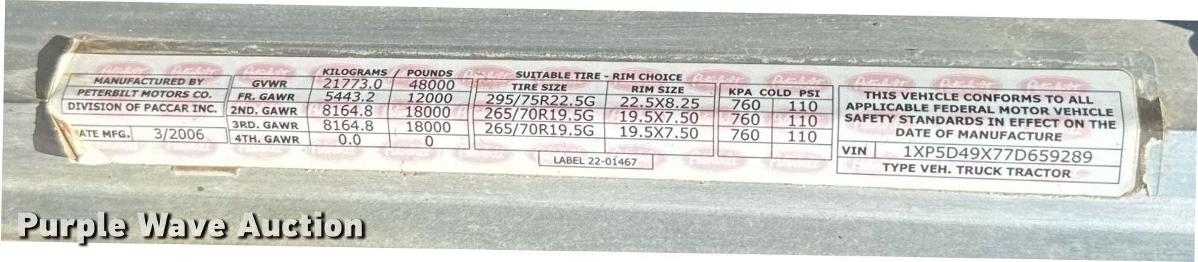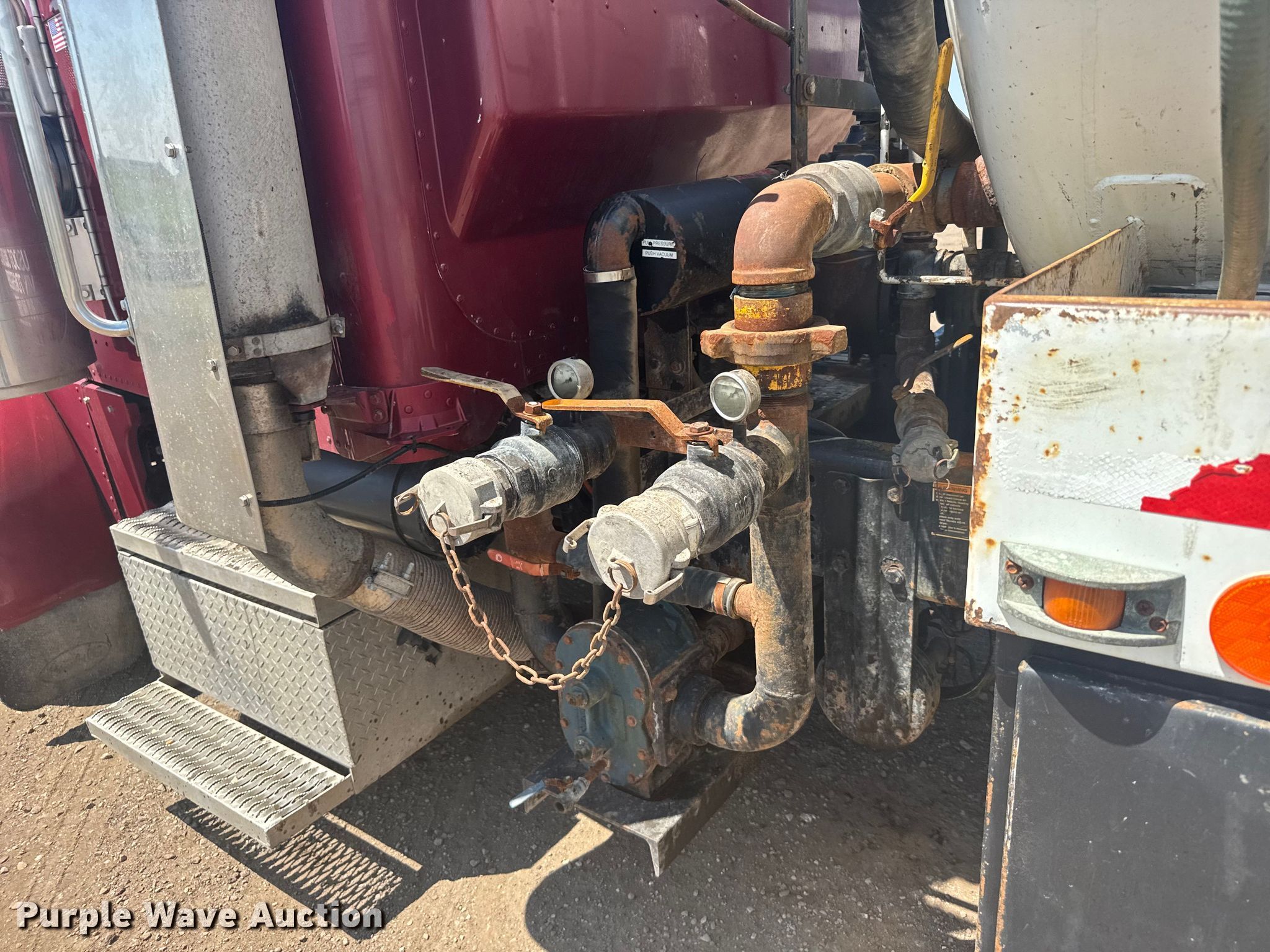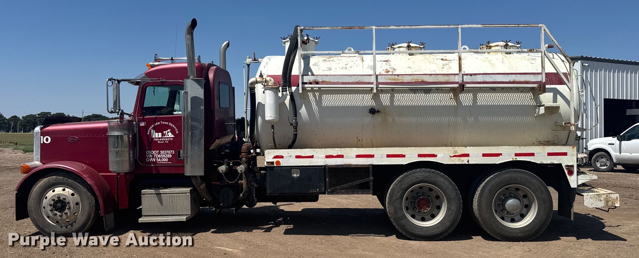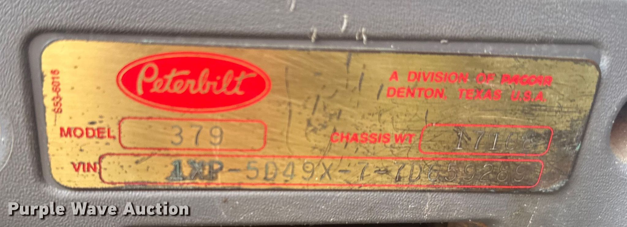 2007 Peterbilt 379 vacuum truck. Miles: 1,038,731 on odometer, Hours: 32,278 on meter, VIN: 1XP5D49X77D659289. Engine Cummins, Serial: 26038731, Displacement: 14.9L, Cylinders: 6, Fuel type: Diesel. Transmission Eaton Fuller, Manual, Speed: 13. Chassis Axles: Tandem, Differential lock: Inter-axle, Suspension: Air, Brakes: Air, PTO, GVWR: 48,000 lbs. Interior AC, Heat, Power windows, Power locks, Cruise control. Features Bed Tank bed, Length: 17' 5", Width: 96", Capacity: 3,360 gallons, Sight tube, Rear outlet: 4", (2) pumps Bowie, Masport. Tires Size: 11R24.5. Notes Dash warning indicator: Check engine. Kansas electronic title. Title has a lien that will be released following the close of the auction. A paper title will be printed once the lien is released. Title distribution may be delayed up to 30 days from verification of funds. Schneider Tank Service. Russell, KS 67665
