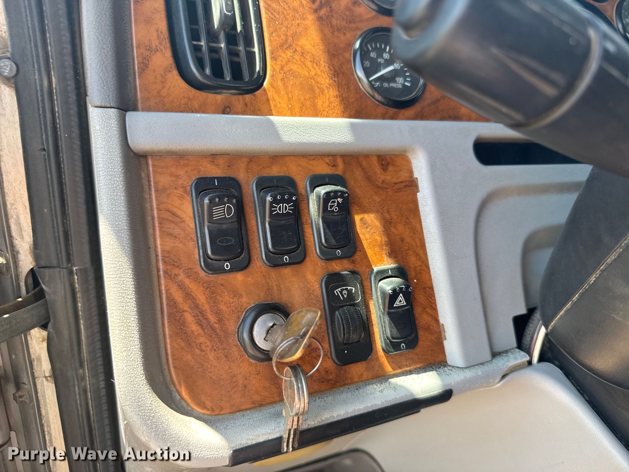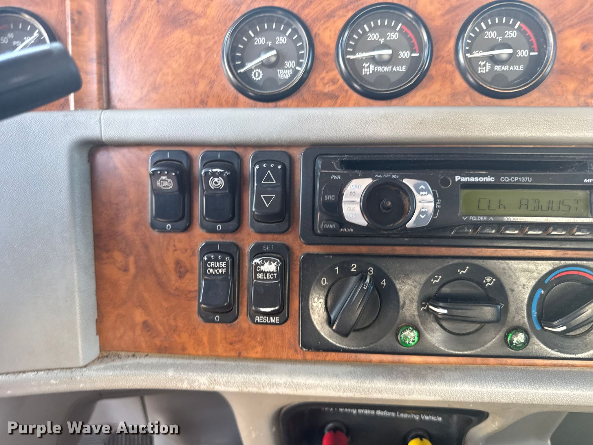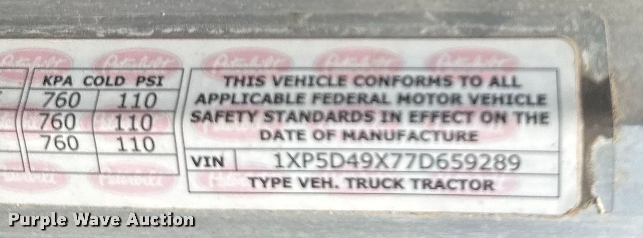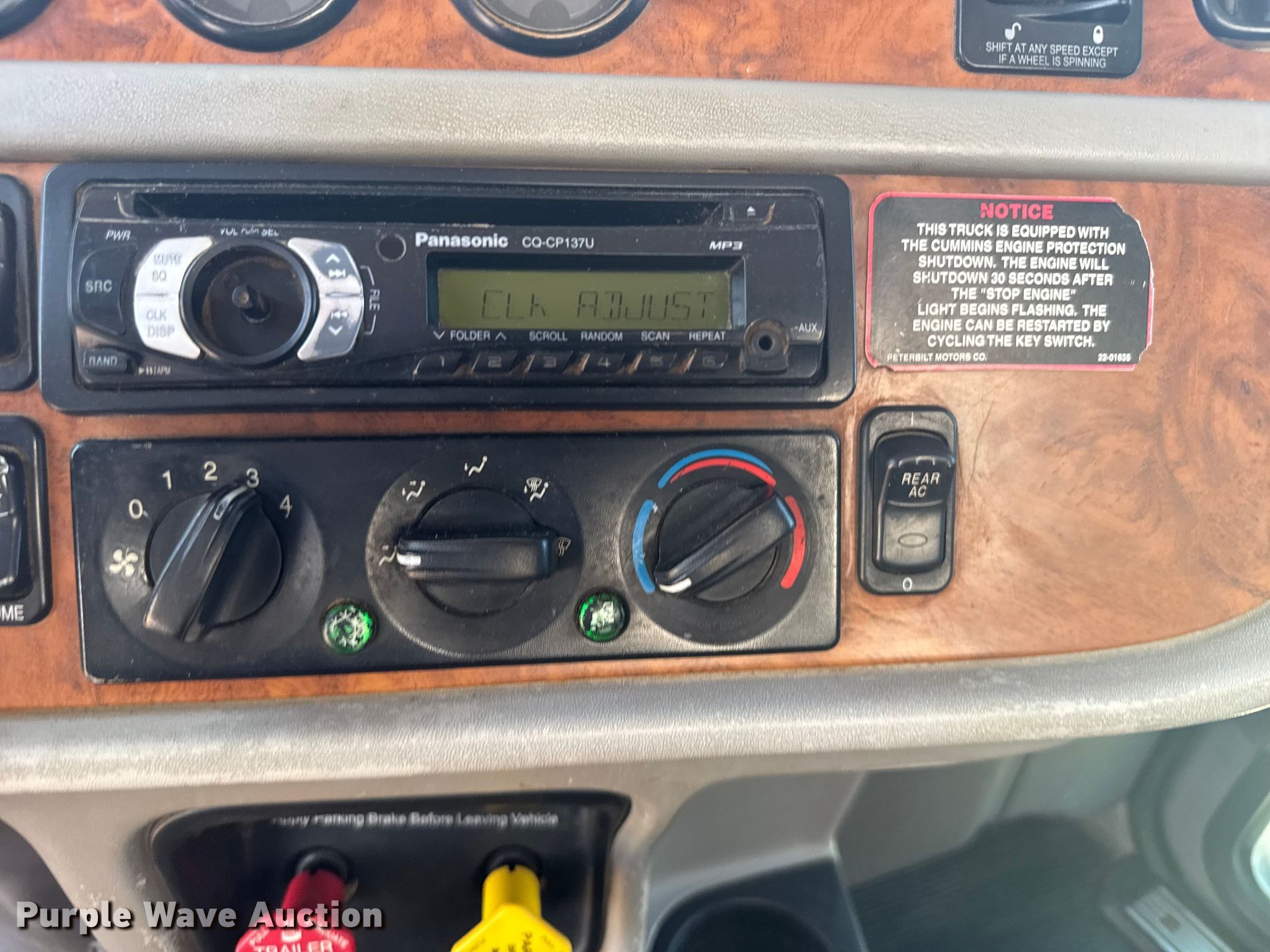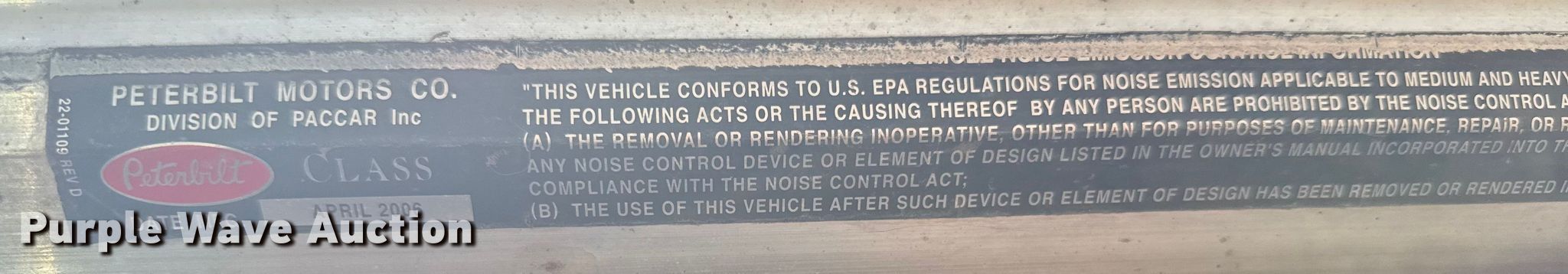 2007 Peterbilt 379 vacuum truck. Miles: 1,038,731 on odometer, Hours: 32,278 on meter, VIN: 1XP5D49X77D659289. Engine Cummins, Serial: 26038731, Displacement: 14.9L, Cylinders: 6, Fuel type: Diesel. Transmission Eaton Fuller, Manual, Speed: 13. Chassis Axles: Tandem, Differential lock: Inter-axle, Suspension: Air, Brakes: Air, PTO, GVWR: 48,000 lbs. Interior AC, Heat, Power windows, Power locks, Cruise control. Features Bed Tank bed, Length: 17' 5", Width: 96", Capacity: 3,360 gallons, Sight tube, Rear outlet: 4", (2) pumps Bowie, Masport. Tires Size: 11R24.5. Notes Dash warning indicator: Check engine. Kansas electronic title. Title has a lien that will be released following the close of the auction. A paper title will be printed once the lien is released. Title distribution may be delayed up to 30 days from verification of funds. Schneider Tank Service. Russell, KS 67665