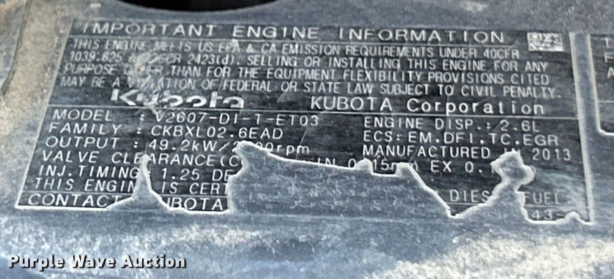 2013 Bobcat T590 tracked skid steer loader. Hours: 4,216 on meter, Serial: A3NR13477. Engine Kubota, Displacement: 2.6L, Cylinders: 4, Fuel type: Diesel. Transmission Hydrostatic. Operators station OROPS, Bucket control: Foot, Electronic Monitoring System panel. Features Auxiliary hydraulics, Auxiliary electrical outlet, Quick coupler: Hydraulic, Bucket Bobcat, Width: 67". Tracks Width: 12". Notes Jump start required during on-site data collection. Craig and Son Concrete. Wentzville, MO 63385