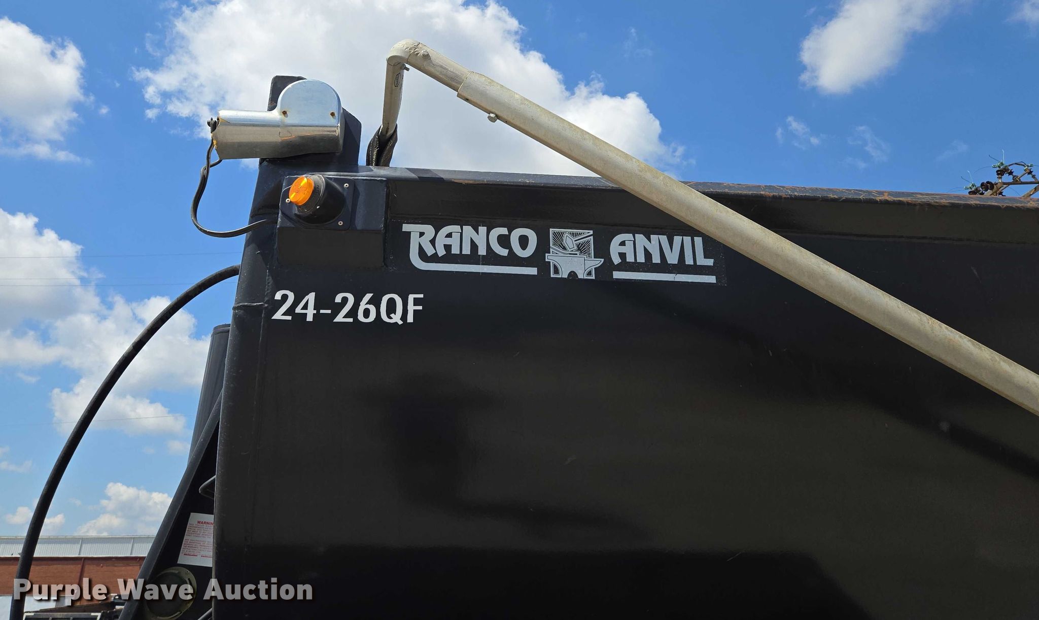 2014 Ranco Anvil 24-26QF end dump trailer. VIN: 1D9SD2628ER661051. Dimensions Overall Length: 26', Width: 102", Body Length: 24', Width: 92", Side height: 60". Features Body type: Steel, Ram: Single, End gate: Air operated, Roll tarp. Chassis Landing gear: Dual, Suspension: Walking beam, Brakes: Air, Axles: Tandem, GVWR: 70,000 lbs, GAWR: 20,000 lbs. Tires Steel wheels, Size: 11R24.5. Notes Unknown operating condition of roll tarp, Truck not included. Missouri title. Title distribution may be delayed up to 14 days from verification of funds. R & B Trucking. Kansas City, KS 66105