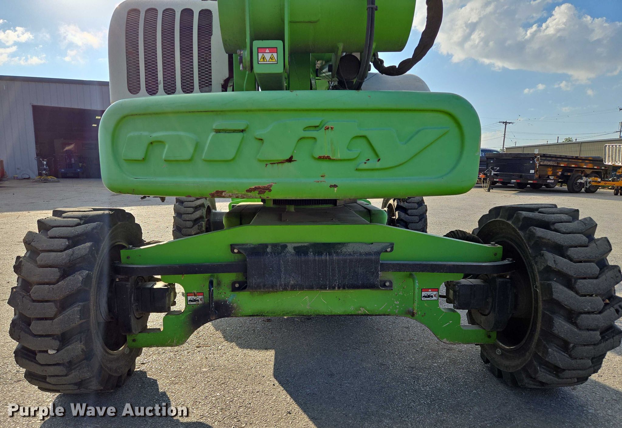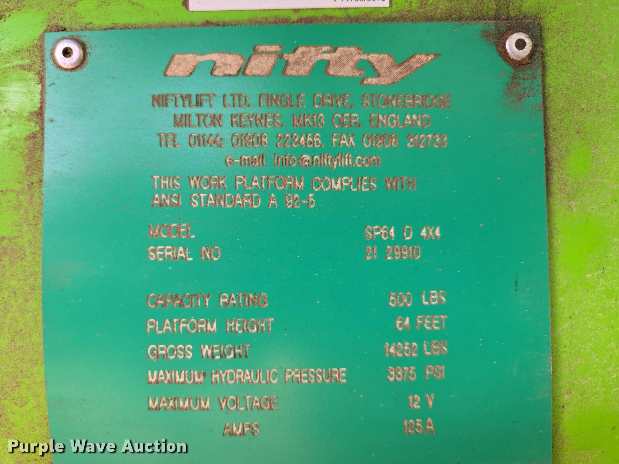 Nifty SP64 boom lift. Hours: Unknown, Serial: 21 29910. Engine Kubota V1505, Serial: 1EC9191, Cylinders: 4, Fuel type: Diesel. Chassis Four wheel drive. Features Rough terrain, Boom type: Articulating, Telescopic, Maximum lift capacity: 500 lbs, Maximum lift height: 64', Hydraulic leveling, Platform: 70" L x 32" W, Controls: Platform, Ground, Platform rotation: Hydraulic. Tires Tire size: 33x12-20, Solid. Notes Hole in fuel tank Will be replaced prior to auction, Unknown operating condition of hour meter. This is worksite support equipment and will not come with a title. Transfer of ownership documentation will be a bill of sale. Platte Rental & Supply. Parkville, MO 64152