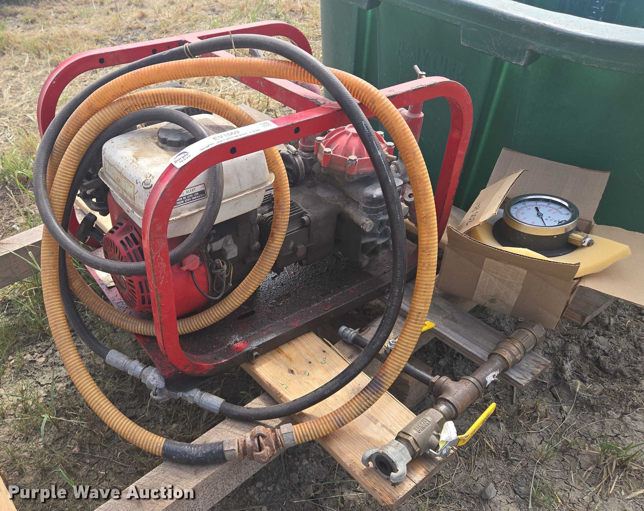 Purple Wave is selling a used Pump in Kansas. This item is a Hydrostatic test pump with the following: Honda GX160, Cylinders: 1, Fuel type: Gas, HP: 5.5