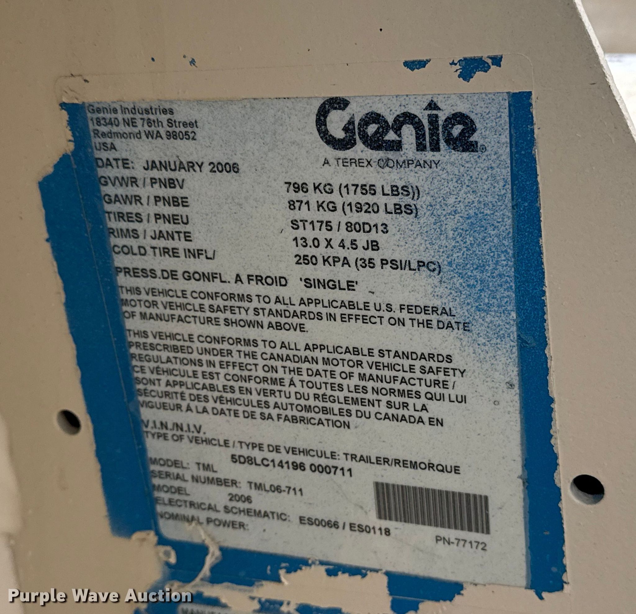 Purple Wave is selling a used Light Plant in Oklahoma. This item is a 2006 Genie TML light plant with the following: Hours: 2,399 on meter, VIN: 5D8LC14196000711, Serial: TML06-711