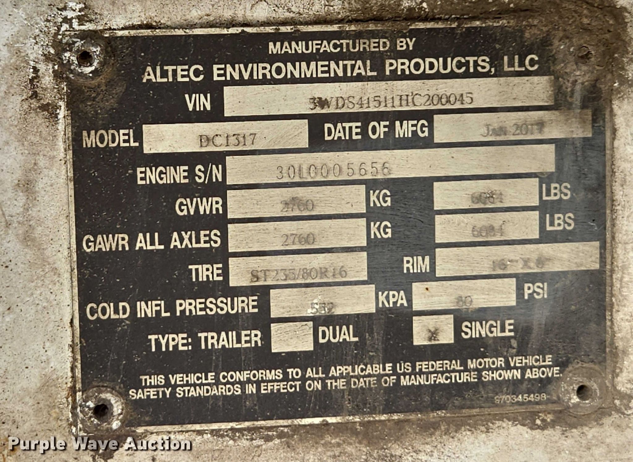 2017 Altec DC 1317 wood chipper. Hours: 760 on meter, VIN: 5WDS41511HC200045, Unit #: 65474855. Engine PSI, Serial: 3.OL0005656, Displacement: 3.0L, Cylinders: 4, Fuel type: Gas. Features Capacity: 62", Throat opening: 17" x 16", Cutting head diameter: 6". Tires Size: ST235/80R16. Trailer Hitch: Pintle, Ball hitch size: 2 5/16", Suspension: Spring, Axles: Single, GVWR: 6,084 lbs. Notes Dead battery, Non-operational unit. Fleet inventory reduction, stored at a secured facility. Please review REQUIRED REMOVAL INSTRUCTIONS. Titles will be distributed after confirmation of payment and removal. Oregon title. Title distribution may be delayed up to 30 days from verification of funds. Fleet Reduction. 3333 North Railroad Avenue. Pasco, WA 99301