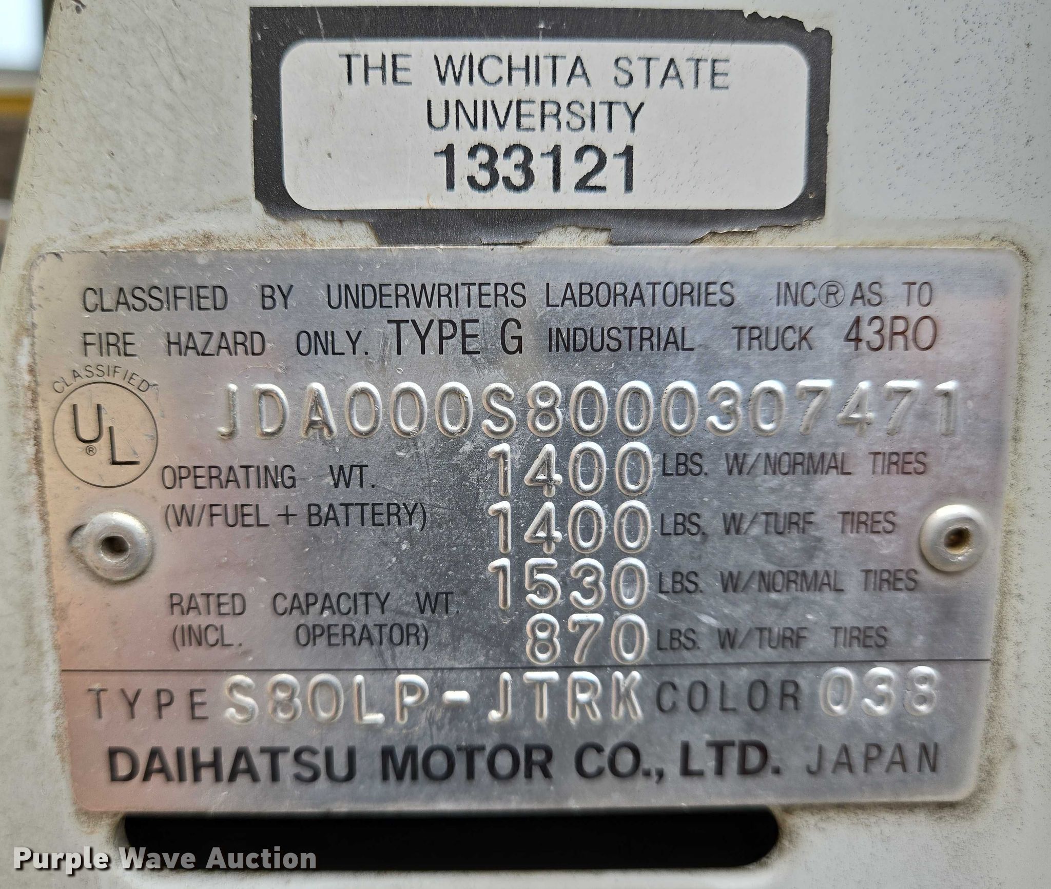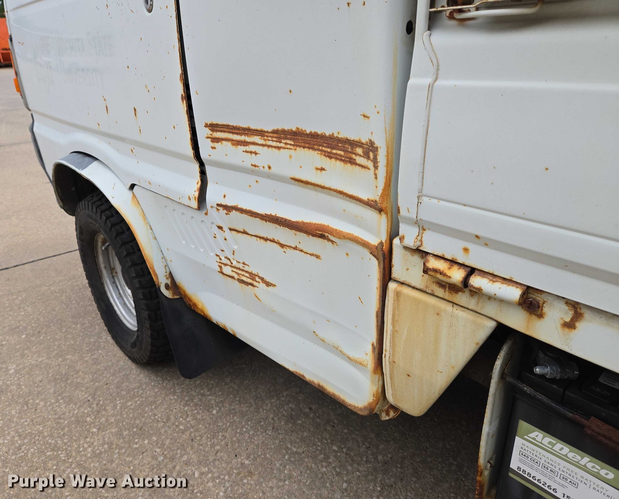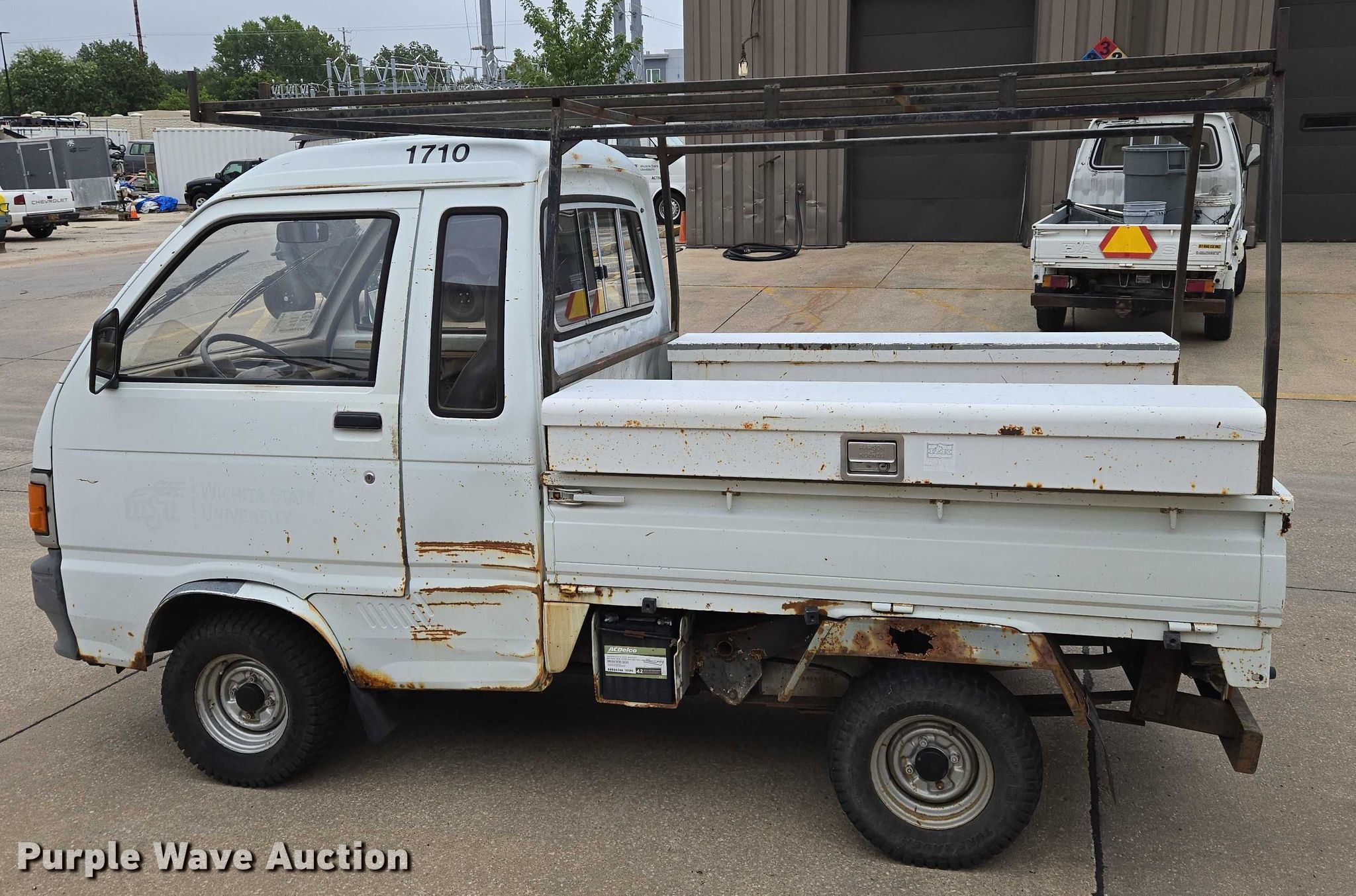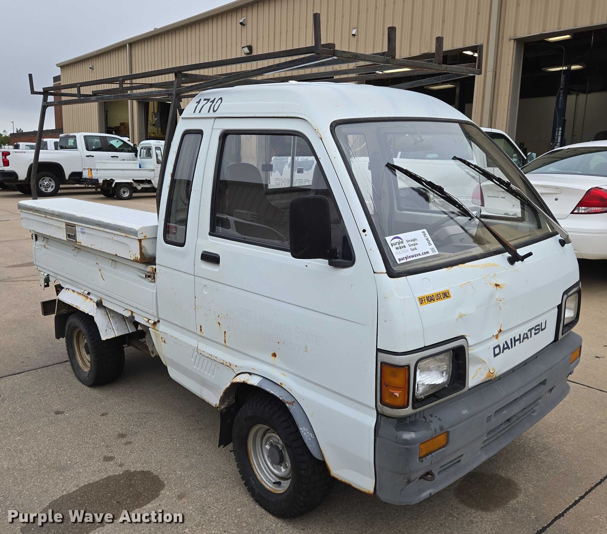 1992 Daihatsu S80LP-JTRK mini truck. Miles: 55,560 on odometer, VIN: JDA000S8000307471. Engine Cylinders: 3, Fuel type: Gas. Transmission Manual, Speed: 3. Operators station Enclosed cab, Heat. Features Bed 66" L x 54" W. Tires Size: 20x8.00-10. Kansas non-highway not intend for road use title. Title distribution may be delayed up to 14 days from verification of funds. Wichita State University. Wichita, KS 67260