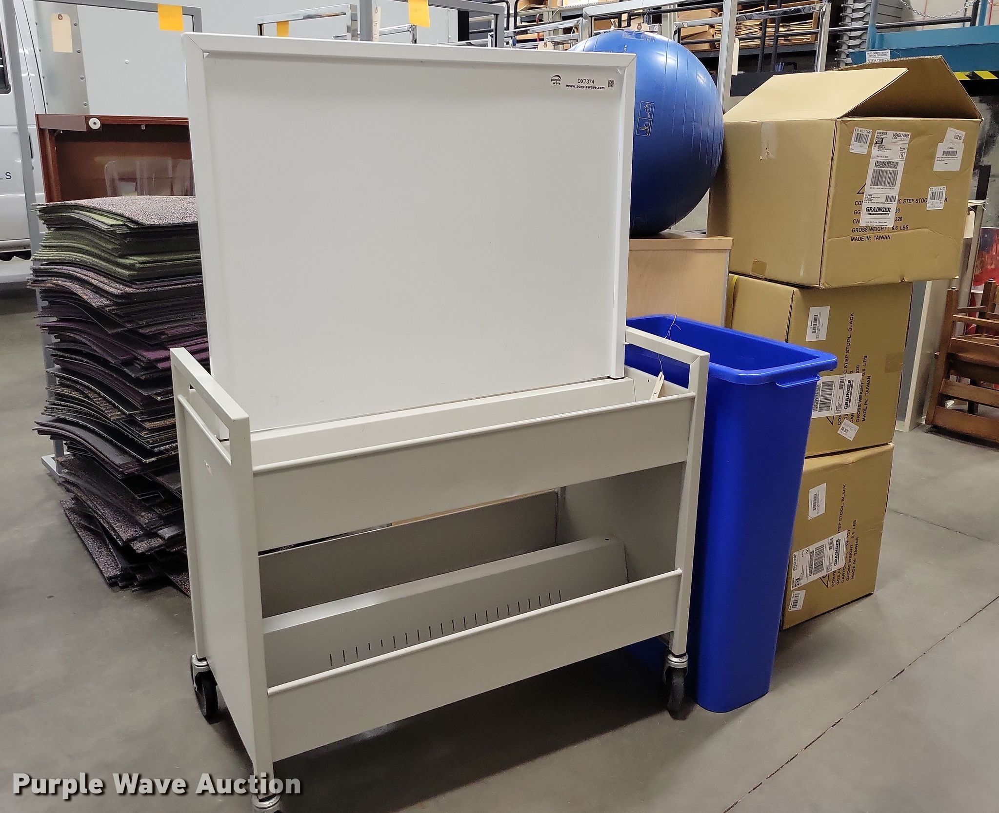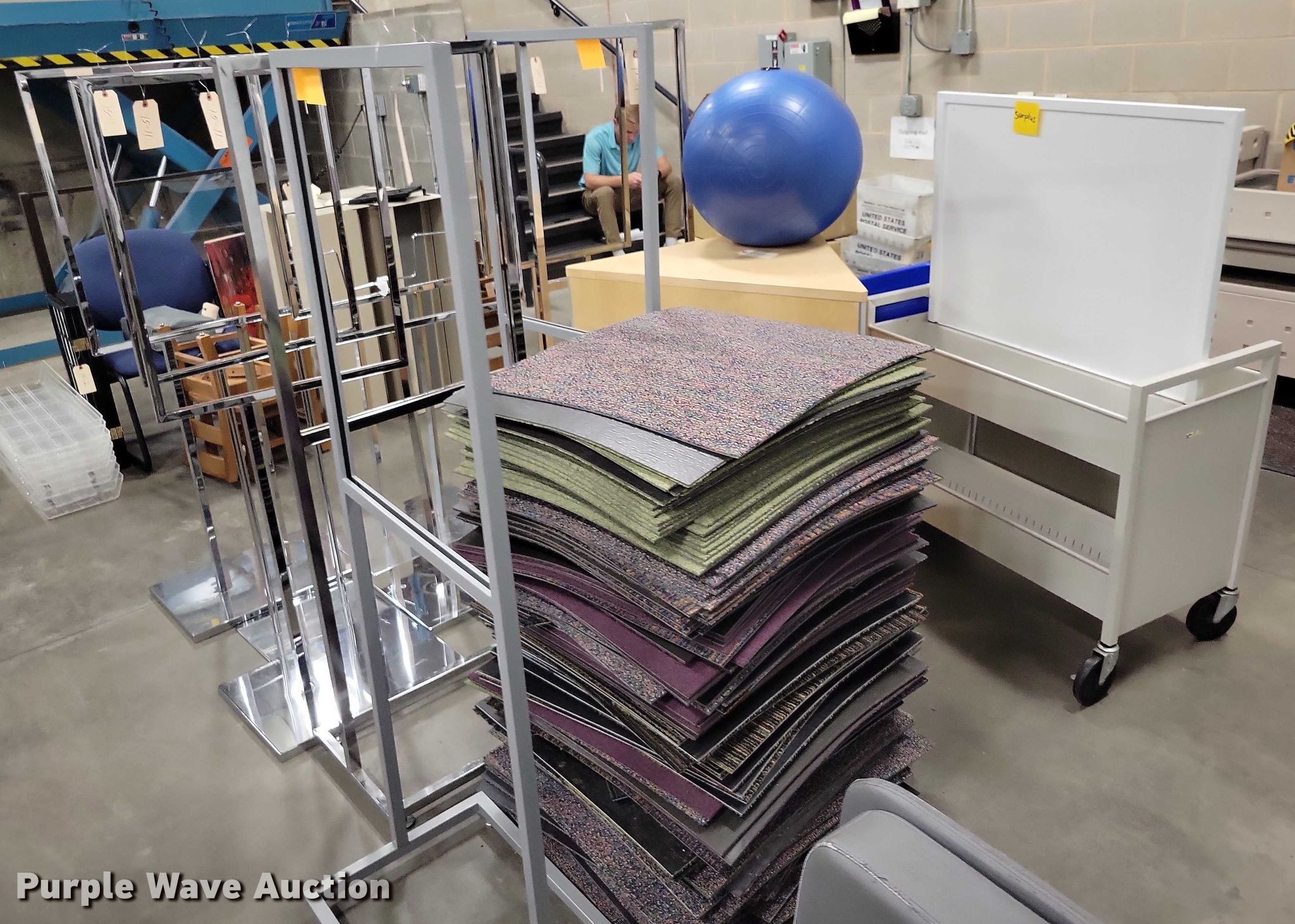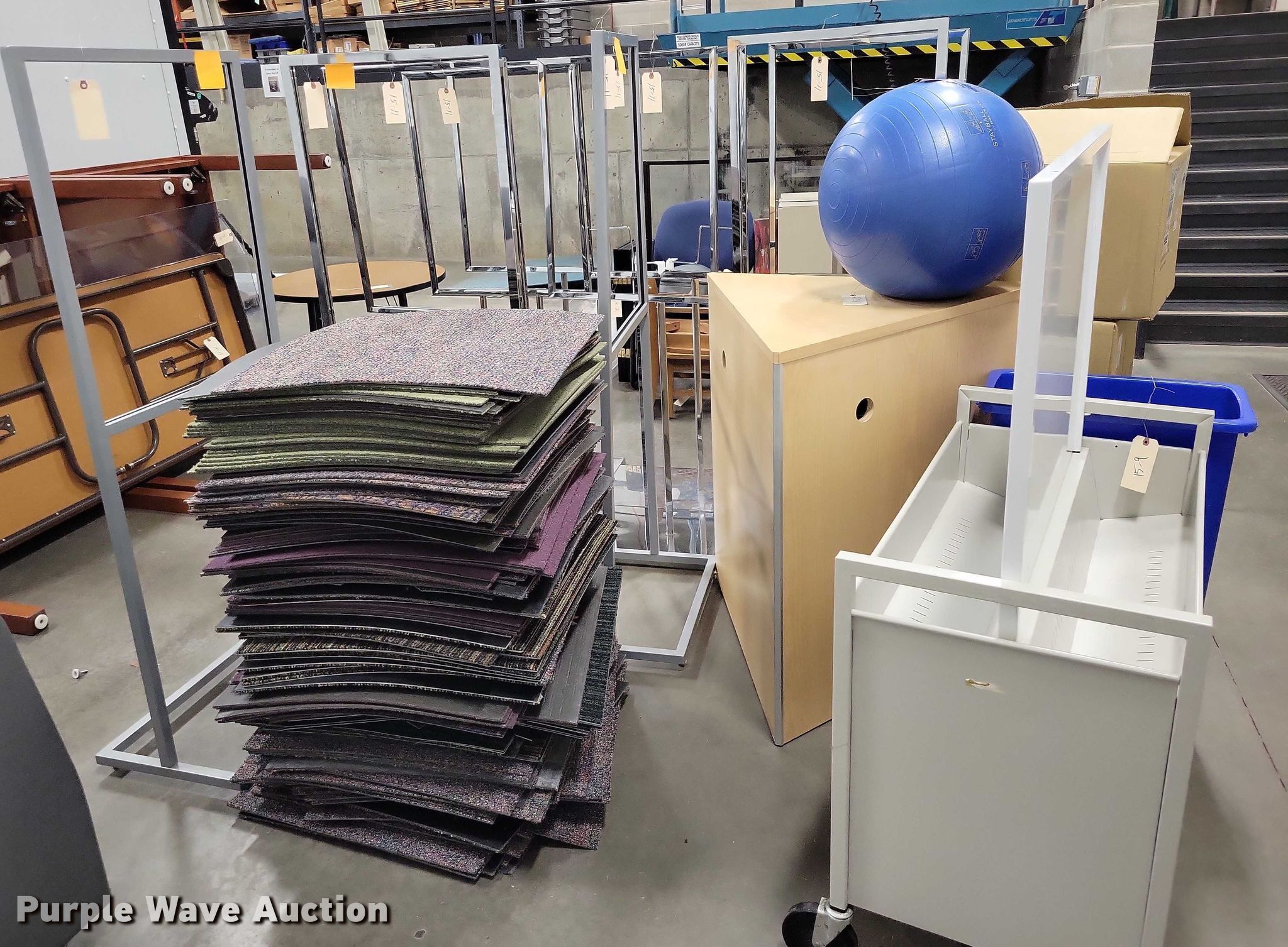 Purple Wave is selling a used Furniture in South Dakota. This item is a Furniture with the following: Unit #: 15-9, 15-14, 15-11, 15-12, 15-15, 15-13, Carpet squares, Rolling marker board, Recycle bin, Ball, Wood triangle display stand, (3) step stools, (10) Metal poster holders