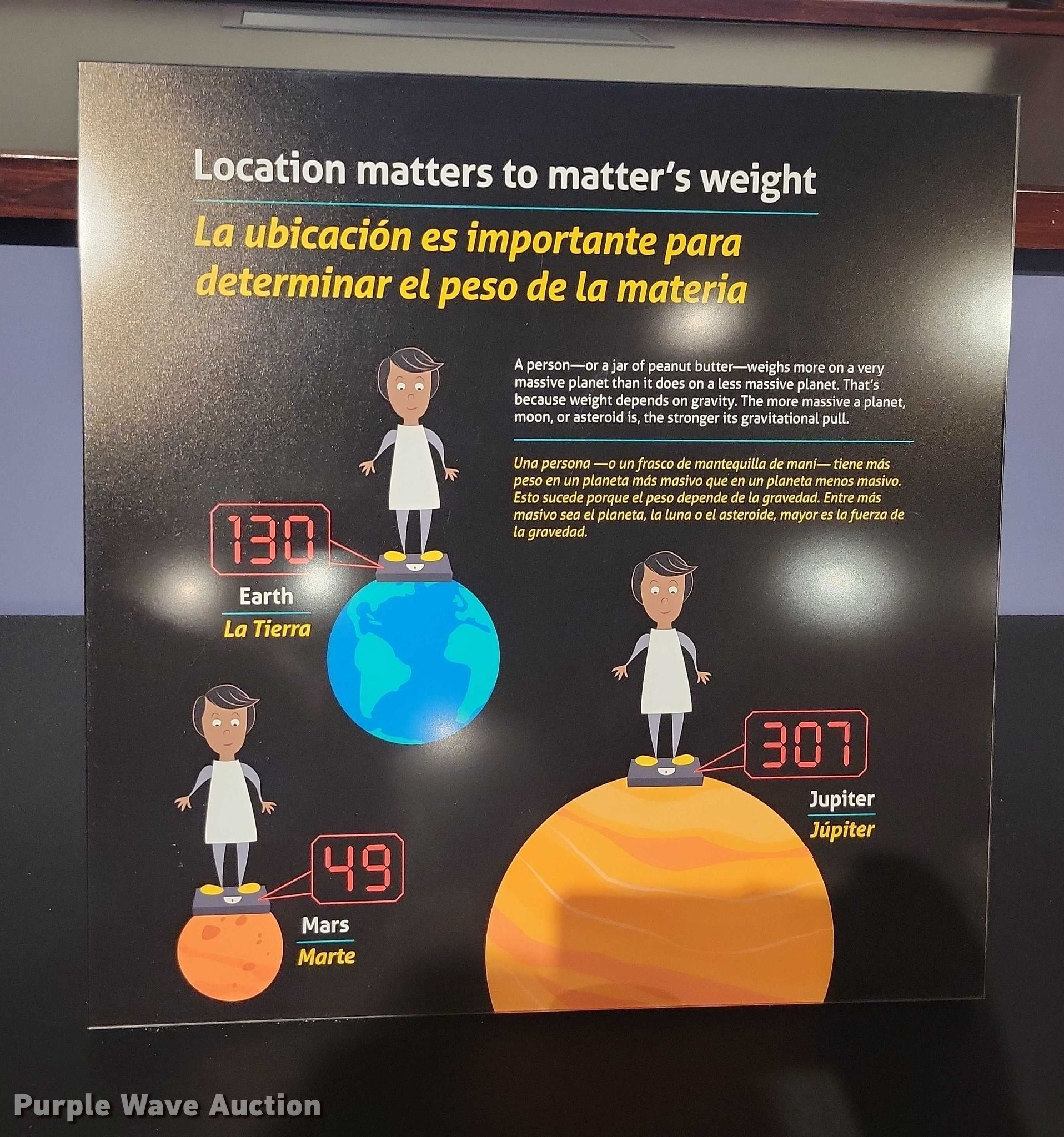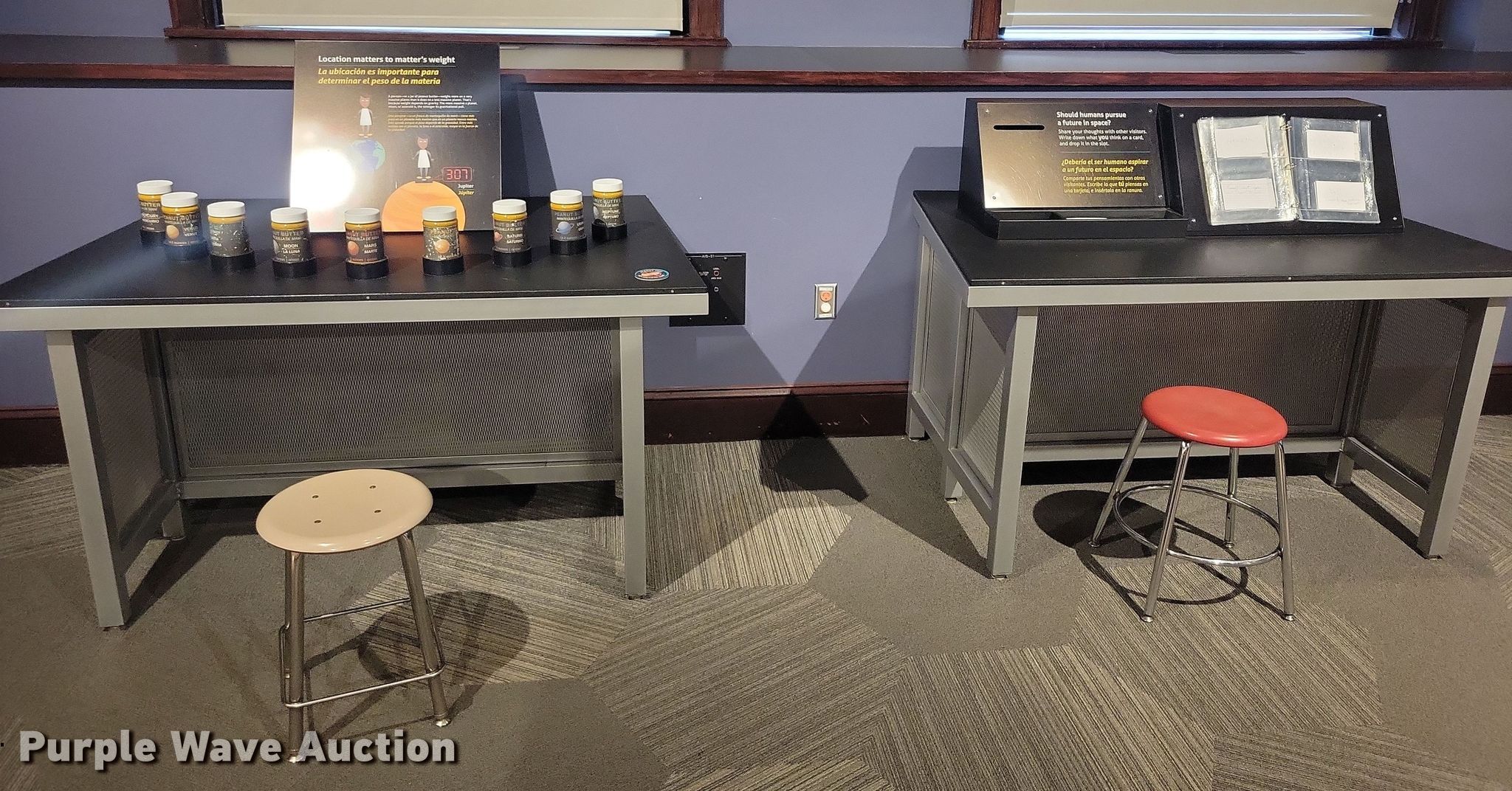 Purple Wave is selling a used Furniture in South Dakota. This item is a Space display exhibit with the following: Unit #: 25-3, (3) tables, Weight, Future in space, Weightless