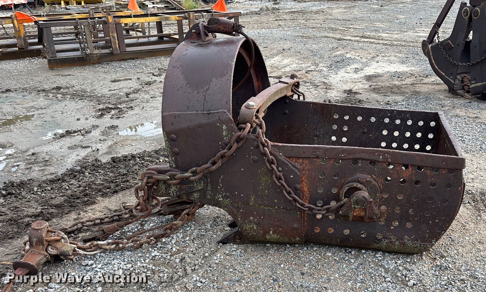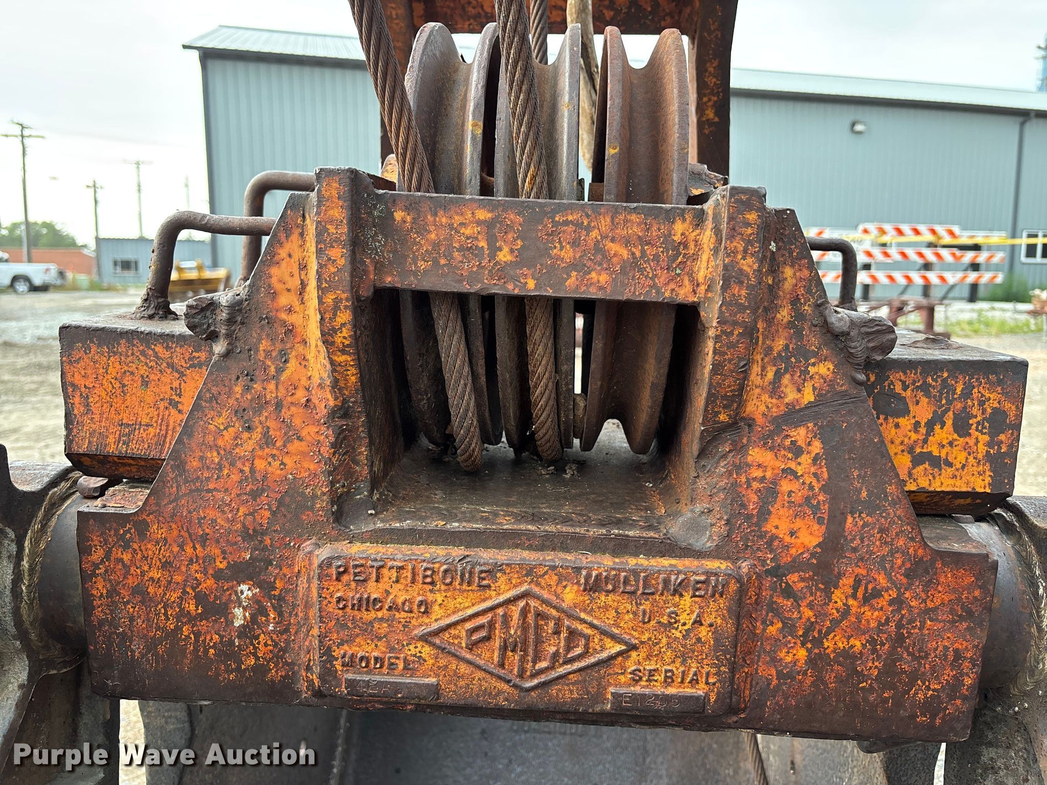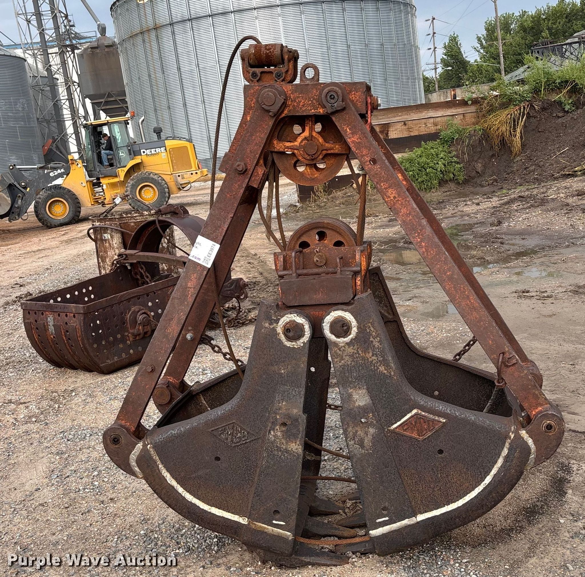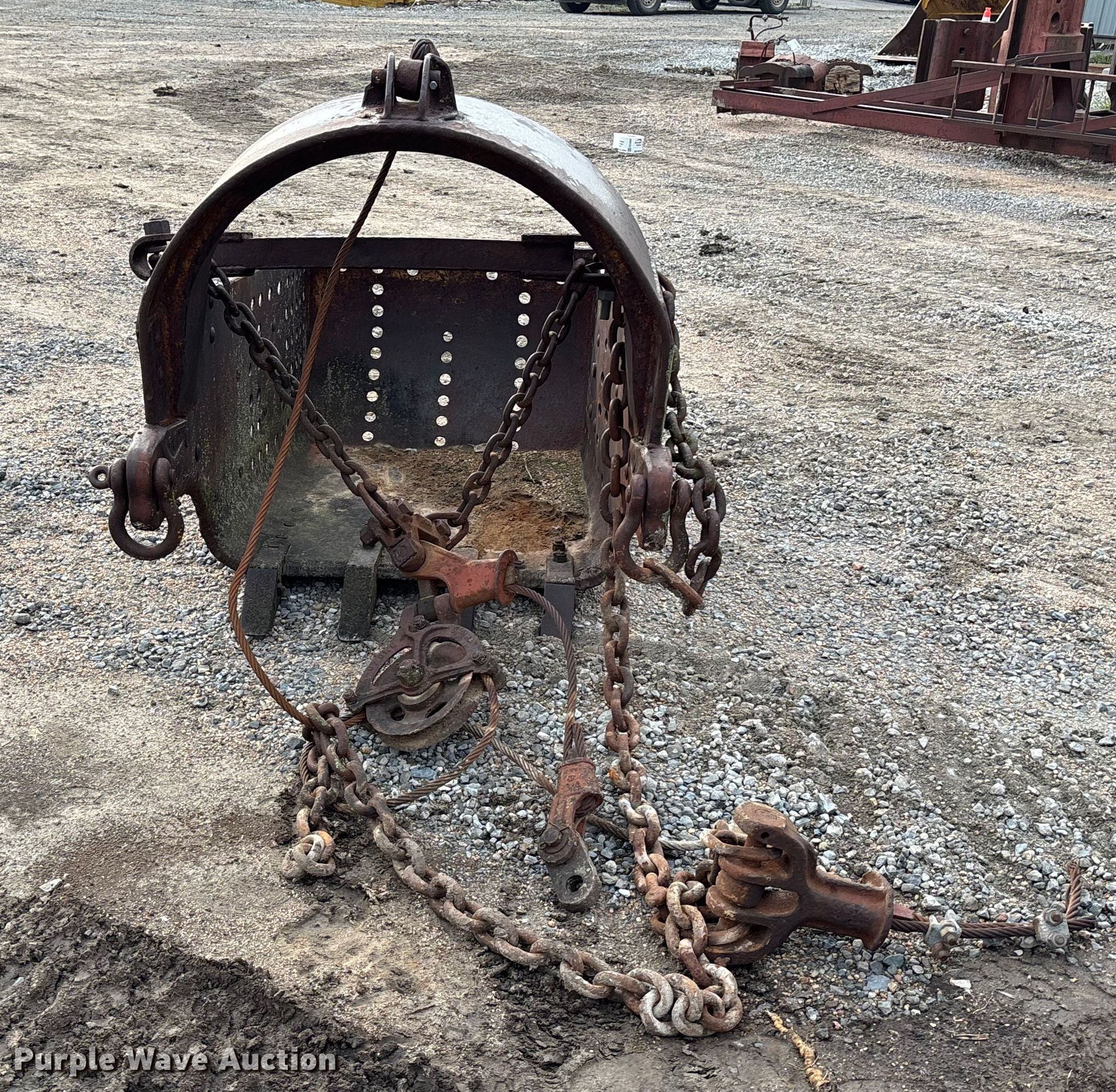 Purple Wave is selling a used Crane Attach. in Nebraska. This item is a (2) crane buckets with the following: Pettibone Muliken 4EA clamshell bucket, Serial: E1205, Width 30", Teeth: 6, Pins, Drake Williams Mount Company drag line bucket, Serial: 11637, Capacity: 3 yd
