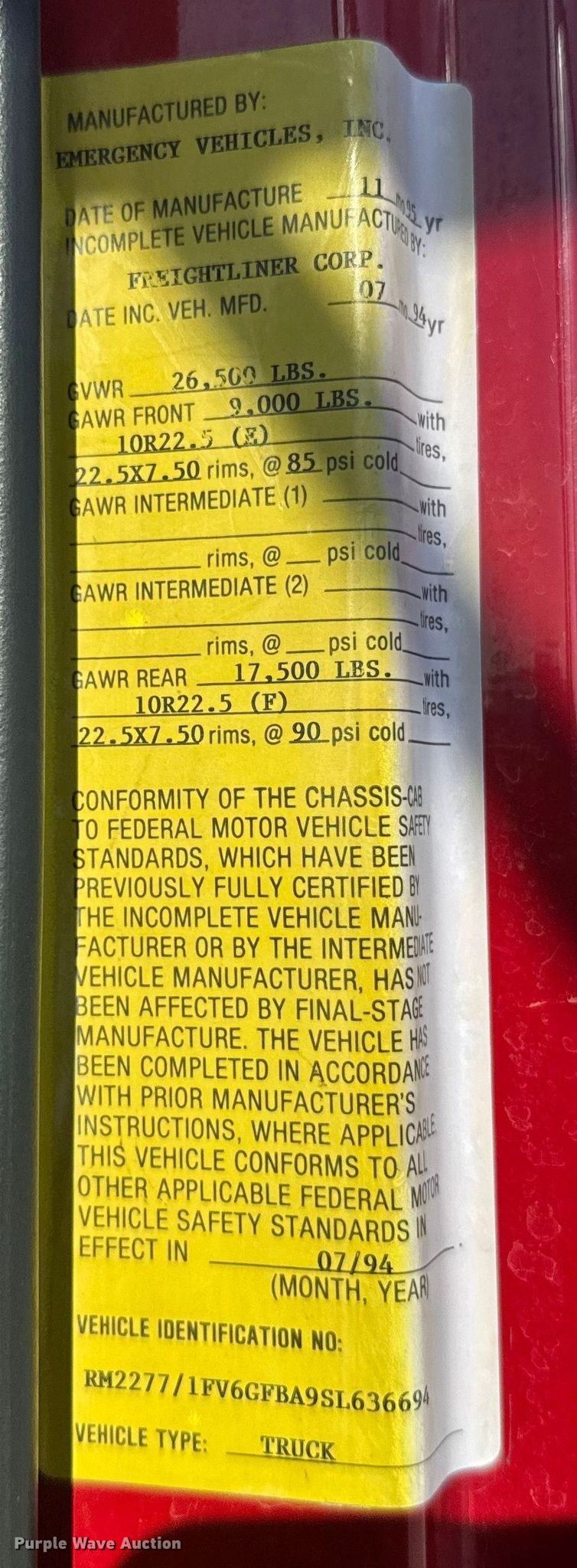 1995 Freightliner FL60 rescue vehicle. Miles: 6,422 on odometer, Hours: 3,625 on meter, VIN: 1FV6GFBA9SL636694. Engine Displacement: 5.9L, Cylinders: 6, Fuel type: Diesel. Transmission Automatic. Chassis Axles: Single, Suspension: Spring, Brakes: Air, GVWR: 26,500 lbs. Interior AC, Heat, Auxiliary controls. Features Fire truck body Emergency Vehicles, PA/ siren controls. Tires Size: 295/75R22.5. Kansas title. Title distribution may be delayed up to 14 days from verification of funds. McPherson, KS 67464