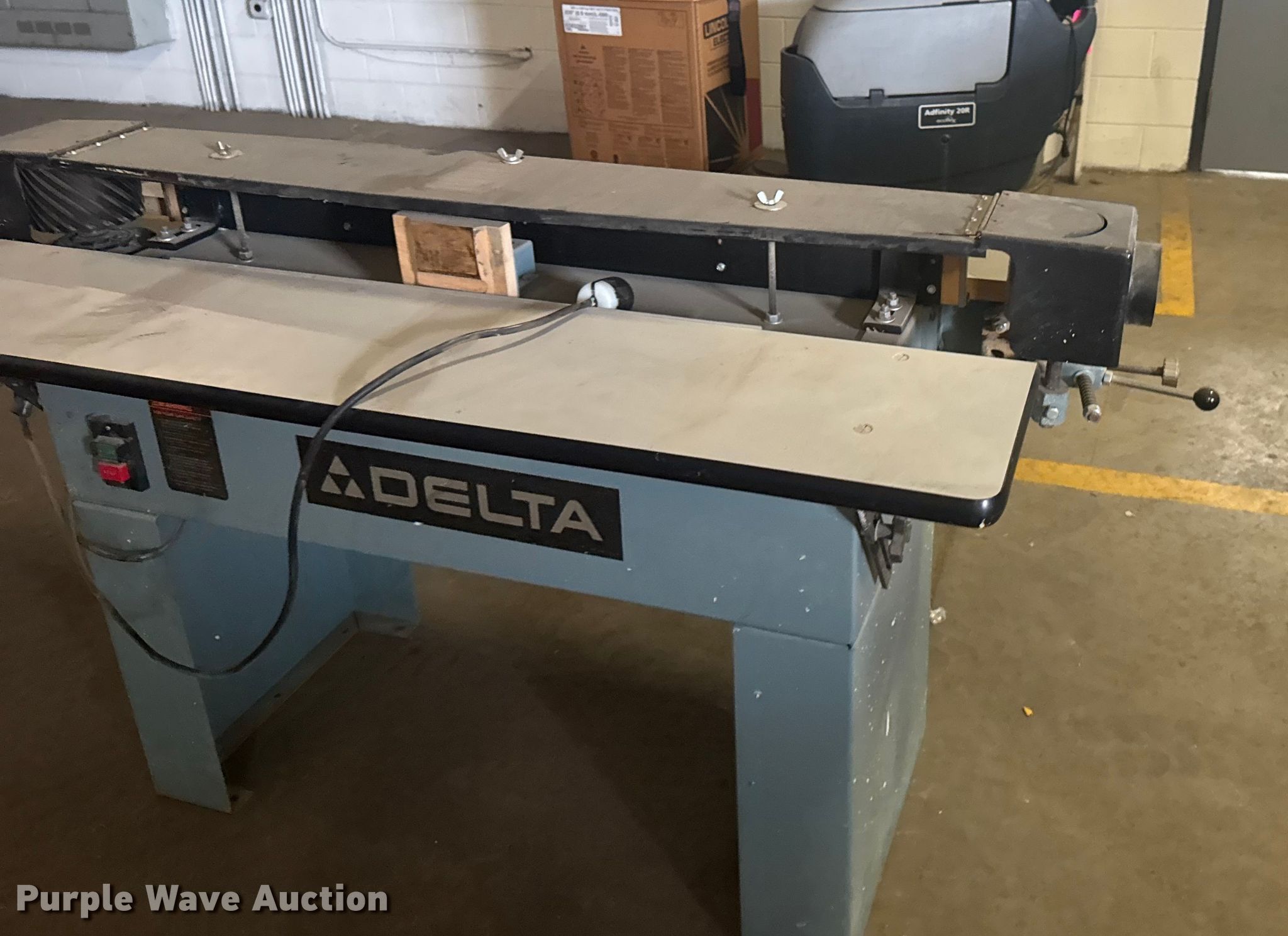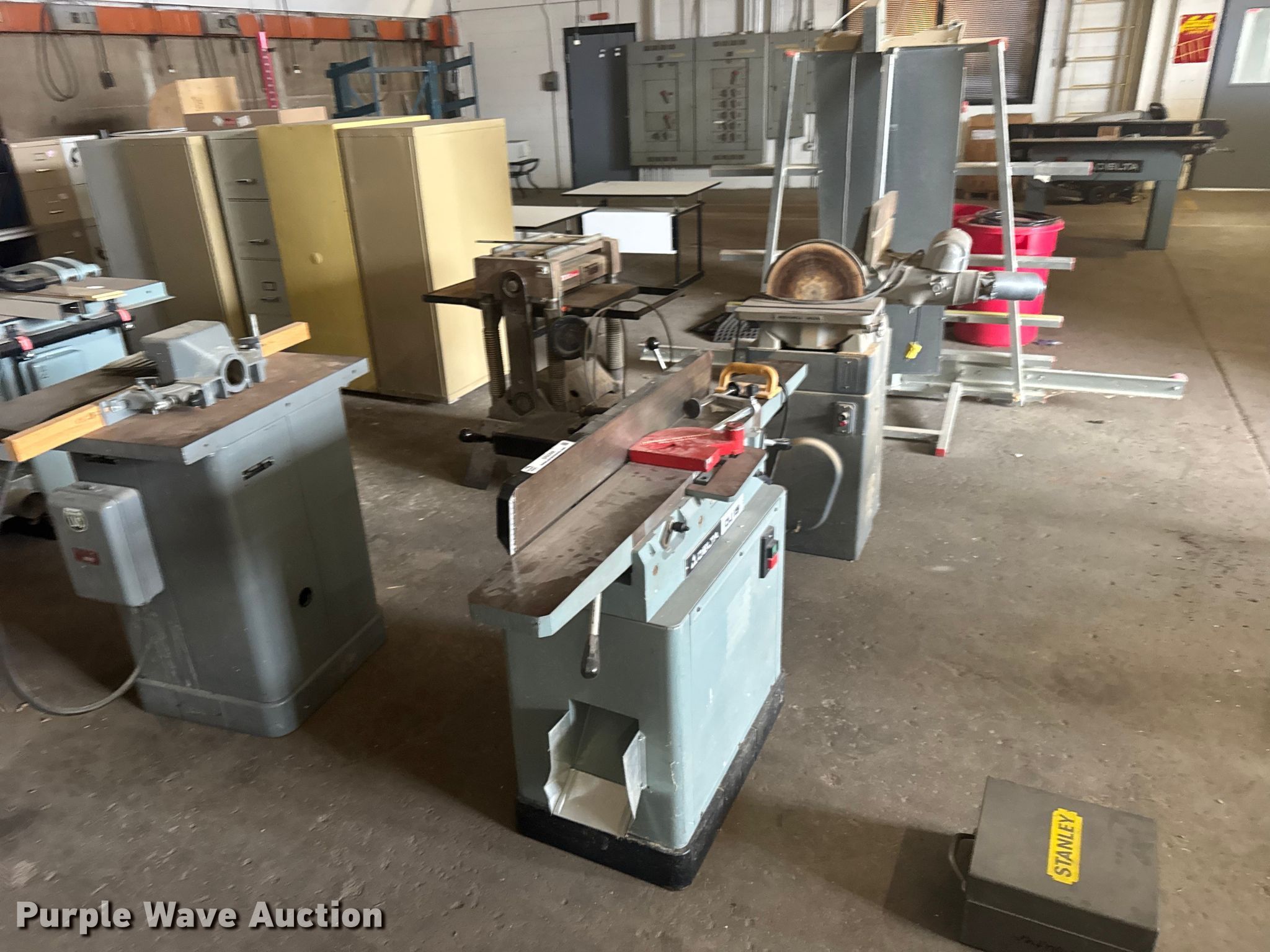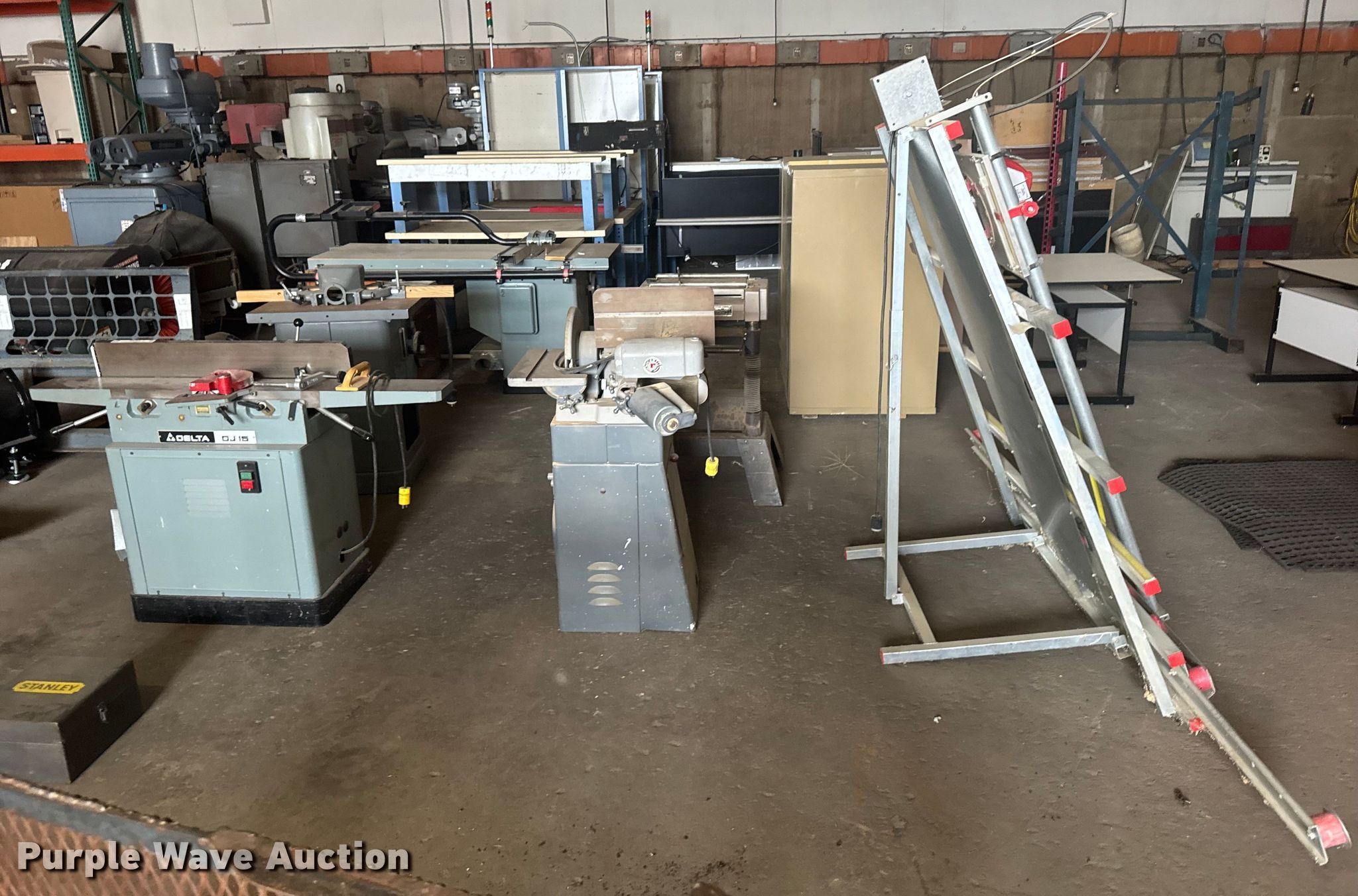 Purple Wave is selling a used Tools in Kansas. This item is a Tools with the following: Delta DJ15 jointer, Rockwell disc sander, Makita planer, Rockwell table router, Delta Unisaw 10" Tilting Arbor Saw table saw, Panel saw, Stanley router and more