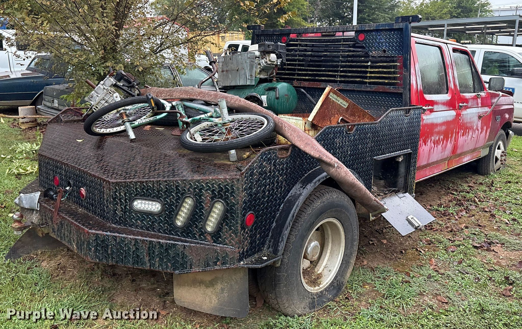 This 1993 Ford F350 Crew Cab flatbed pickup truck will sell to the highest bidder regardless of price.