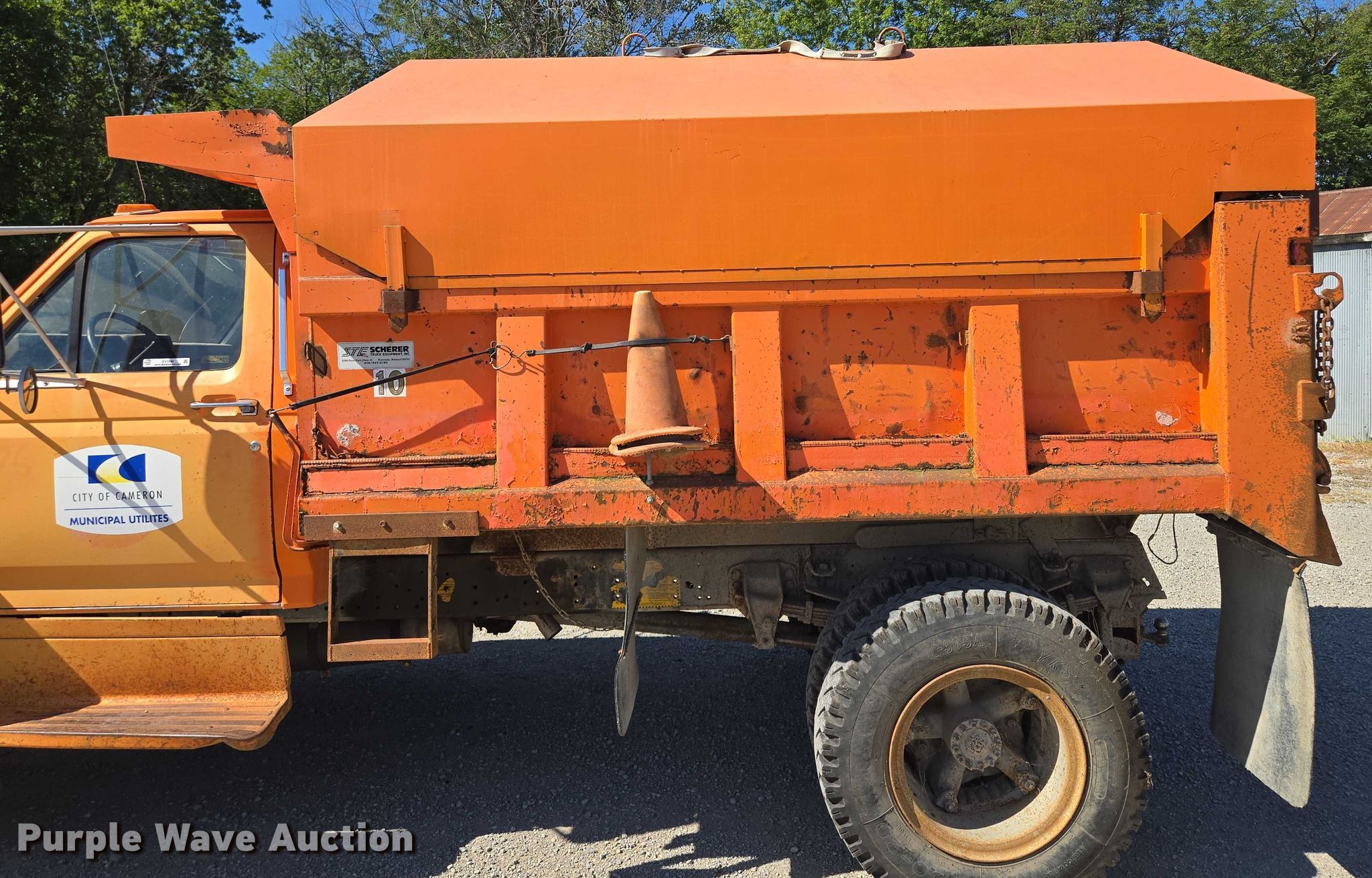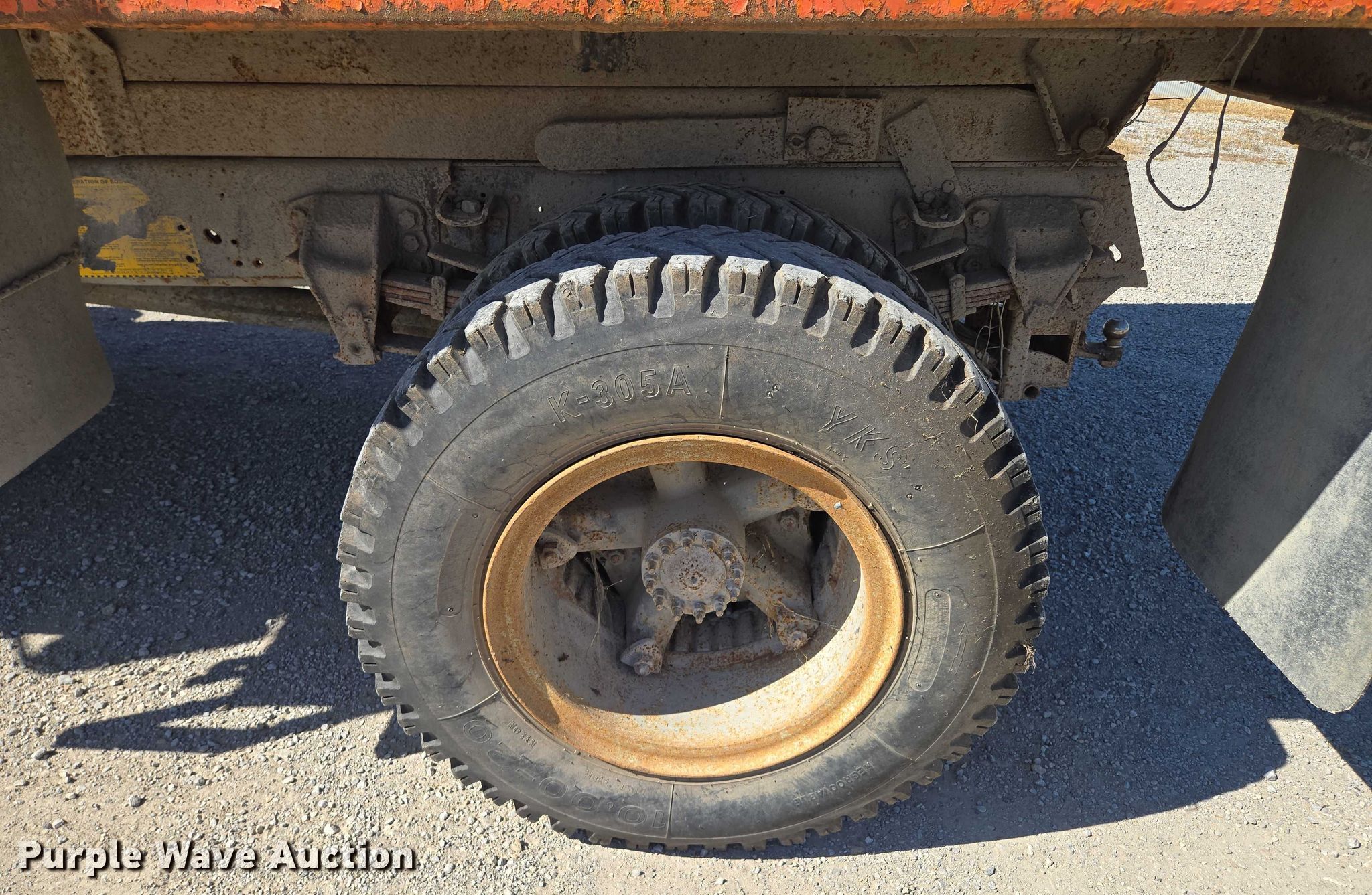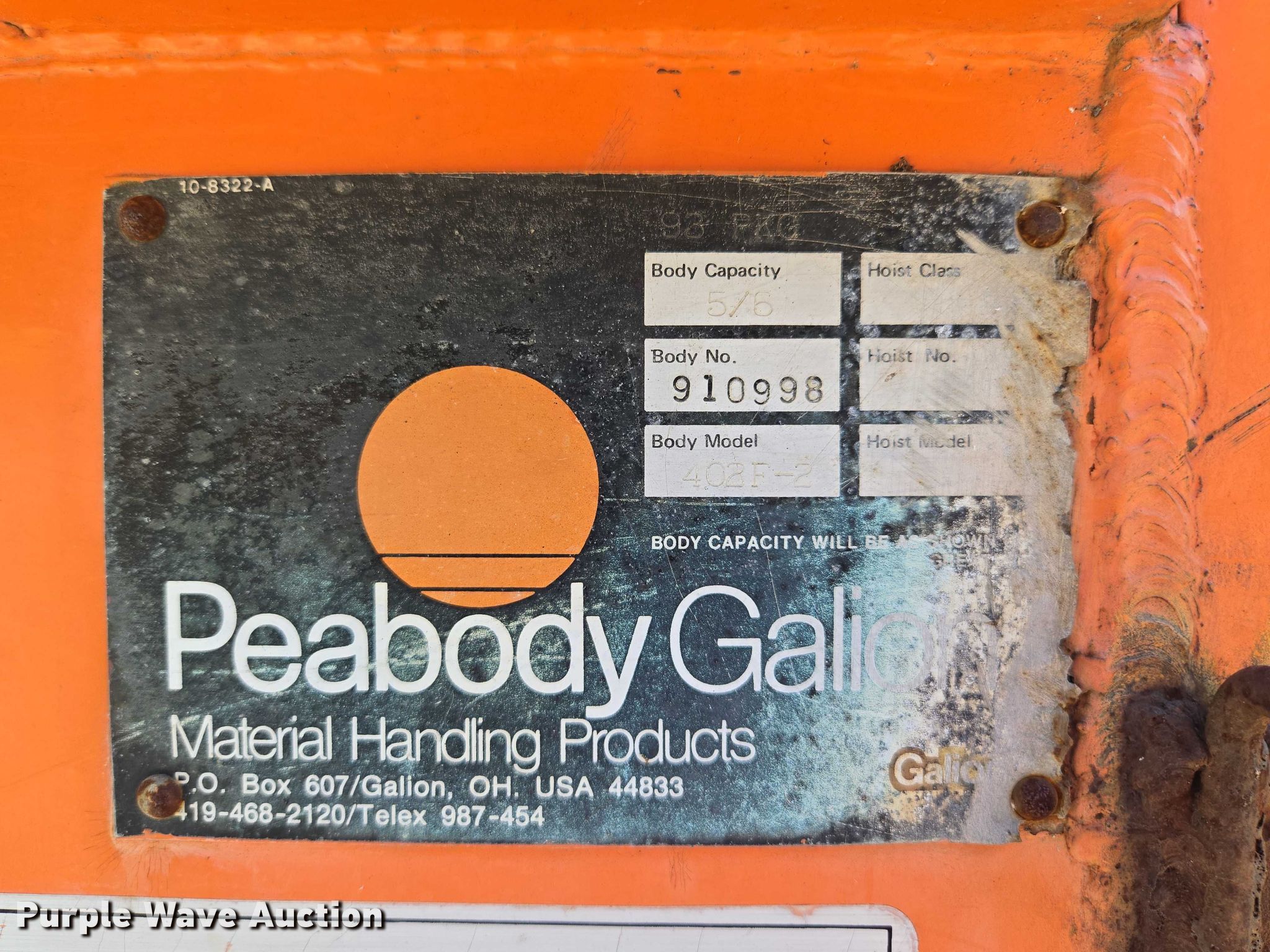 1987 Ford F700 dump truck. Miles: 52,225 on odometer, VIN: 1FDPF70K9HVA20457. Engine Lima, Displacement: 7.0L, Cylinders: 8, Fuel type: Gas. Transmission Manual, Speed: 5. Chassis Axles: Single, Suspension: Spring, Brakes: Hydraulic, PTO, GVWR: 26,500 lbs, Wheelbase: 153". Interior Heat. Features Bed Chip bed, Peabody Galion 402F-2, Serial: 910998, Length: 10', Width: 96", Side height: 48", Bed type: Steel, Ram: Single, End gate: Air operated. Tires Size: 10.00-20. Notes Jump start required during on-site data collection, Clutch issues, may need replaced. Missouri title. Title distribution may be delayed up to 14 days from verification of funds. City of Cameron, MO. Cameron, MO 64429